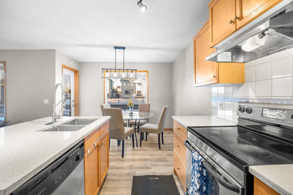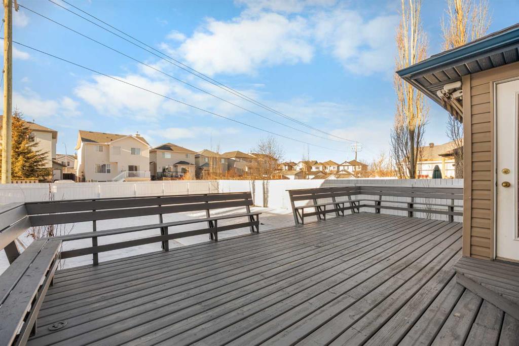 The main floor is welcomed by a foyer and vinyl plank flooring throughout, leading into a spacious open-concept layout. The Living room is anchored by a cozy gas fireplace, while the Kitchen is thoughtfully designed with quartz countertops, stainless steel appliances, and a centre island with breakfast bar. Adjacent to the Kitchen, the Dining area opens onto a full-width deck with built-in wraparound bench seating, overlooking a fully fenced and landscaped backyard with back-lane access — perfect for outdoor gatherings. A powder room and double attached garage complete the main level.