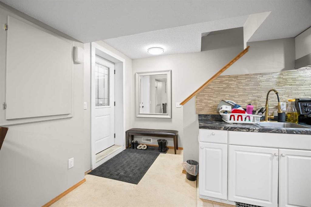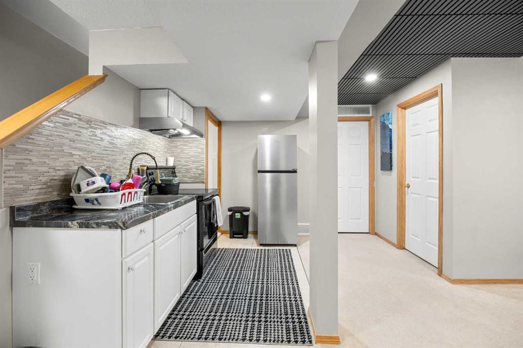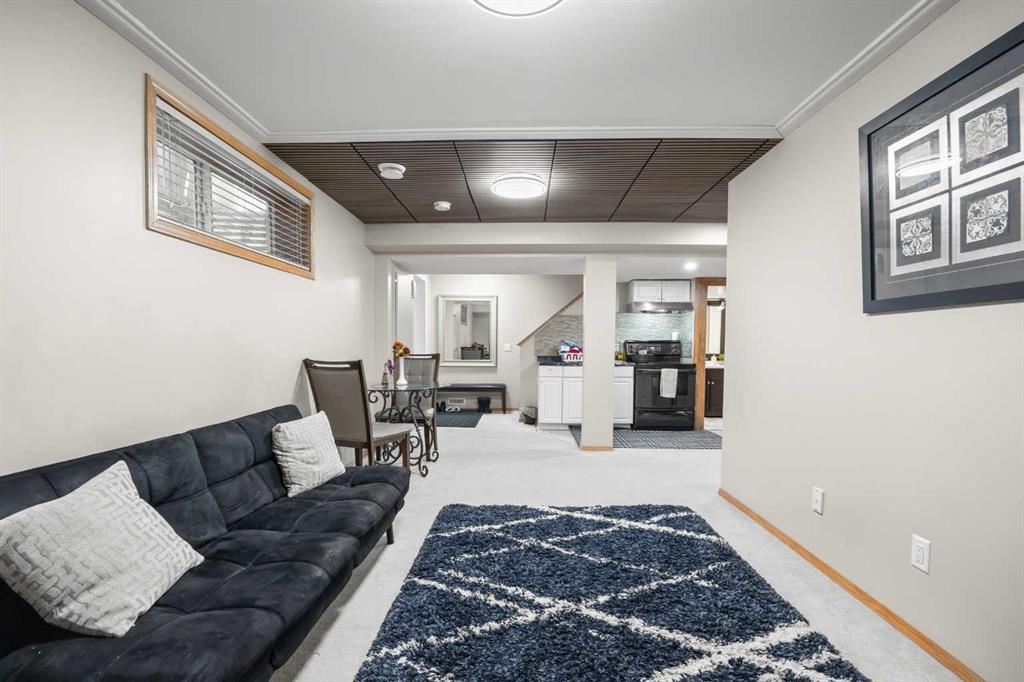 The legal walk-up basement suite offers its own covered front entrance, a spacious living and dining area, functional kitchen, one well-sized bedroom, a full bathroom, and second laundry, providing excellent privacy and strong rental potential.
