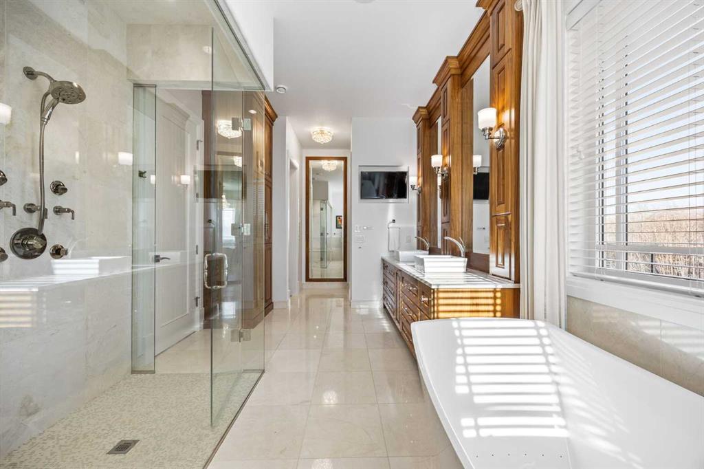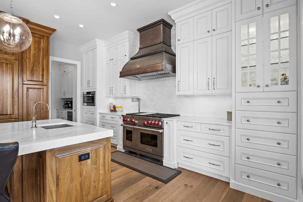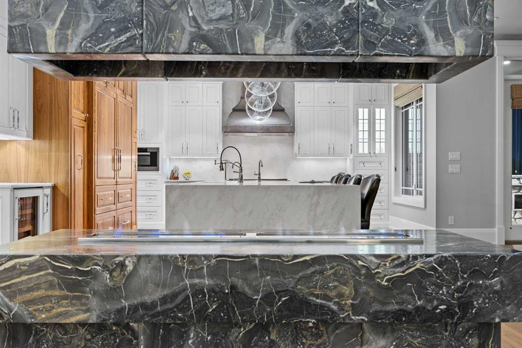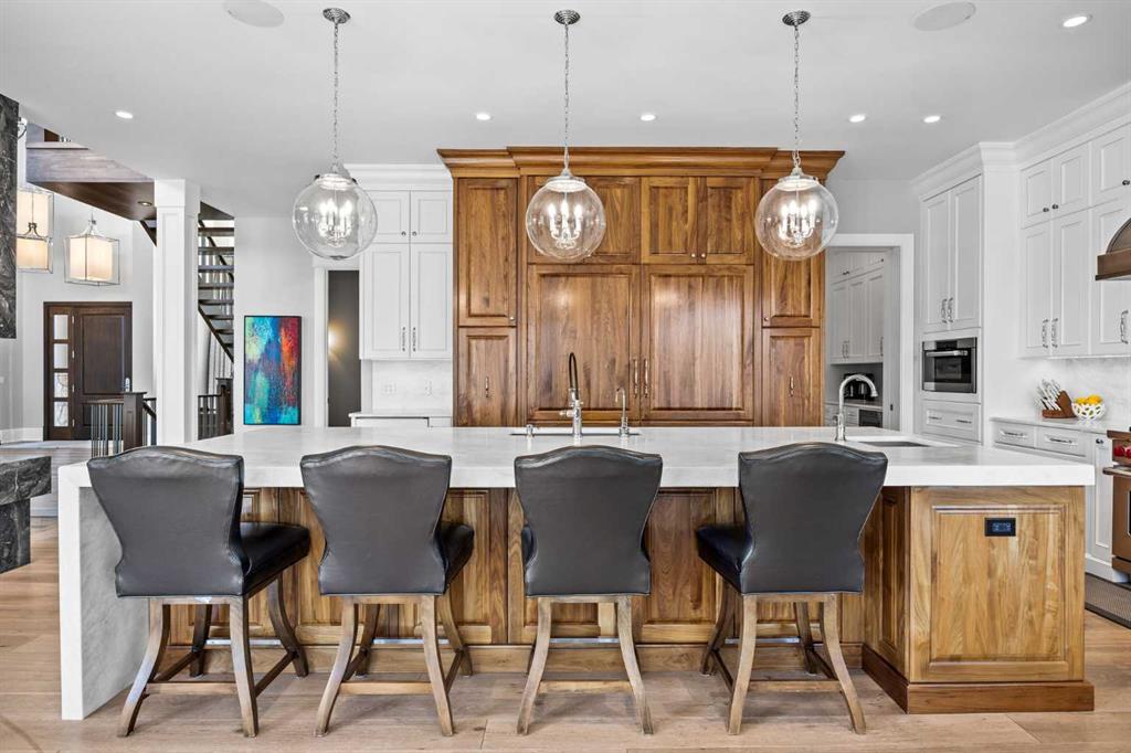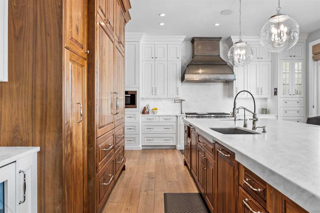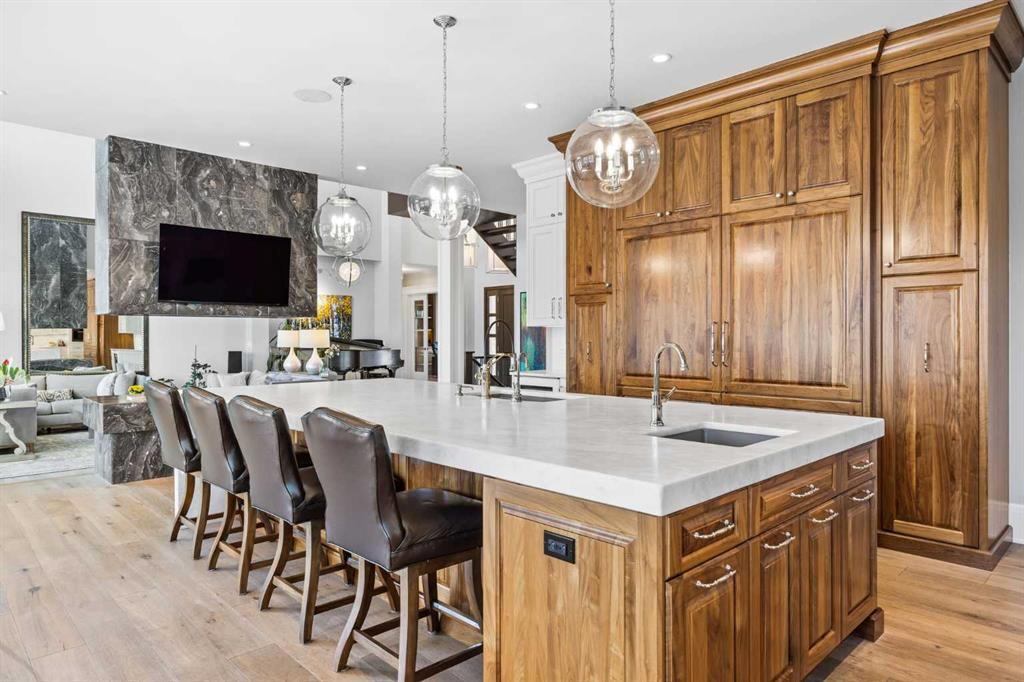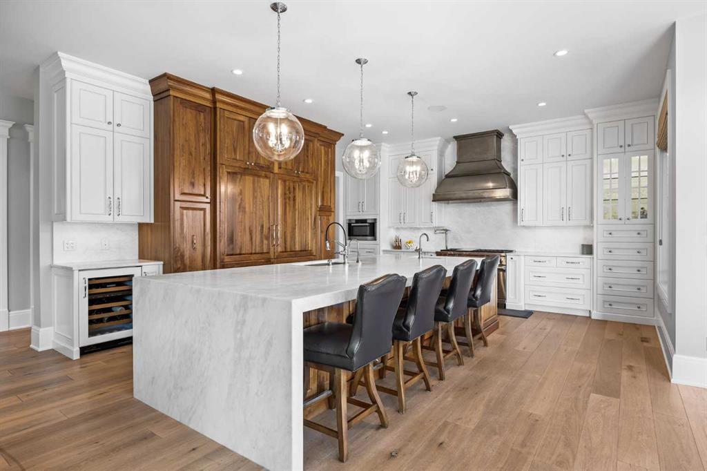 The kitchen is a true centrepiece. Fully custom and built to perform, it features dual Sub-Zero fridge/freezer combinations, a Wolf range, steam oven, bar fridge, and a statement Hammersmith hood fan. A massive island invites gathering, while a walk-through pantry and an exceptional mudroom with built-in dog wash and laundry keep everyday life organized behind the scenes.