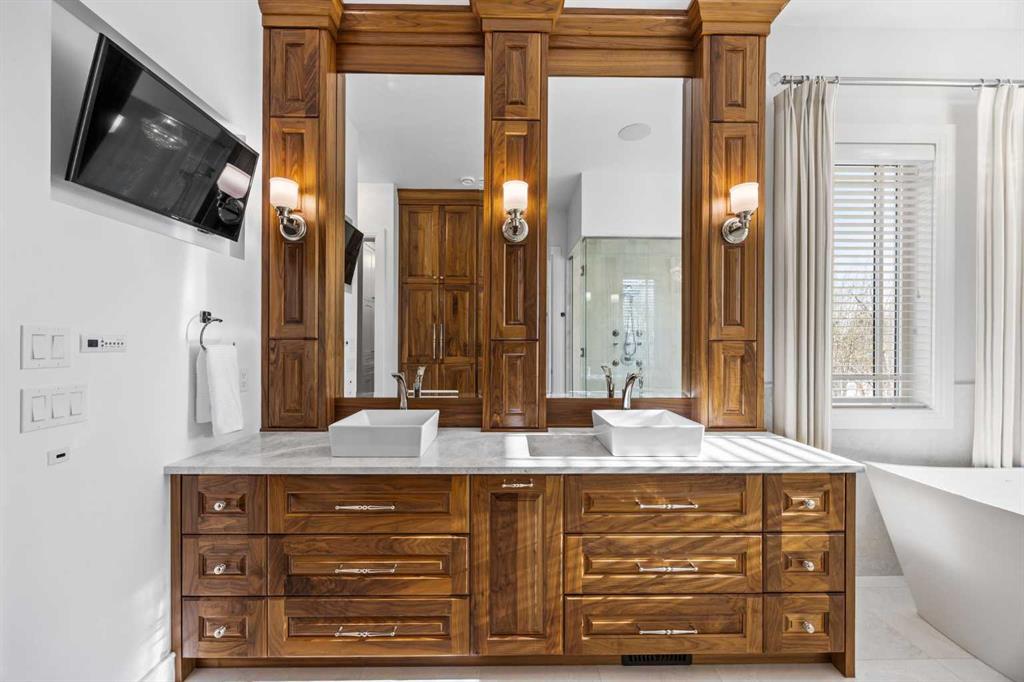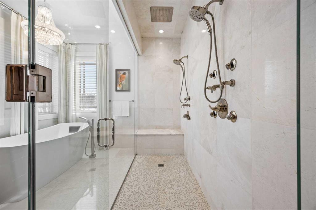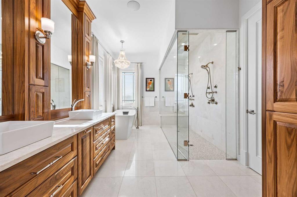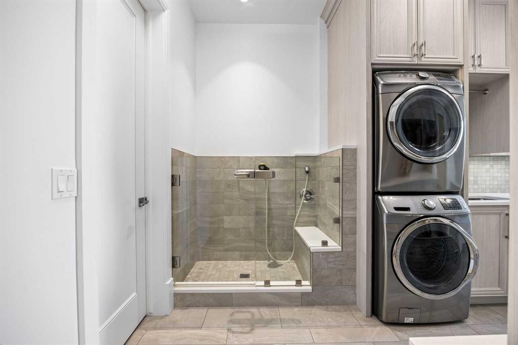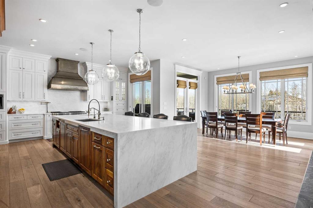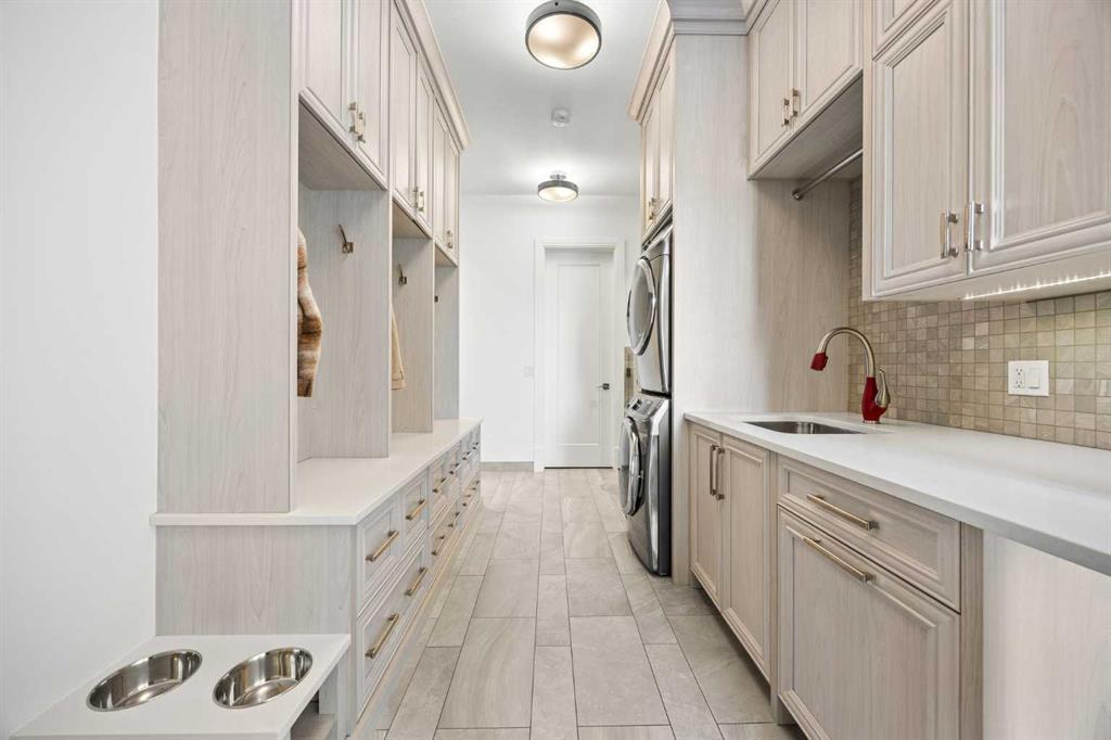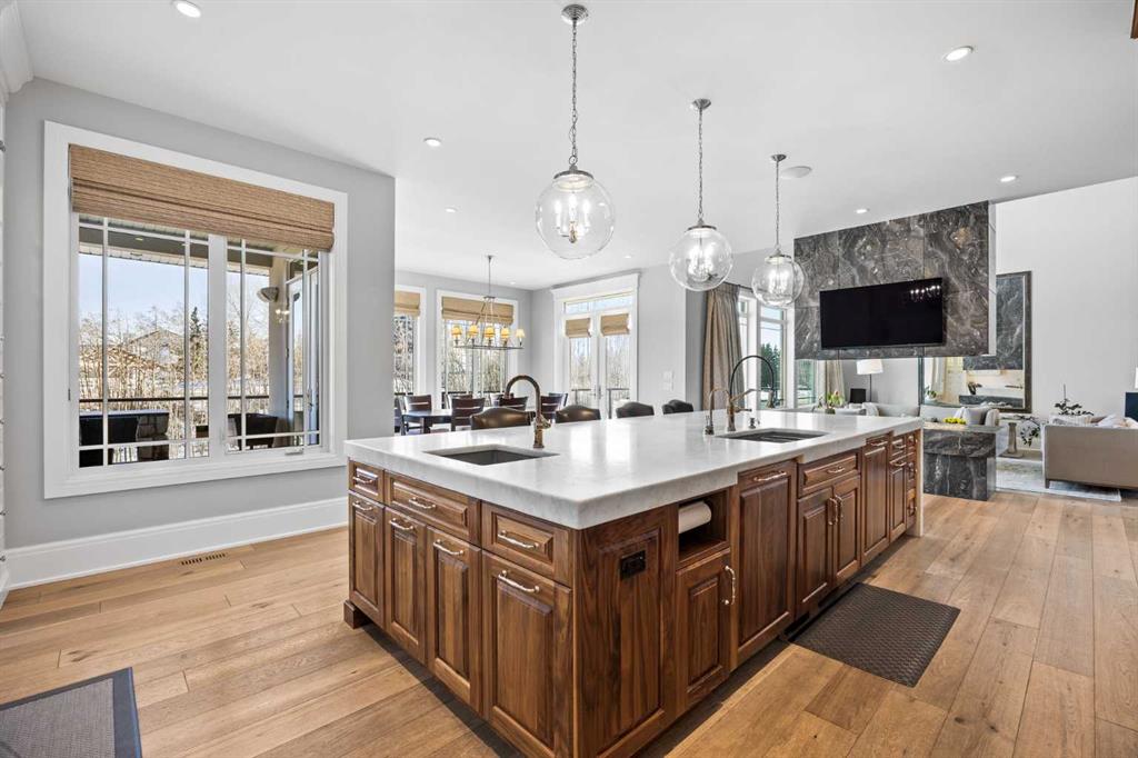 The kitchen is a true centrepiece. Fully custom and built to perform, it features dual Sub-Zero fridge/freezer combinations, a Wolf range, steam oven, bar fridge, and a statement Hammersmith hood fan. A massive island invites gathering, while a walk-through pantry and an exceptional mudroom with built-in dog wash and laundry keep everyday life organized behind the scenes.