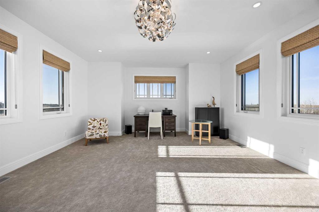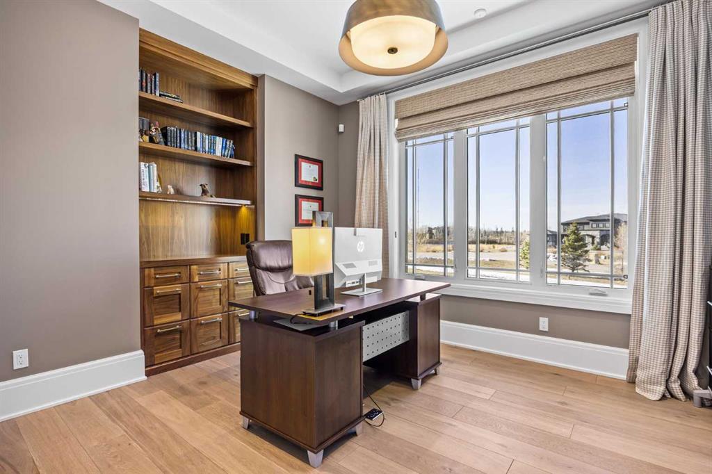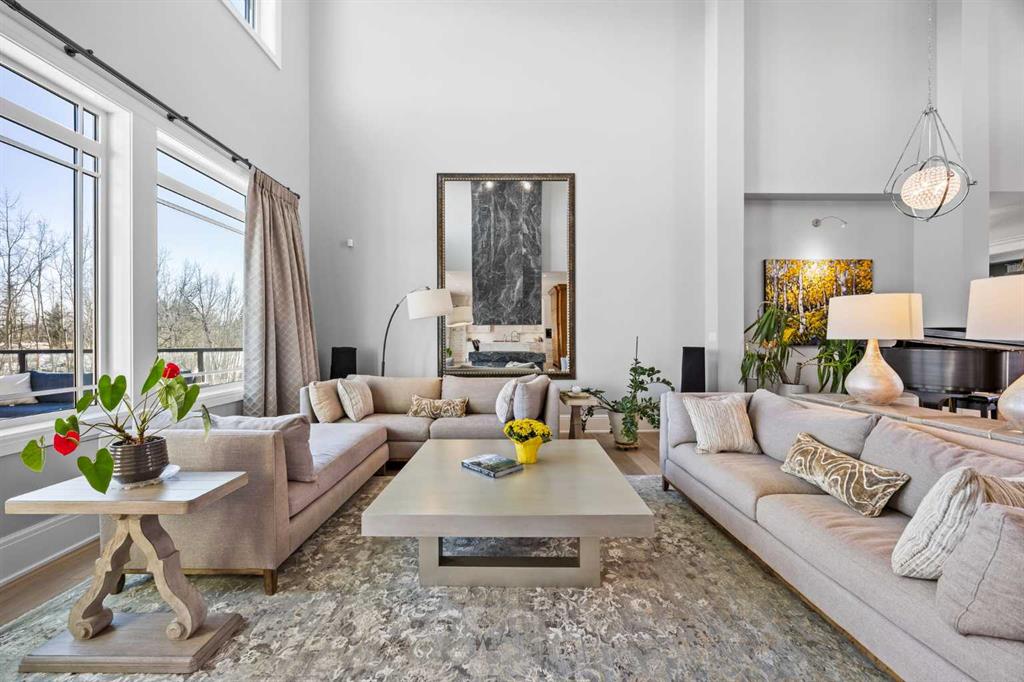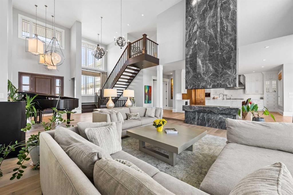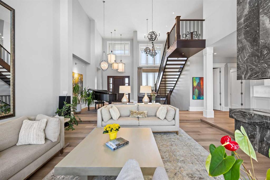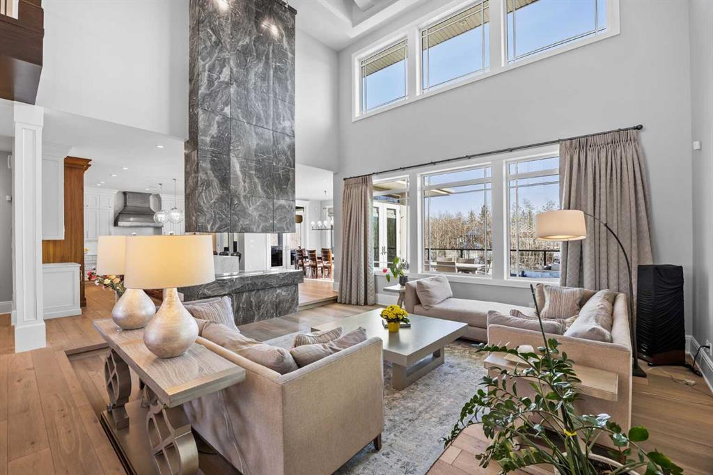 From the moment you step inside, the home makes an impression. Soaring ceilings, expansive windows, and a dramatic floor-to-ceiling feature fireplace anchor the main living space, while natural light pours in from every angle, pulling the outdoors in. The layout flows effortlessly, balancing open-concept living with defined, functional spaces including a main floor office and a private primary retreat.