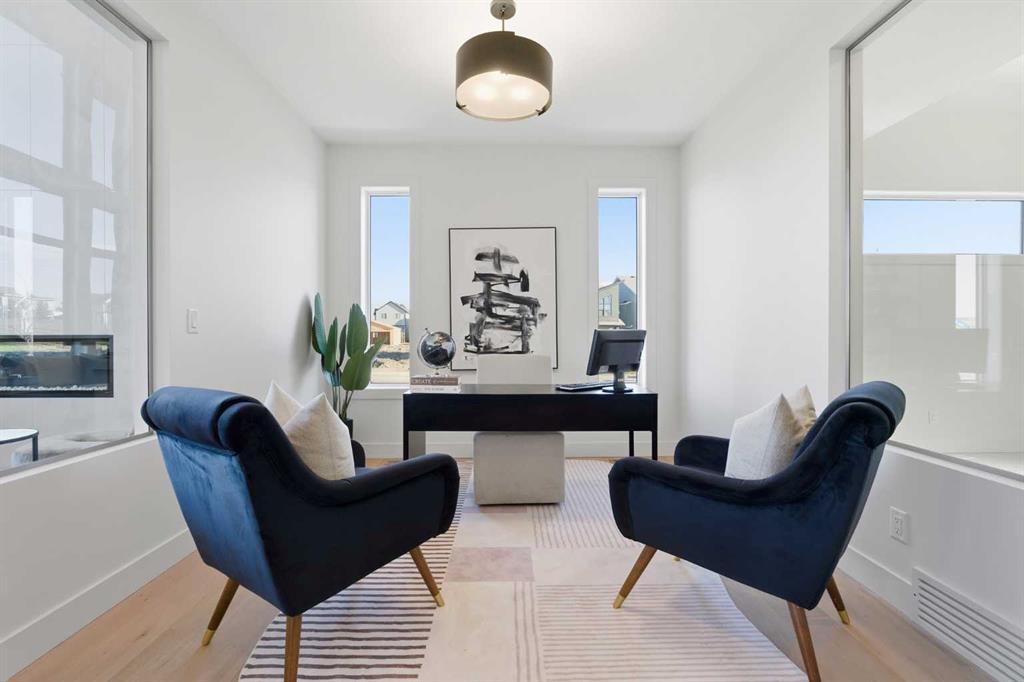 The open-concept main floor flows seamlessly from one space to the next, featuring a versatile flex room with elegant glass accents, perfect for a home office, playroom, or formal sitting area. The chef-inspired kitchen impresses with custom cabinetry, quartz countertops, built-in premium appliances, and a large central island with bar seating. Full-height cabinets and a spacious walk-in pantry combine functionality and style, ideal for any culinary enthusiast. Luxury vinyl plank flooring, designer tilework, and statement lighting enhance every detail, while the open-to-below living room adds a dramatic sense of grandeur, openness, and natural light.