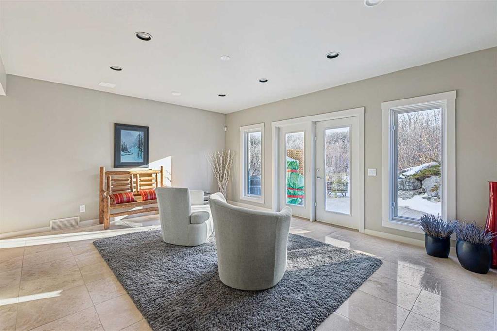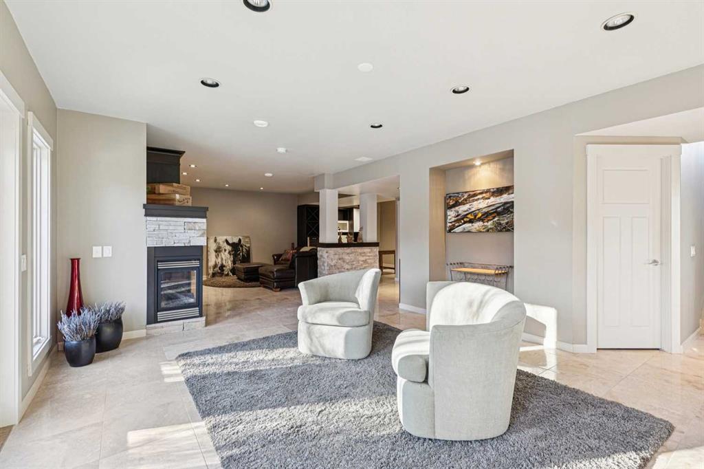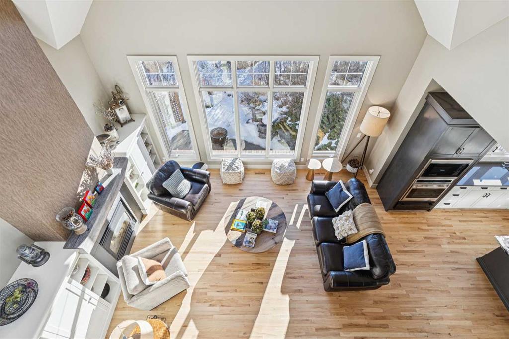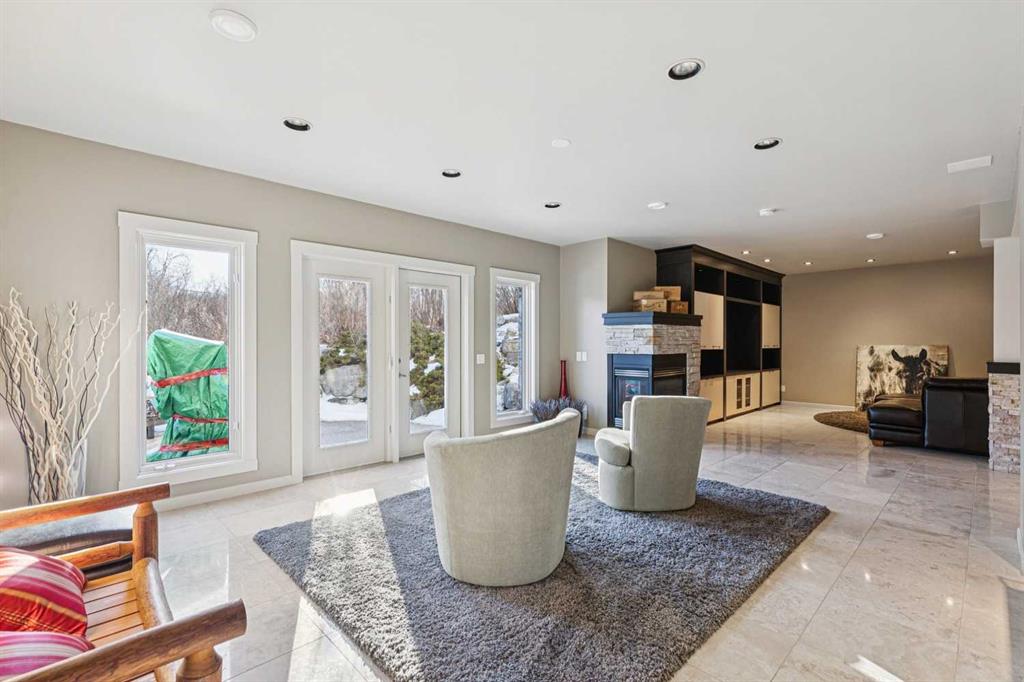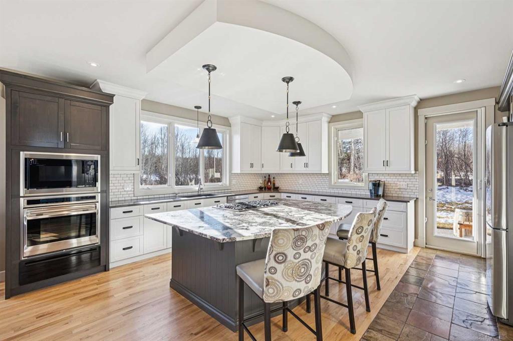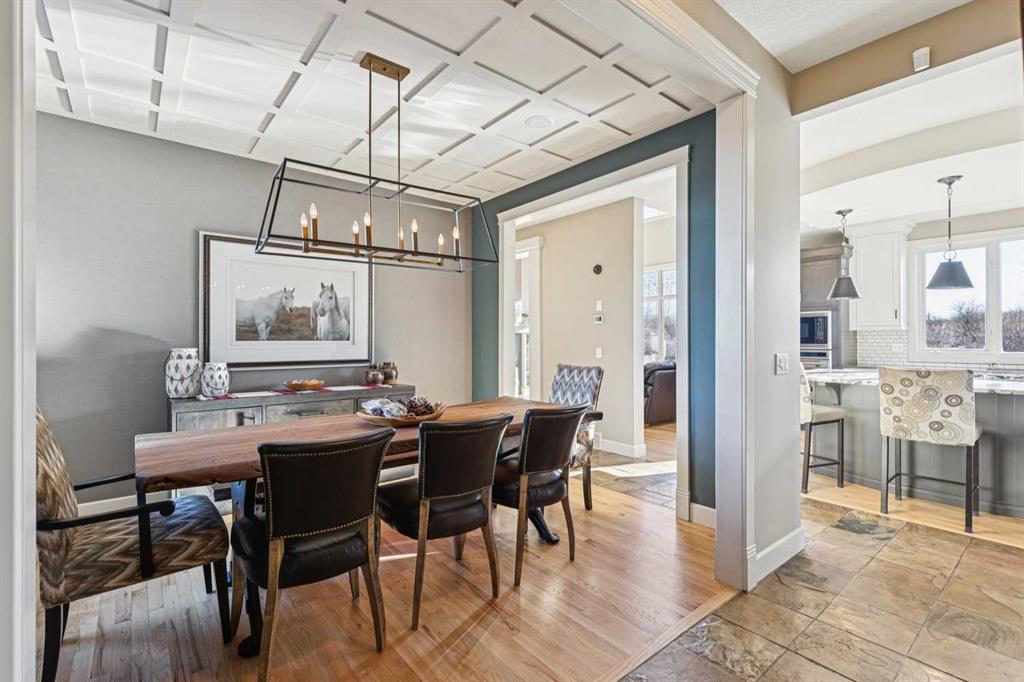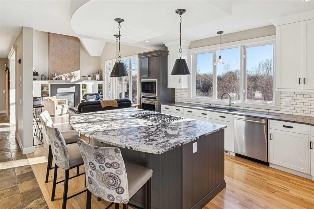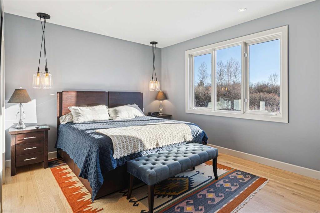 The French countryside awaits you in this spectacular 2,900 square foot one and one-half storey bungalow on a two-acre lot in the three-time award-winning “Canada Community of the Year”, Elbow Valley. Nestled in the Elbow River Valley, just west of Calgary, this prestigious community offers genuine estate living alongside unrivalled amenities. This beautifully upgraded and renovated home offers a dramatic open staircase, two storey foyer and great room ceilings, refinished quality hardwood floors throughout the main floor, staircases, and upper level. The professionally renovated kitchen was expanded and features shaker-style cabinets with soft- close doors, quality Wolf and JennAir stainless steel appliances, a feature center island with a special one-piece curved leather-finished granite cooktop. The formal dining room, warm and inviting with its coffered ceilings and hardwood floors, is perfect for entertaining. The main floor primary bedroom features a walk-through closet with custom built-ins and a luxurious ensuite bathroom that has heated porcelain tile floors, 10-mil glass shower, quartz vanity countertops, and double sinks. Overlooking the great room below, the upstairs boasts two large bedrooms, each with a full ensuite bath, walk-in closets, and incredible views. Professional walkout basement development is perfect for the mature family with a billiards/games room, a family room with a built-in entertainment center, a custom bar, a second fireplace, a full bath, two more bedrooms with new flooring, and multiple storage spaces to utilize by design. No-maintenance landscaping designed to blend into the natural surroundings features an exposed aggregate patio, a dry creek bed, a continuous curb, a natural Rundlestone exterior, and total privacy. Oversized triple attached heated garage with a developed 300 sq. ft. bonus room, perfect for a man cave, home office, or storage. Walk-up staircase to the garage, slab heating in the basement, upgraded mechanical, and 200-amp service. A blend of smooth-finished and knocked down stipple ceilings, renovated baths, upgraded lighting, solid core doors, nine-foot ceilings, laundry on the main and upper levels, clad windows in good condition, with three new triple pane windows added. From its sweeping views and prime location to its thoughtful design and upgrades, this beautiful Elbow Valley home is an absolute must-see!