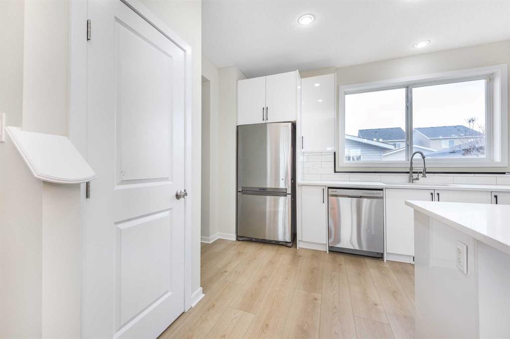LIVE UP! RENT DOWN! Welcome to your new home in Skyview Ranch, one of Calgary’s most vibrant and family-friendly communities! Conveniently located right in front of a bus stop and playground, this home is perfect for families and commuters alike. Everyday essentials are closer than ever, with schools, parks, shopping, and amenities just minutes away. Step inside to a bright, open-concept layout filled with natural light from large windows, complemented by brand-new LVP flooring, Carpet throughout the home. The stunning bright white kitchen features new countertops, brand-new cabinets, and stainless steel appliances, making it both stylish and functional. A half bathroom and a built-in computer desk complete the main level. Upstairs, the spacious primary bedroom offers a huge walk-in closet and a luxurious 4-piece ensuite bathroom. The second level also includes two generously sized bedrooms and an additional 4-piece bathroom, ideal for a growing family. New roofing, siding & cedar wood done on December 2025. The home also boasts a fully finished, illegal basement suite with a separate side entrance, featuring a 2-bedrooms, new kitchen countertops, brand-new cabinets, bathroom, and living area. an excellent mortgage helper or private space for extended family.