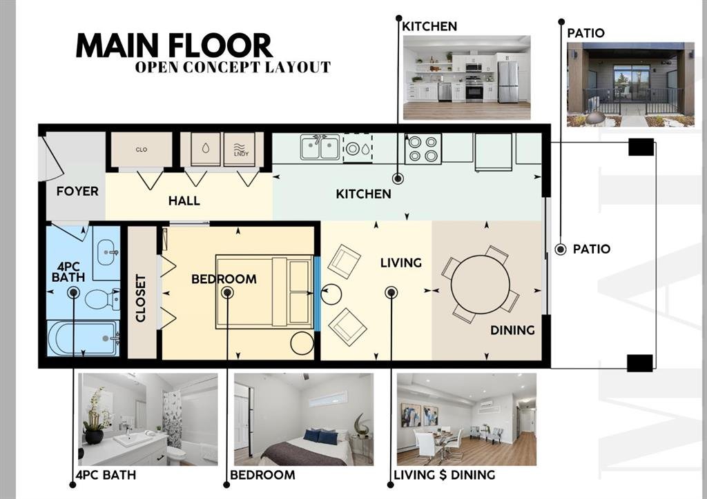 The large functional kitchen is a standout feature within the central living area, showcasing higher end cabinetry, quartz countertops, stainless steel appliances, and modern open shelving that adds both style and practicality. It grounds the the dining and living area, where large patio doors allow ample natural light and create a smooth transition to your personal outdoor patio and outdoor space. The oversized bedroom offers a calm and comfortable retreat, while the sleek 4-piece bathroom and convenient in-suite laundry complete the home.