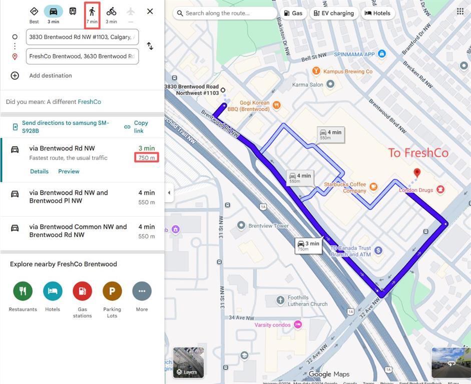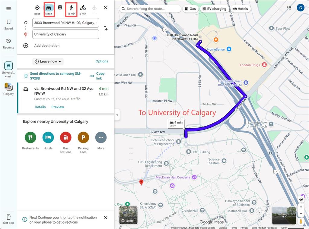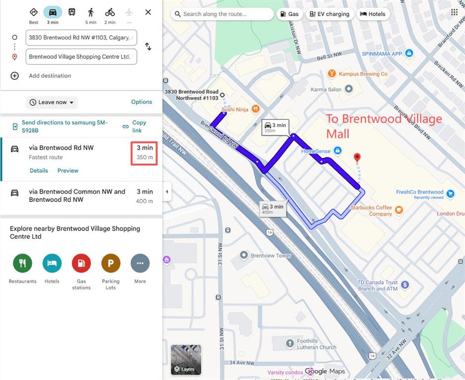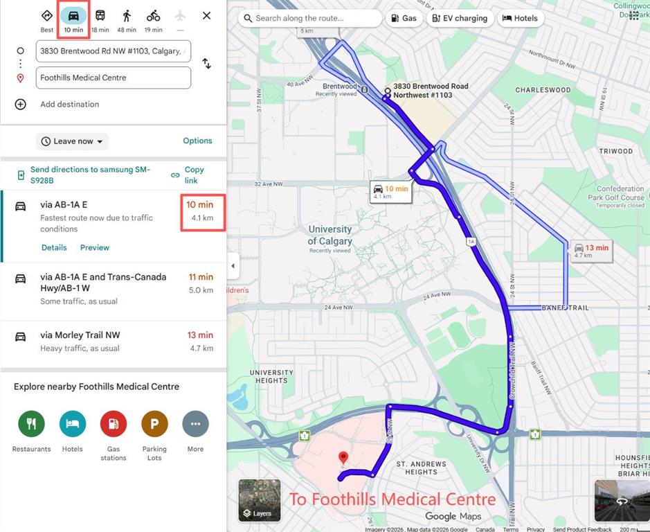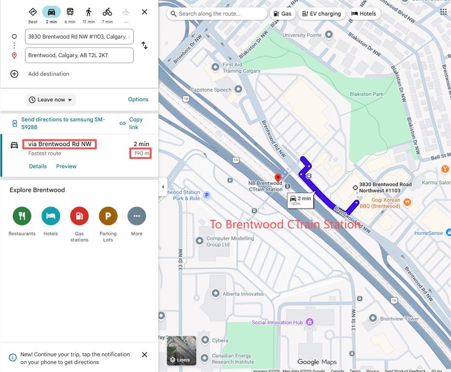 $44,500 Below 2026 Assessment | Titled Parking | CTrain at Door. Eleventh-floor southeast exposure with unobstructed sightlines toward the city — morning and midday sun fills the living area through floor-to-ceiling windows that span the full width of the unit. This 1-bedroom-plus-den layout in University City’s Orange Building delivers 560 square feet of functional space: a bright open-concept living and dining area with nine-foot ceilings, a modern kitchen with full-size appliances, and a private balcony off the living room catching the southeast light — morning coffee with an unbroken city skyline. The dedicated den off the main living space features a full-height frosted glass panel that borrows natural light from the adjacent room — a design detail that keeps the space bright while maintaining privacy for use as a home office, study, or second sleeping area. Primary bedroom has an exterior window and full-width closet. Four-piece bathroom with tile surround. In-suite washer and dryer, central air conditioning, titled heated underground parking stall, and assigned storage locker — all included. Condo contributions of $479.34 per month cover heat, water, sewer, insurance, and professional management. At this price point, the combined monthly cost of ownership is comparable to current one-bedroom rental rates in the Brentwood area. The building sits directly adjacent to Brentwood CTrain station — platform access without crossing a street. University of Calgary, Foothills Medical Centre, and Alberta Children’s Hospital are all reachable on foot. FreshCo, Co-op, and Brentwood Village Shopping Centre are within a five-minute walk. Nose Hill Natural Environment Park connects to an extensive trail network ten minutes north. Crowchild Trail provides direct vehicle access to downtown. Vacant and available for immediate possession.