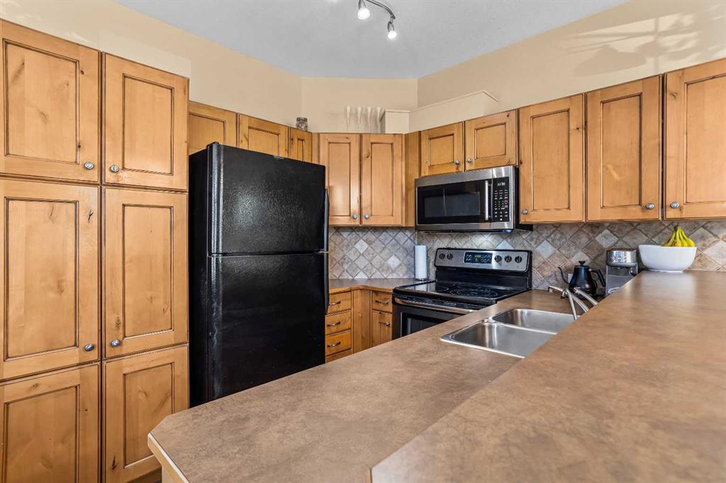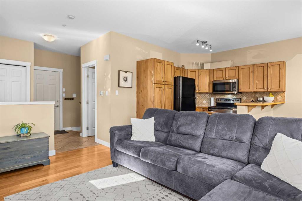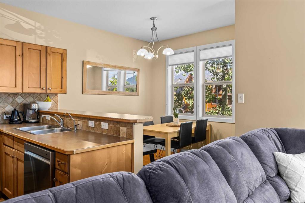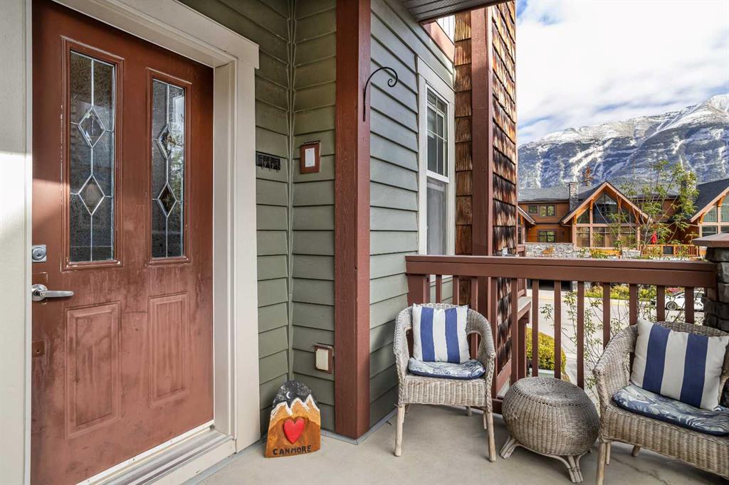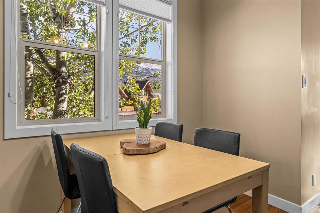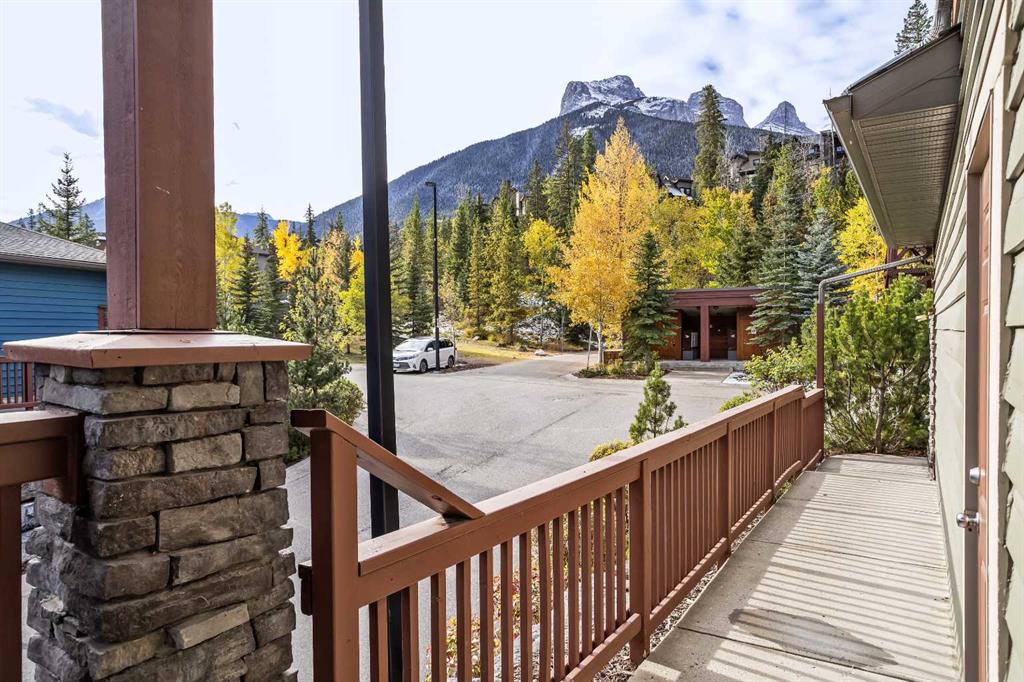 Beautiful corner townhouse in the highly sought-after Collier’s Ridge community, offering over 1,000 sq. ft. of bright, open living space and spectacular mountain views from every window. This two-level home welcomes you with an inviting open-concept kitchen, dining, and living area featuring 9’ ceilings, large windows that flood the space with natural light, and a cozy gas fireplace accented by a charming log mantle. Step out from the dining area onto the expansive deck to enjoy unobstructed panoramic views — perfect for morning coffee or evening relaxation. The entry level also includes a convenient powder room and a spacious single attached garage. The walkout lower level features two generous bedrooms with heated floors, a 4-piece bath, laundry area, and direct patio access from the primary suite. Located in a well-managed complex just steps from scenic hiking and biking trails and moments from Stewart Creek Golf Course, this home truly embodies the Canmore mountain lifestyle.