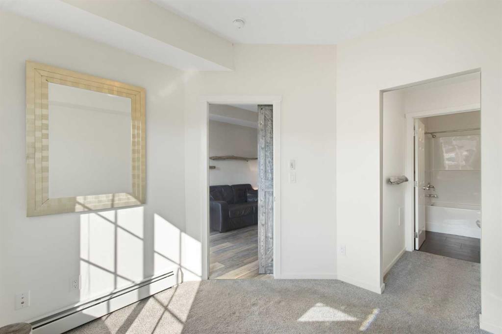 The gourmet kitchen is a chef’s delight, boasting sleek quartz countertops, soft-close cabinetry, and a full stainless steel appliance package, including a fridge, stove, built-in dishwasher, and over-the-range microwave.