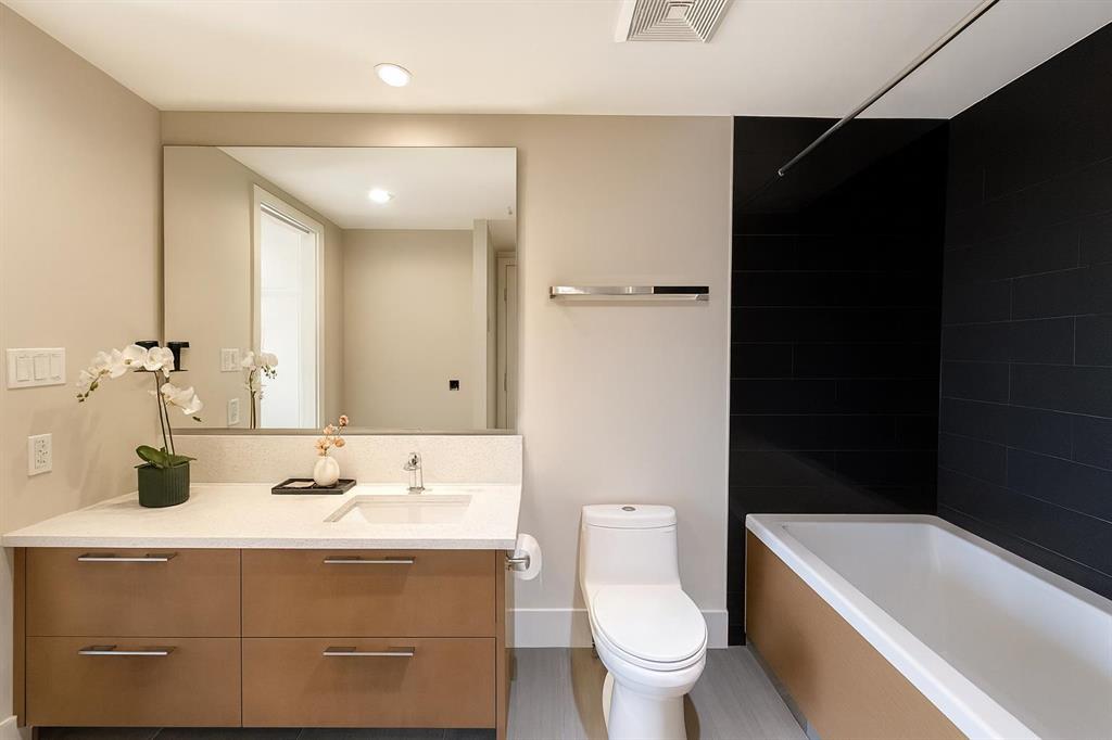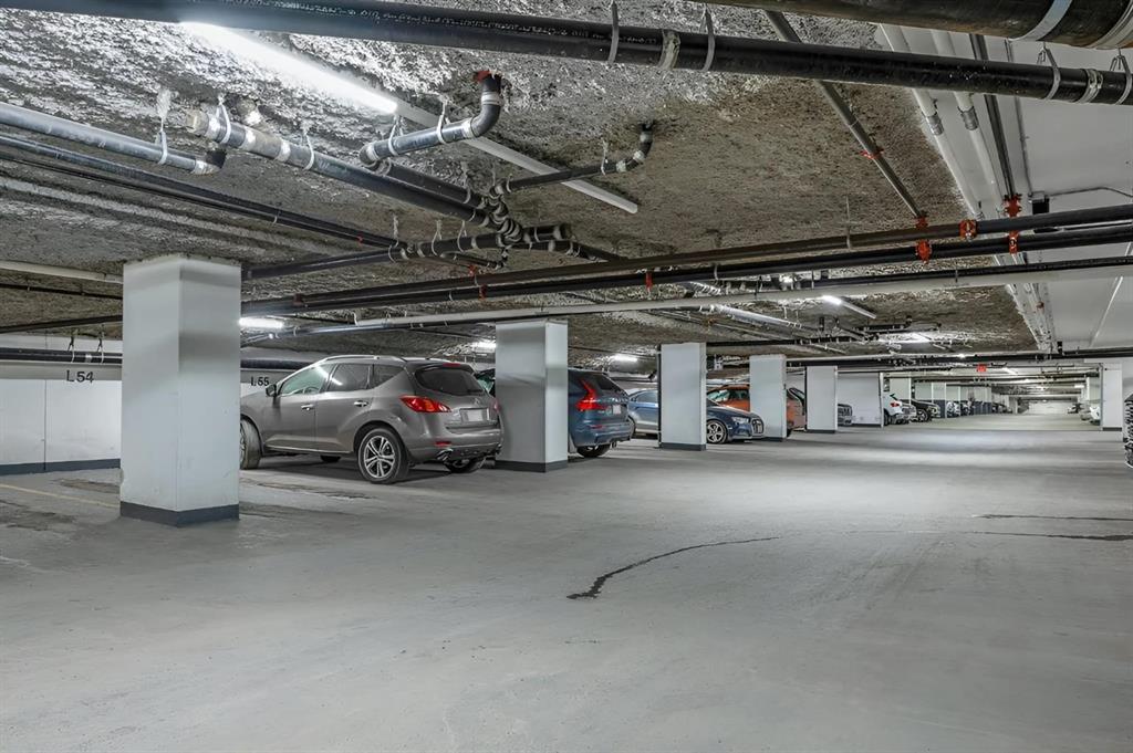 Bright and stylish 1 bed + den south-facing condo featuring an open layout, built-in desk, and modern kitchen with quartz countertops, gas cooktop, and full-height cabinets. Floor-to-ceiling south windows fill the home with light and showcase breathtaking 180° downtown and mountain views. Enjoy seamless indoor-outdoor living from your private balcony accessible from both the living room and bedroom. The primary suite offers a walkthrough closet and spa-inspired ensuite with soaker tub and rain shower. Includes in-suite laundry, A/C, titled heated parking, and storage locker. Luna residents enjoy top-tier amenities—fitness & yoga studios, steam room, lounge, guest suites, courtyard, and concierge. Steps to Co-op, 17th Ave, LRT, cafés, and parks—urban living at its best!