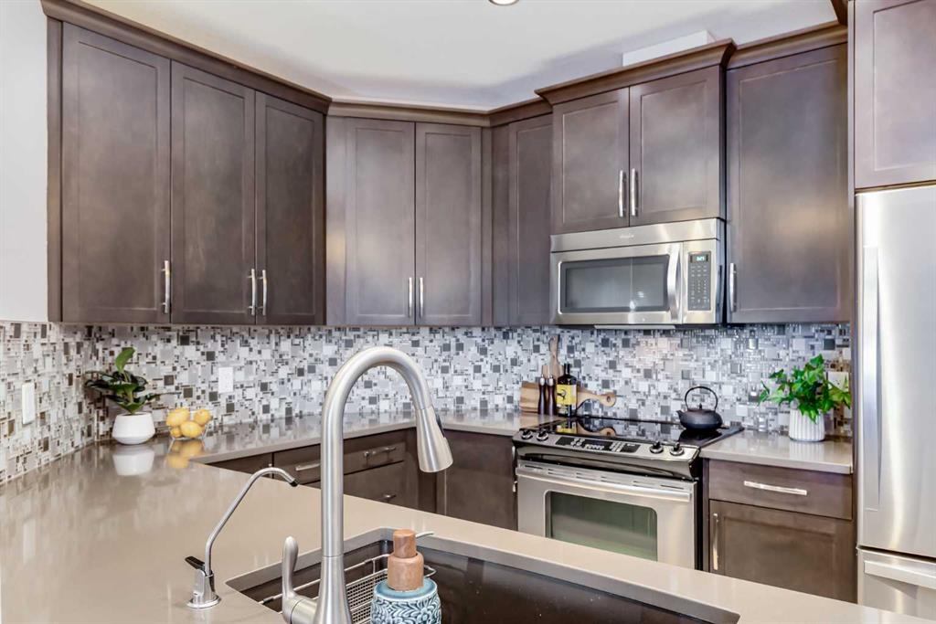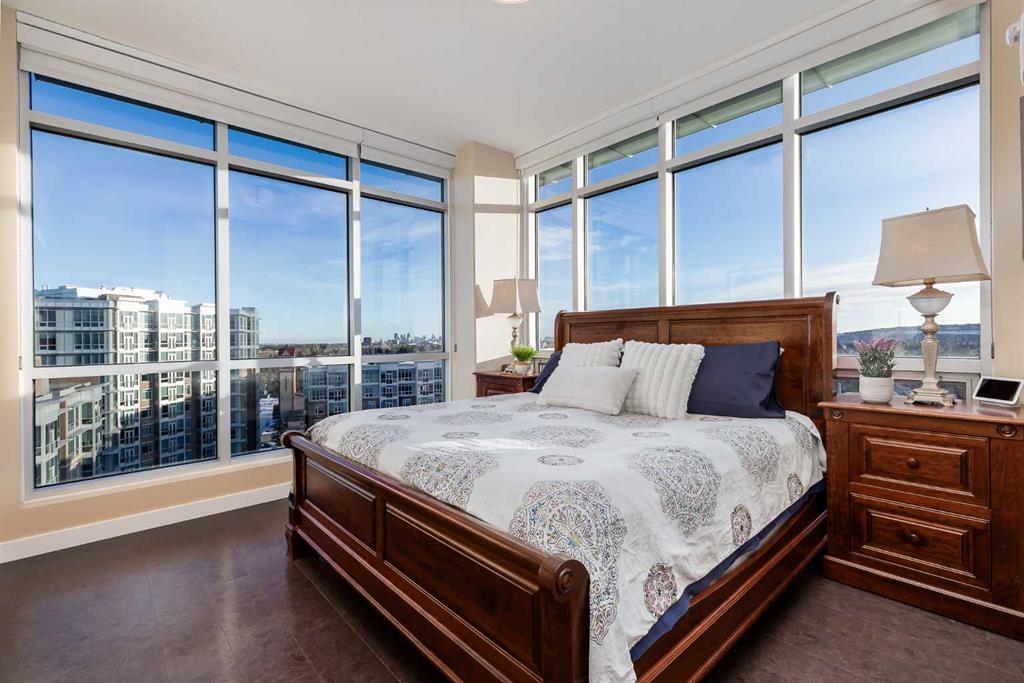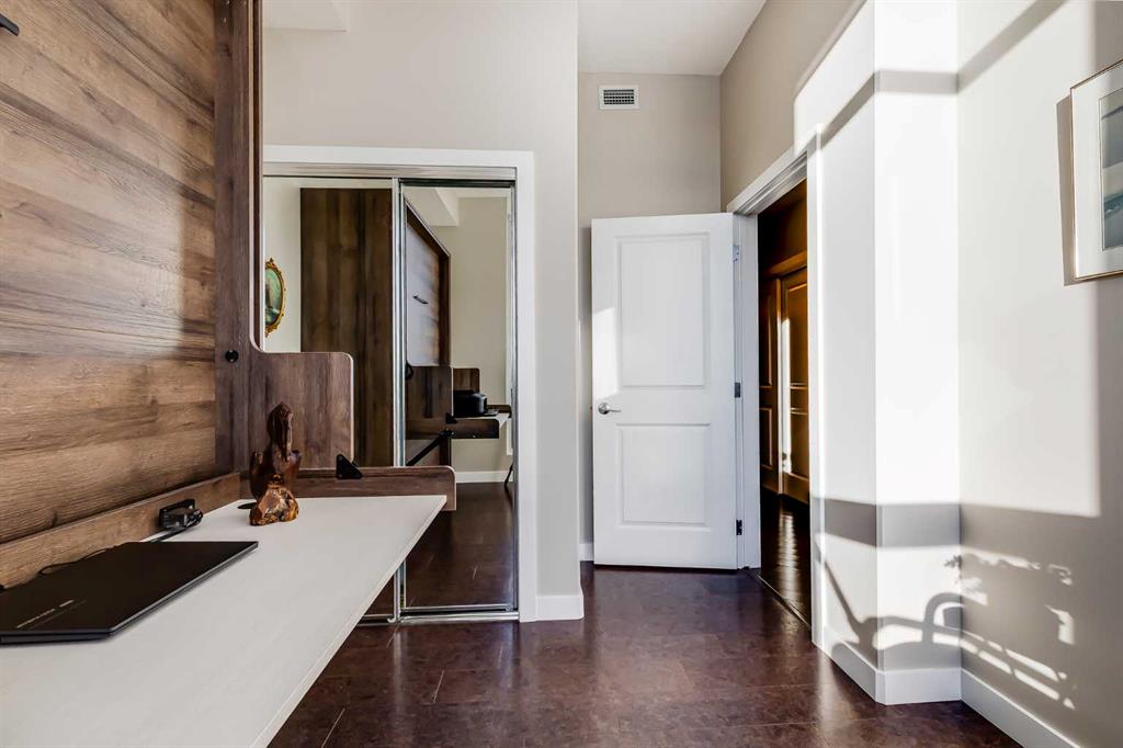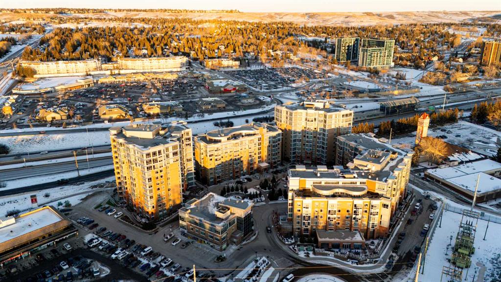 Perched on the 11th floor of the Monterey One building at Groves of Varsity, this thoughtfully designed condominium offers expansive views and a refined living experience in one of Calgary’s most established luxury complexes. Constructed with concrete and steel, the residence provides a quiet and secure setting. With over 1,000 square feet of developed space, the home features two bedrooms and two bathrooms, balancing comfort with functionality. The interior is defined by 10-foot ceilings and full-height windows that draw in natural light and frame open city and mountain outlooks. Hardwood flooring grounds the living and dining areas, creating a cohesive flow throughout the main living space. The living room is welcoming and well proportioned.. Adjacent to it, the modern kitchen combines style and practicality with tile flooring, rich wood cabinetry, quartz countertops, stainless steel appliances, plenty of cupboard space and a breakfast bar that adds casual seating. The dining area opens to a Juliet balcony and offers views toward downtown, making it a pleasant setting for both daily meals and evening gatherings. The primary bedroom is positioned to take full advantage of the scenery, with outlooks that stretch across the city and toward the mountains. It includes a walk-in closet and cork flooring, leading into a five-piece ensuite designed with a spa-like feel. A soaker tub, standalone shower, dual sinks, and quartz countertops complete the space. The second bedroom is equally versatile, currently functioning as a home office with a Murphy bed and integrated desk, allowing it to adapt easily to changing needs. A three-piece bathroom nearby features an oversized glass-enclosed shower and quartz countertop, offering convenience for guests or additional household members. A dedicated laundry room includes a full-size stacked washer and dryer along with extra storage, while air conditioning ensures comfort during warmer months. The home comes with one titled underground heated parking stall and a titled storage locker. Residents of the building have access to a range of shared amenities, including a fitness area, steam rooms, owners’ lounge, and an outdoor rooftop terrace with BBQs. A professional building nearby adds convenience with services such as medical offices, a pharmacy, and cafés. Short-term rentals are not permitted, and pets are welcome with board approval. The location places you steps from the Dalhousie LRT Station and directly across from the shops, dining, and services of Dalhousie Station. Market Mall, Northland Mall, and Crowfoot Crossing are all minutes away, as are major routes including Crowchild Trail, Stoney Trail, and downtown Calgary. The University of Calgary, SAIT, Silver Springs Golf & Country Club, Bowmont Park and its river pathways, Nose Hill Park, Foothills Hospital, and Alberta Children’s Hospital are all within easy reach, making this an ideal setting for both lifestyle and accessibility. Check out the 3D tour and floor plans!