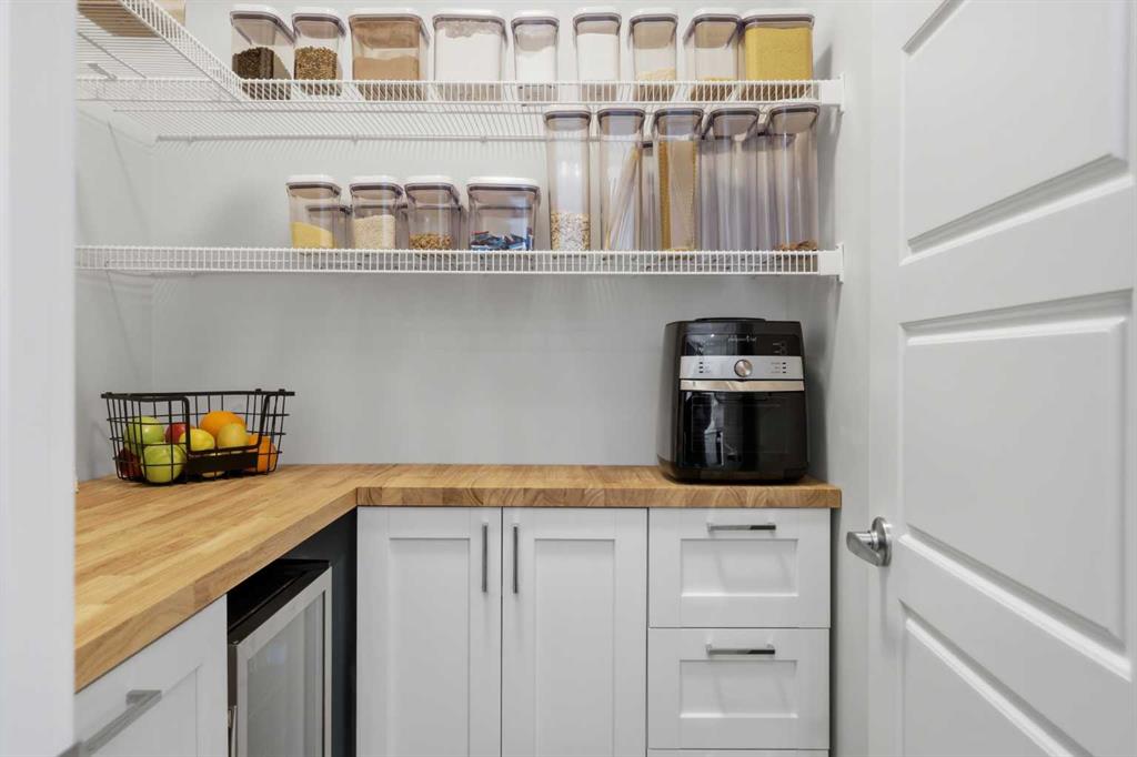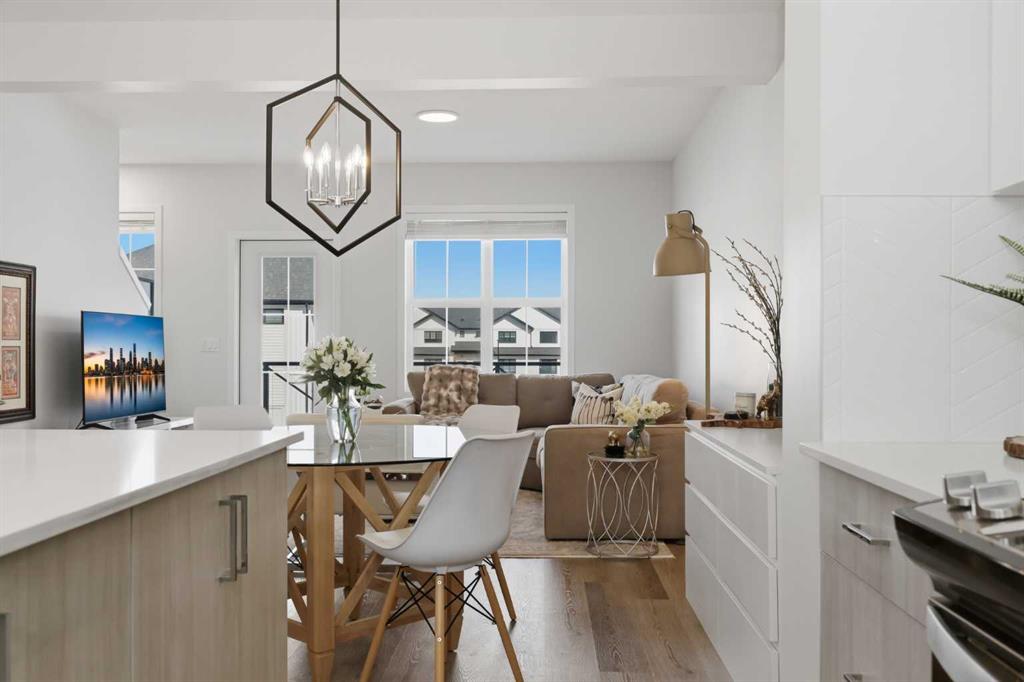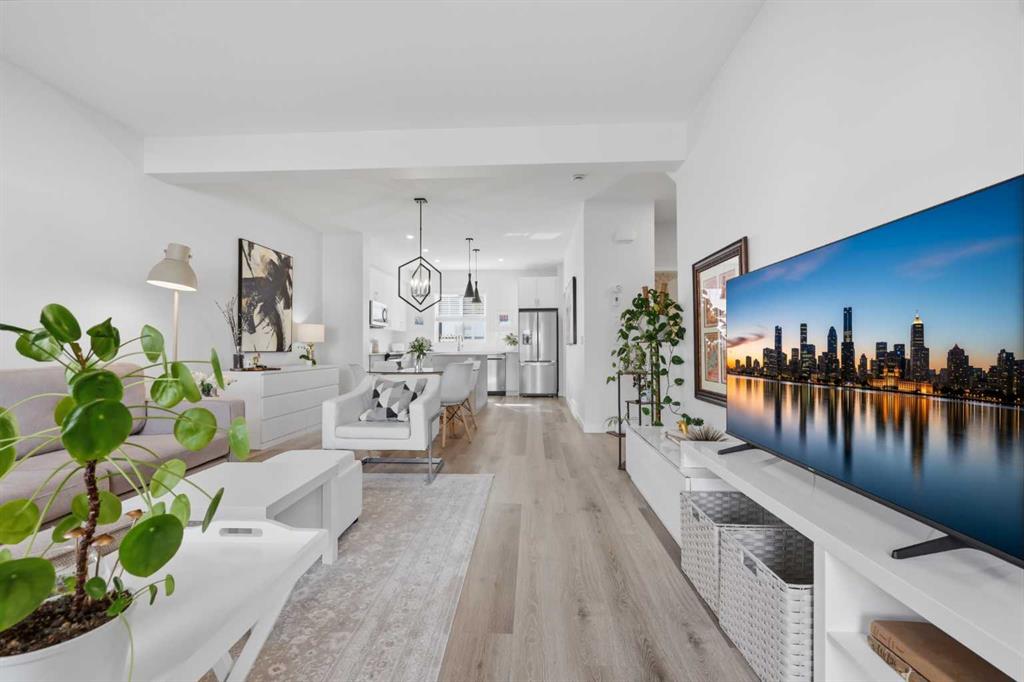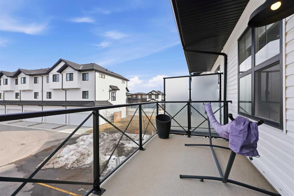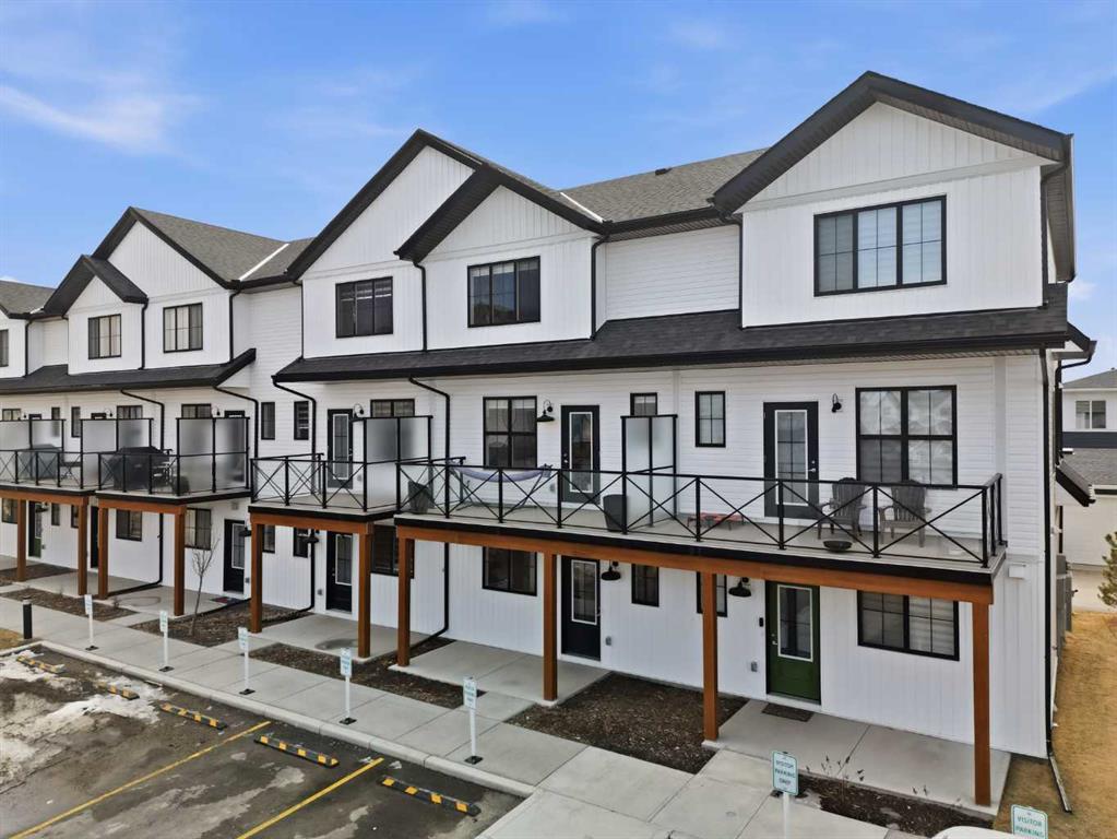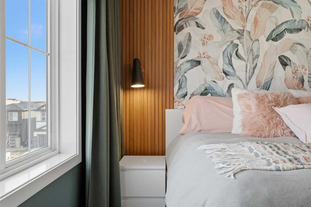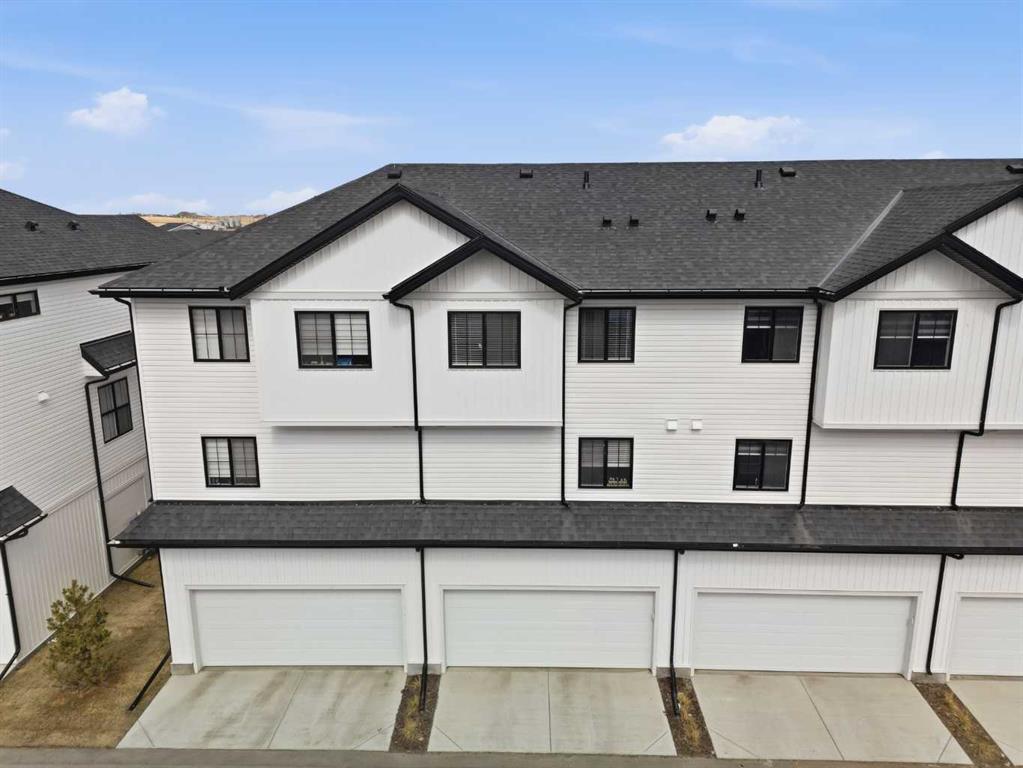 Welcome to Ambleton Mews! This home is designed to feel more like a detached house than a typical townhouse. With over 1,600 square feet, it offers wide, bright living spaces, modern style, smart design, and a long list of features across three finished levels. The entry-level sets the tone immediately, featuring a double-attached heated garage with under-stair storage, and a versatile bonus room that’s perfectly suited as a home office, guest suite, or den. Upstairs on the main floor, you’ll immediately notice the quality of finishes. The open-concept kitchen, dining, and living area is anchored by dual-tone cabinetry, topped with polished White Macchiato quartz countertops. A full suite of stainless steel Whirlpool appliances includes a French-door refrigerator with water dispenser, an electric range with air fryer, a built-in dishwasher, and an over-the-range microwave. The striking white chevron tile backsplash runs full height, and elevated 42″ upper cabinets maximize every inch of storage. Black pendant lighting over the island and a matching chandelier in the dining area add a designer edge. Just off the kitchen, the walk-in pantry has been upgraded well beyond the standard, featuring cabinetry, butcher block countertop, bar fridge, and wire shelving. It’s a true butler’s pantry that will impress even the most discerning chef. A private balcony off the main floor is roughed in with a natural gas line, ideal for year-round entertaining. The main-floor powder room has been finished with charming board-and-batten wainscoting and delicate floral wallpaper, elevating what is often an afterthought into a genuinely stylish space. The upper floor is a highlight of this home. The primary bedroom feels like a peaceful retreat, with a wood-slat and wallpaper accent wall and elegant wall sconces for a boutique-hotel feel. The walk-in closet has a custom built-in system with double and single hanging sections, open shelves, and a dresser with drawers. The four-piece ensuite bathroom features a dual vanity with quartz countertops, polished chrome Moen fixtures, Calacatta porcelain tiles, and a glass-enclosed shower for a spa-like experience. There are two additional bedrooms on this floor, sharing a four-piece main bathroom with the same quality tile and fixtures. The laundry area is also upstairs, with a stacked Whirlpool front-load washer and dryer for convenience. Throughout the home, LVP flooring flows across the main level and flex areas in a warm tone, while plush carpet adds comfort in all bedrooms. Window coverings and blinds are included on every window, move-in ready from day one. Outside, the community offers a great quality of life. Scenic pathways wind around the nearby storm pond. There is a future school site nearby, and well-maintained paths connect parks, playgrounds, and green spaces woven throughout the area. Ambleton is a community thoughtfully designed for an active, connected way of life.
