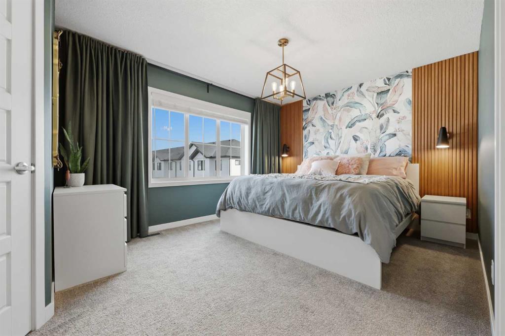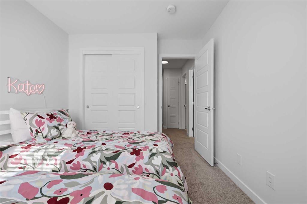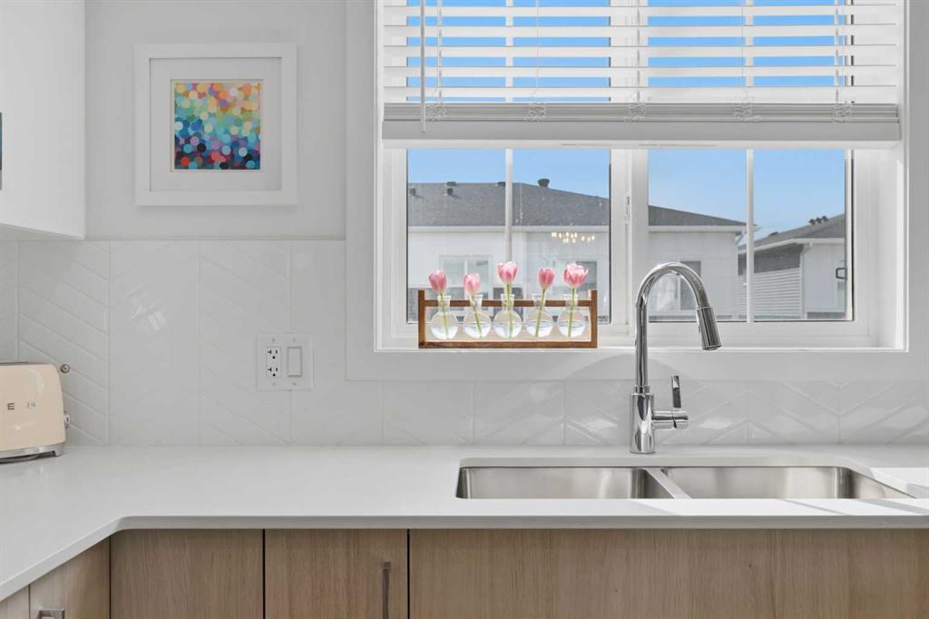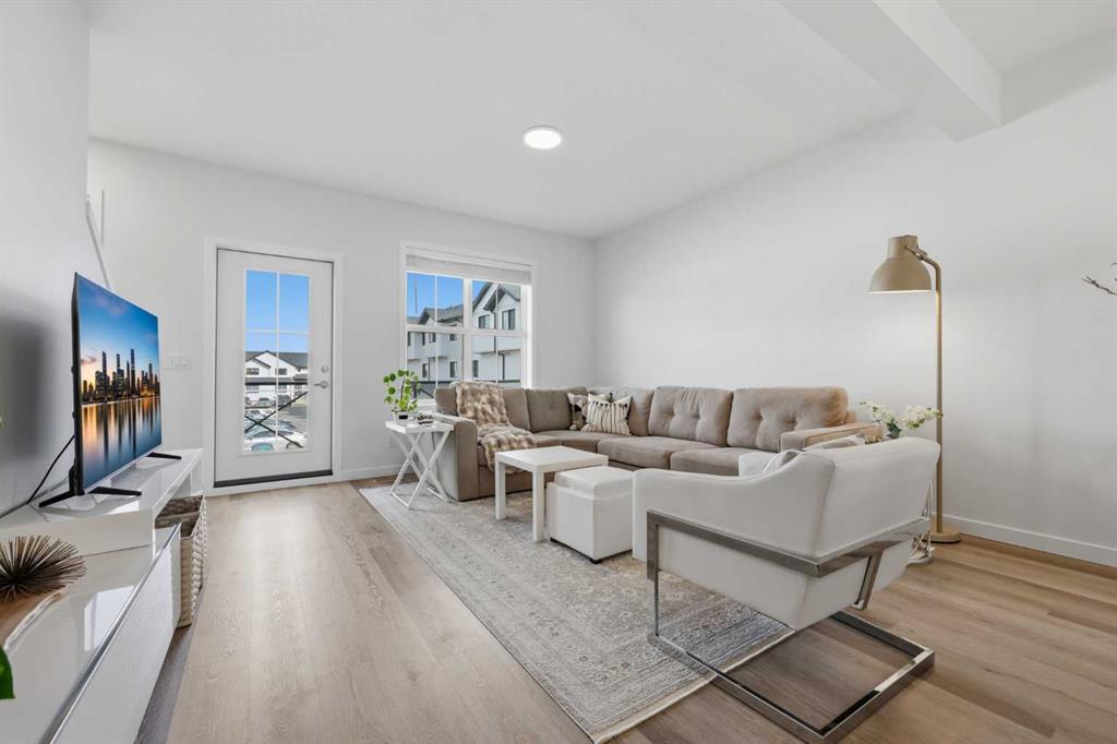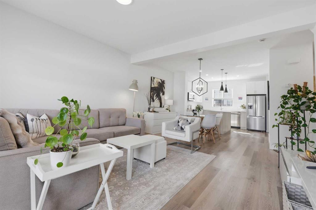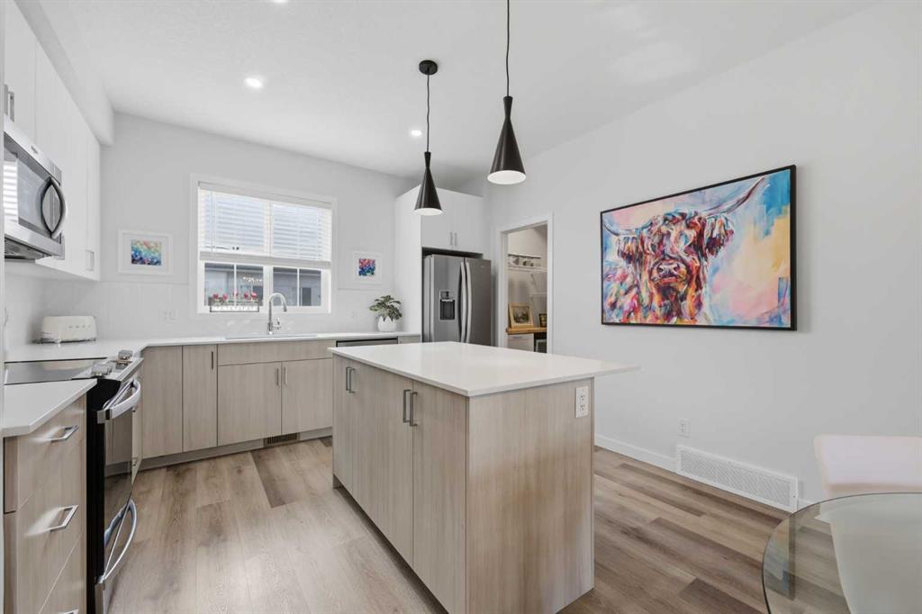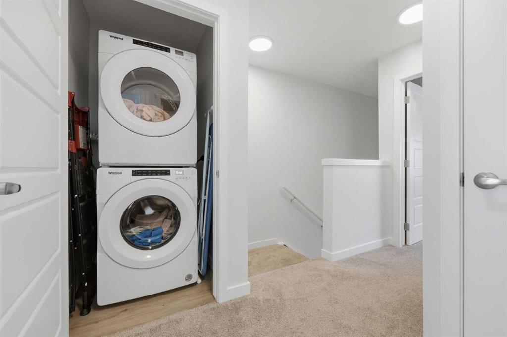 Welcome to Ambleton Mews! This home is designed to feel more like a detached house than a typical townhouse. With over 1,600 square feet, it offers wide, bright living spaces, modern style, smart design, and a long list of features across three finished levels. The entry-level sets the tone immediately, featuring a double-attached heated garage with under-stair storage, and a versatile bonus room that’s perfectly suited as a home office, guest suite, or den. Upstairs on the main floor, you’ll immediately notice the quality of finishes. The open-concept kitchen, dining, and living area is anchored by dual-tone cabinetry, topped with polished White Macchiato quartz countertops. A full suite of stainless steel Whirlpool appliances includes a French-door refrigerator with water dispenser, an electric range with air fryer, a built-in dishwasher, and an over-the-range microwave. The striking white chevron tile backsplash runs full height, and elevated 42″ upper cabinets maximize every inch of storage. Black pendant lighting over the island and a matching chandelier in the dining area add a designer edge. Just off the kitchen, the walk-in pantry has been upgraded well beyond the standard, featuring cabinetry, butcher block countertop, bar fridge, and wire shelving. It’s a true butler’s pantry that will impress even the most discerning chef. A private balcony off the main floor is roughed in with a natural gas line, ideal for year-round entertaining. The main-floor powder room has been finished with charming board-and-batten wainscoting and delicate floral wallpaper, elevating what is often an afterthought into a genuinely stylish space. The upper floor is a highlight of this home. The primary bedroom feels like a peaceful retreat, with a wood-slat and wallpaper accent wall and elegant wall sconces for a boutique-hotel feel. The walk-in closet has a custom built-in system with double and single hanging sections, open shelves, and a dresser with drawers. The four-piece ensuite bathroom features a dual vanity with quartz countertops, polished chrome Moen fixtures, Calacatta porcelain tiles, and a glass-enclosed shower for a spa-like experience. There are two additional bedrooms on this floor, sharing a four-piece main bathroom with the same quality tile and fixtures. The laundry area is also upstairs, with a stacked Whirlpool front-load washer and dryer for convenience. Throughout the home, LVP flooring flows across the main level and flex areas in a warm tone, while plush carpet adds comfort in all bedrooms. Window coverings and blinds are included on every window, move-in ready from day one. Outside, the community offers a great quality of life. Scenic pathways wind around the nearby storm pond. There is a future school site nearby, and well-maintained paths connect parks, playgrounds, and green spaces woven throughout the area. Ambleton is a community thoughtfully designed for an active, connected way of life.