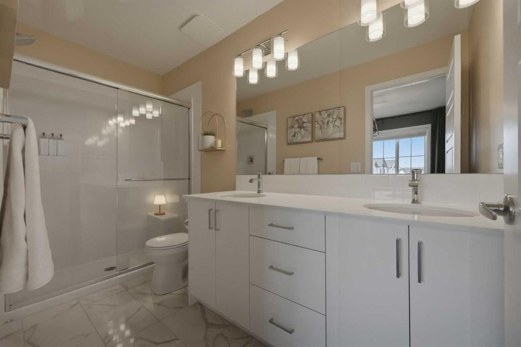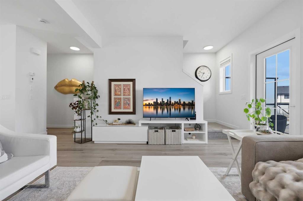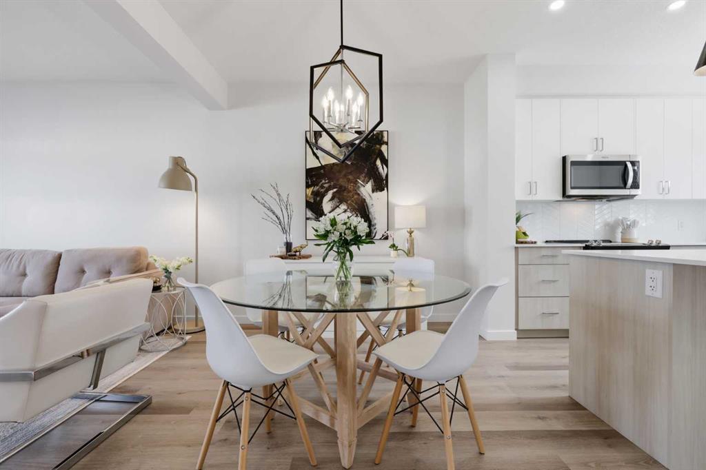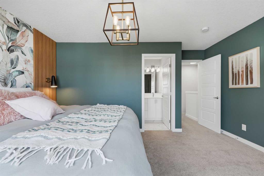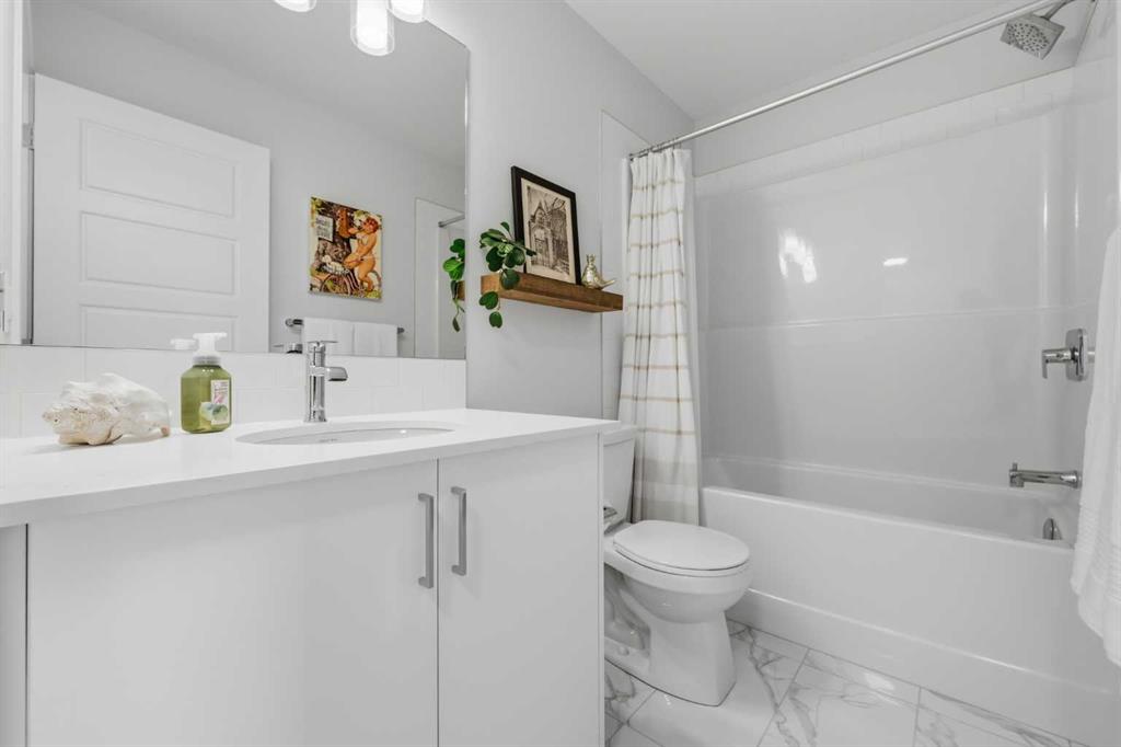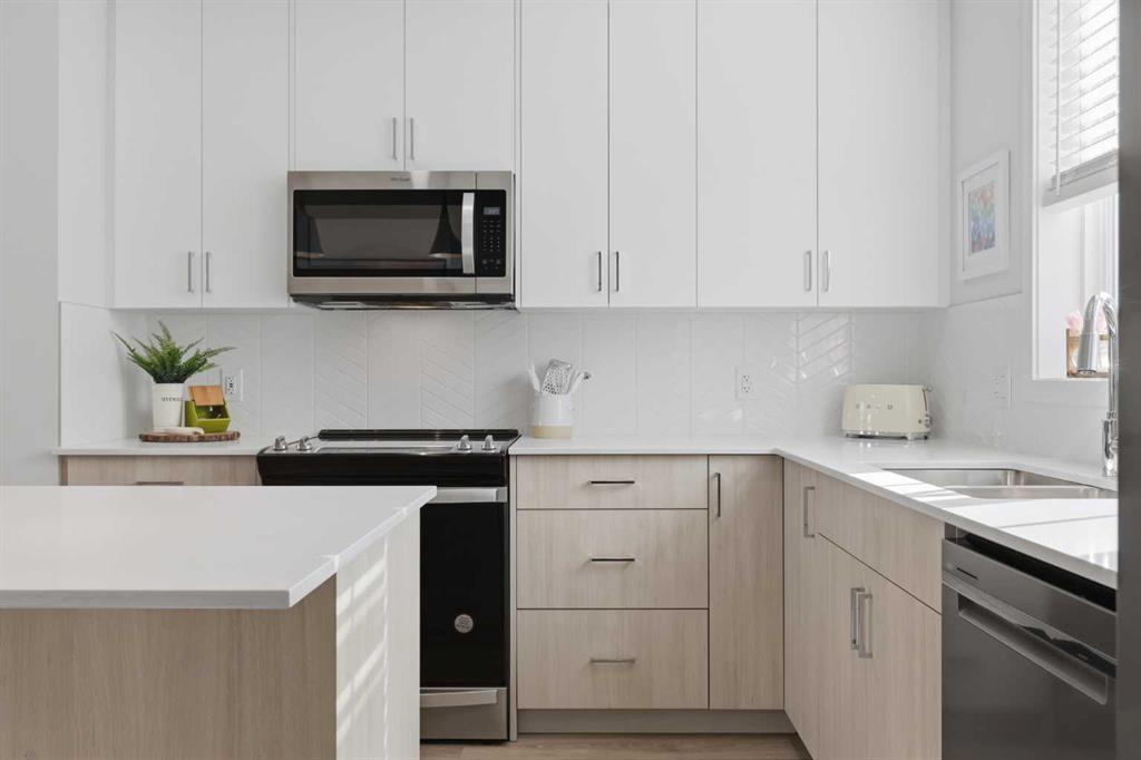 Welcome to Ambleton Mews! This home is designed to feel more like a detached house than a typical townhouse. With over 1,600 square feet, it offers wide, bright living spaces, modern style, smart design, and a long list of features across three finished levels. The entry-level sets the tone immediately, featuring a double-attached heated garage with under-stair storage, and a versatile bonus room that’s perfectly suited as a home office, guest suite, or den. Upstairs on the main floor, you’ll immediately notice the quality of finishes. The open-concept kitchen, dining, and living area is anchored by dual-tone cabinetry, topped with polished White Macchiato quartz countertops. A full suite of stainless steel Whirlpool appliances includes a French-door refrigerator with water dispenser, an electric range with air fryer, a built-in dishwasher, and an over-the-range microwave. The striking white chevron tile backsplash runs full height, and elevated 42″ upper cabinets maximize every inch of storage. Black pendant lighting over the island and a matching chandelier in the dining area add a designer edge. Just off the kitchen, the walk-in pantry has been upgraded well beyond the standard, featuring cabinetry, butcher block countertop, bar fridge, and wire shelving. It’s a true butler’s pantry that will impress even the most discerning chef. A private balcony off the main floor is roughed in with a natural gas line, ideal for year-round entertaining. The main-floor powder room has been finished with charming board-and-batten wainscoting and delicate floral wallpaper, elevating what is often an afterthought into a genuinely stylish space. The upper floor is a highlight of this home. The primary bedroom feels like a peaceful retreat, with a wood-slat and wallpaper accent wall and elegant wall sconces for a boutique-hotel feel. The walk-in closet has a custom built-in system with double and single hanging sections, open shelves, and a dresser with drawers. The four-piece ensuite bathroom features a dual vanity with quartz countertops, polished chrome Moen fixtures, Calacatta porcelain tiles, and a glass-enclosed shower for a spa-like experience. There are two additional bedrooms on this floor, sharing a four-piece main bathroom with the same quality tile and fixtures. The laundry area is also upstairs, with a stacked Whirlpool front-load washer and dryer for convenience. Throughout the home, LVP flooring flows across the main level and flex areas in a warm tone, while plush carpet adds comfort in all bedrooms. Window coverings and blinds are included on every window, move-in ready from day one. Outside, the community offers a great quality of life. Scenic pathways wind around the nearby storm pond. There is a future school site nearby, and well-maintained paths connect parks, playgrounds, and green spaces woven throughout the area. Ambleton is a community thoughtfully designed for an active, connected way of life.