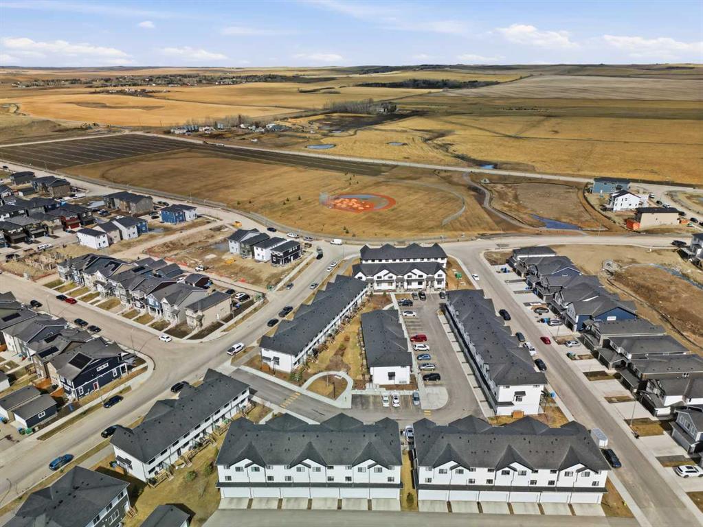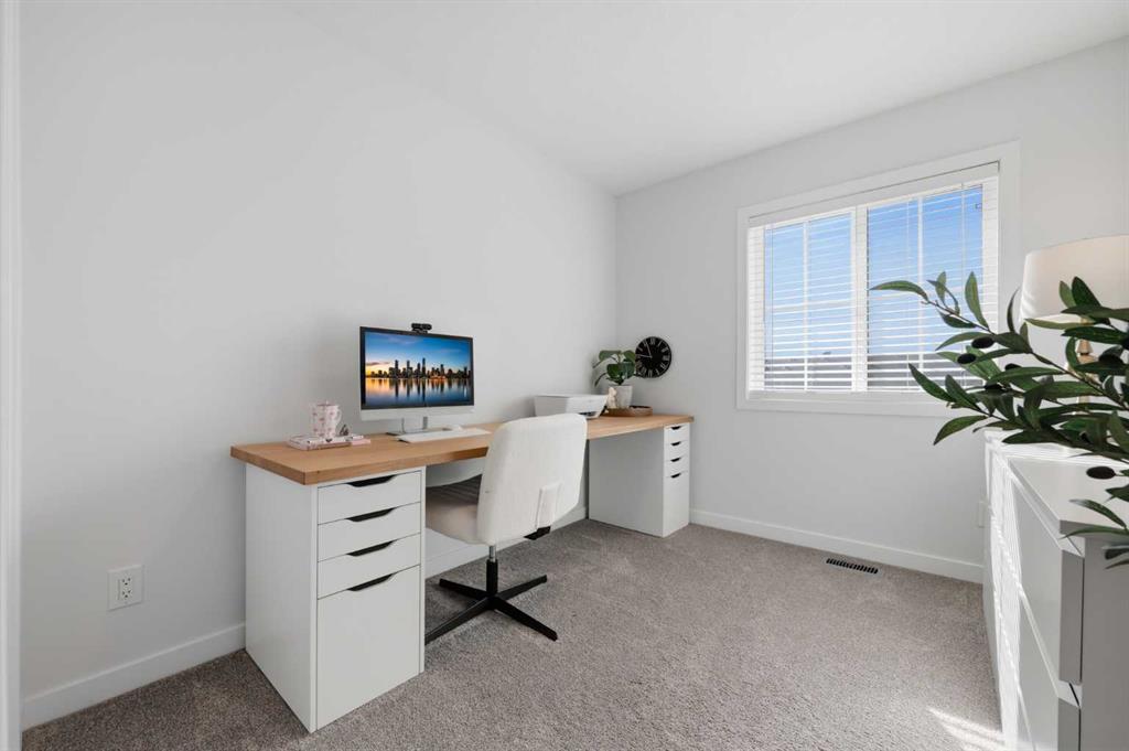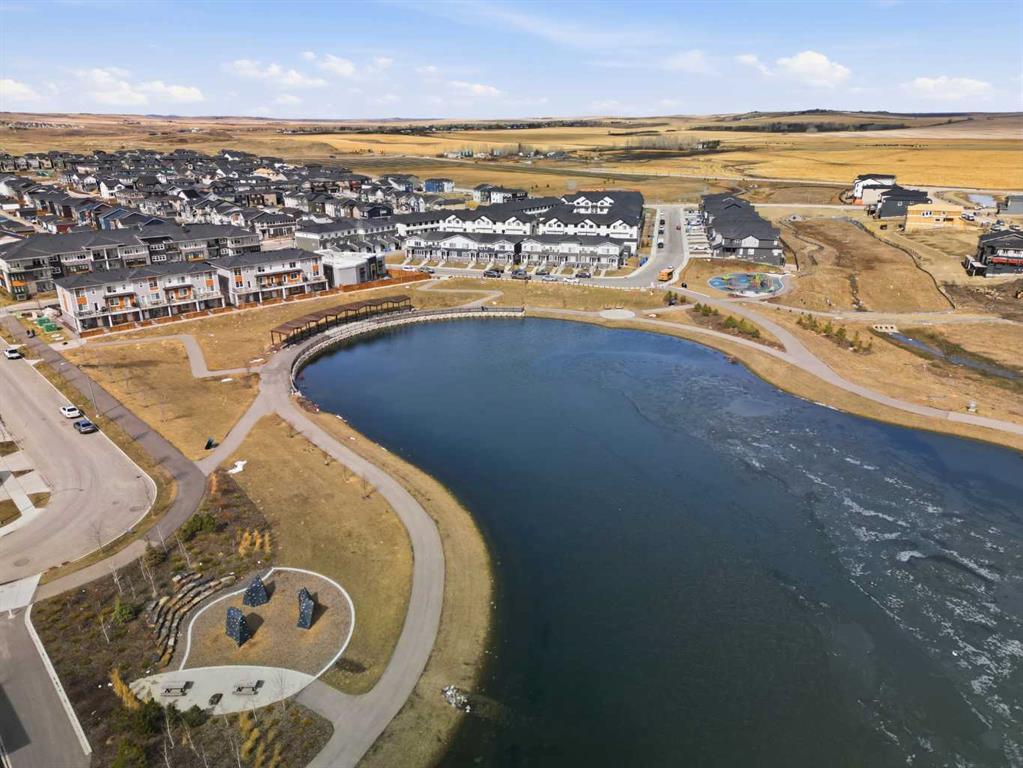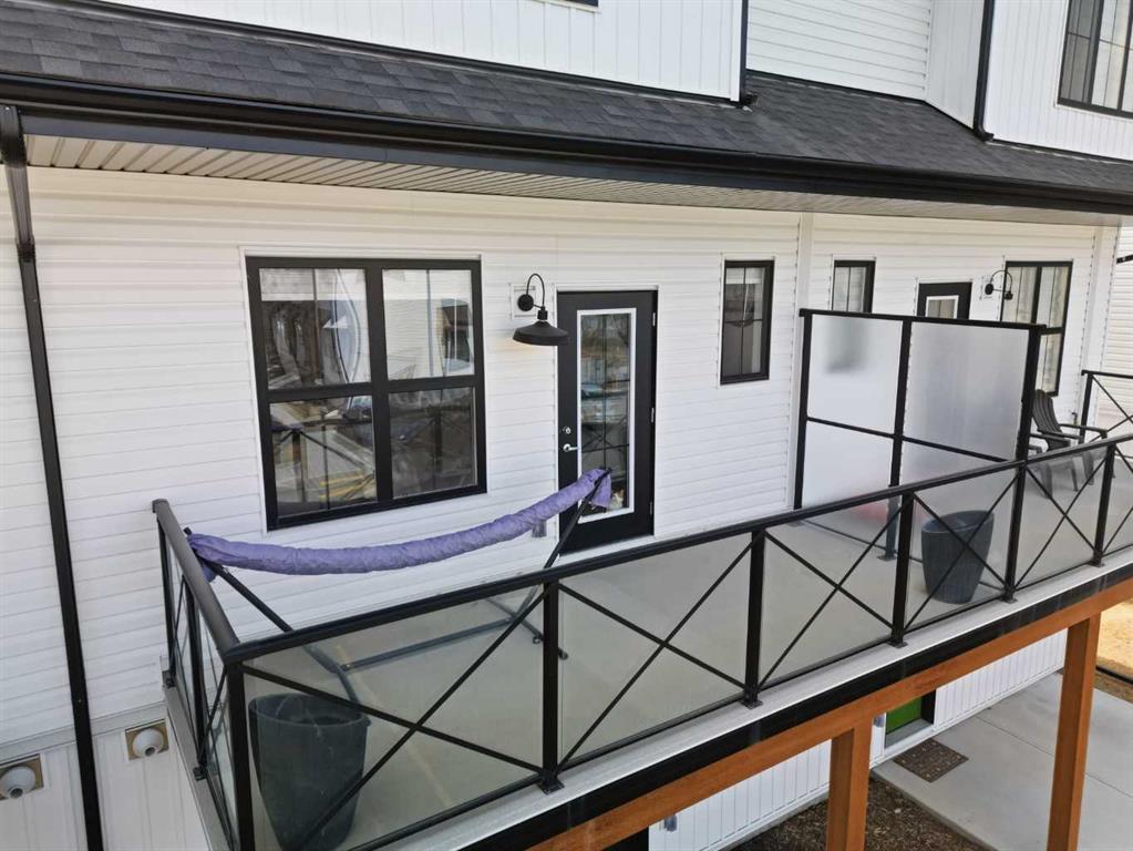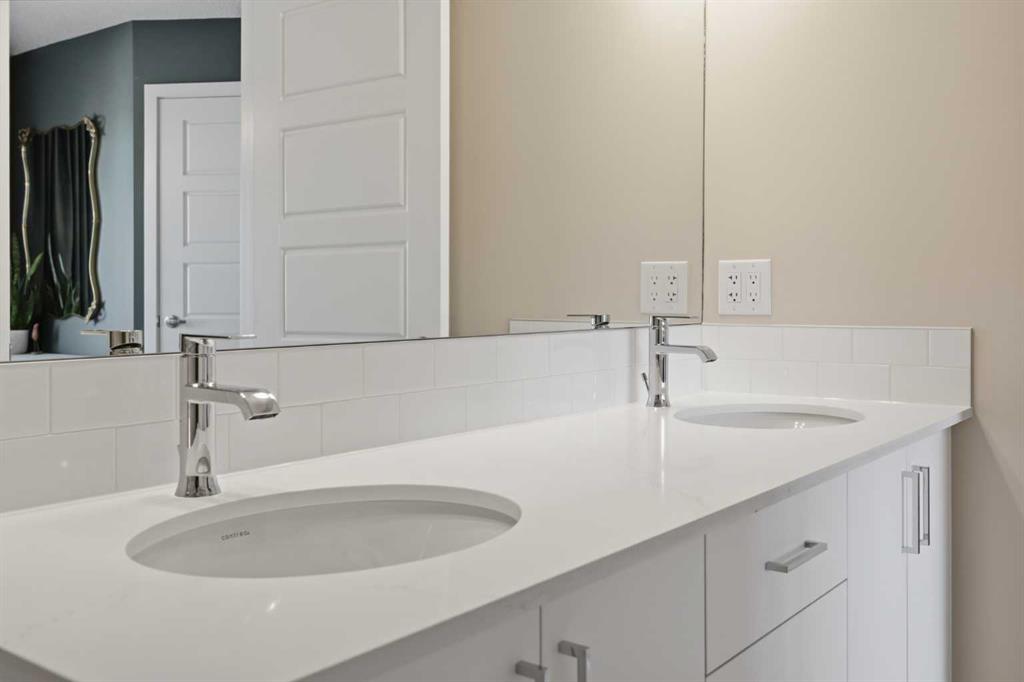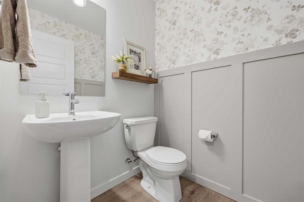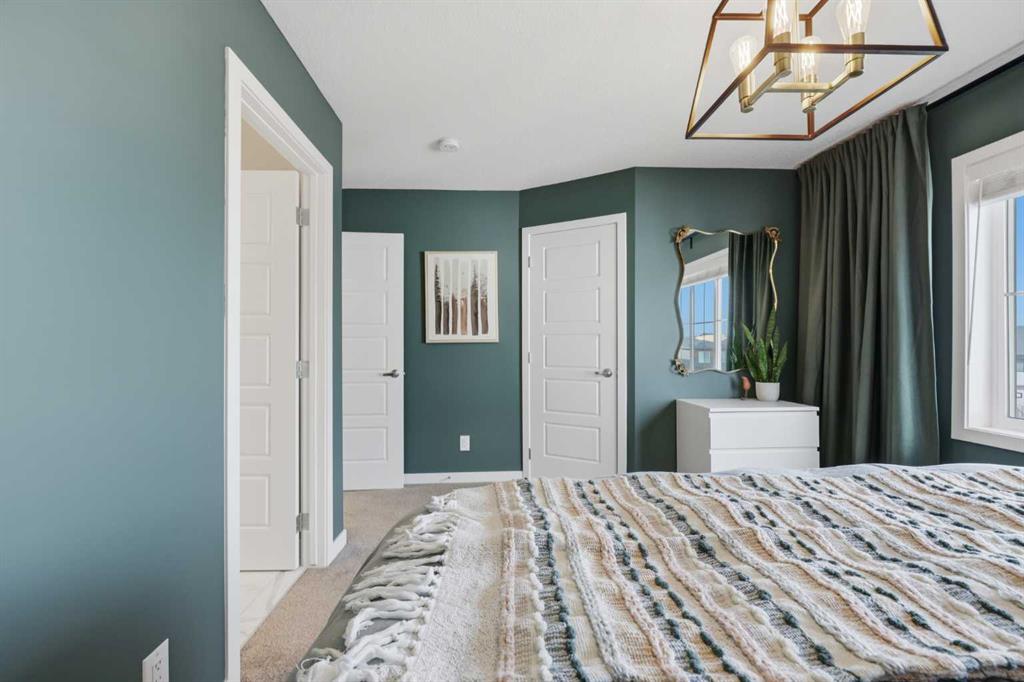 Welcome to Ambleton Mews! This home is designed to feel more like a detached house than a typical townhouse. With over 1,600 square feet, it offers wide, bright living spaces, modern style, smart design, and a long list of features across three finished levels. The entry-level sets the tone immediately, featuring a double-attached heated garage with under-stair storage, and a versatile bonus room that’s perfectly suited as a home office, guest suite, or den. Upstairs on the main floor, you’ll immediately notice the quality of finishes. The open-concept kitchen, dining, and living area is anchored by dual-tone cabinetry, topped with polished White Macchiato quartz countertops. A full suite of stainless steel Whirlpool appliances includes a French-door refrigerator with water dispenser, an electric range with air fryer, a built-in dishwasher, and an over-the-range microwave. The striking white chevron tile backsplash runs full height, and elevated 42″ upper cabinets maximize every inch of storage. Black pendant lighting over the island and a matching chandelier in the dining area add a designer edge. Just off the kitchen, the walk-in pantry has been upgraded well beyond the standard, featuring cabinetry, butcher block countertop, bar fridge, and wire shelving. It’s a true butler’s pantry that will impress even the most discerning chef. A private balcony off the main floor is roughed in with a natural gas line, ideal for year-round entertaining. The main-floor powder room has been finished with charming board-and-batten wainscoting and delicate floral wallpaper, elevating what is often an afterthought into a genuinely stylish space. The upper floor is a highlight of this home. The primary bedroom feels like a peaceful retreat, with a wood-slat and wallpaper accent wall and elegant wall sconces for a boutique-hotel feel. The walk-in closet has a custom built-in system with double and single hanging sections, open shelves, and a dresser with drawers. The four-piece ensuite bathroom features a dual vanity with quartz countertops, polished chrome Moen fixtures, Calacatta porcelain tiles, and a glass-enclosed shower for a spa-like experience. There are two additional bedrooms on this floor, sharing a four-piece main bathroom with the same quality tile and fixtures. The laundry area is also upstairs, with a stacked Whirlpool front-load washer and dryer for convenience. Throughout the home, LVP flooring flows across the main level and flex areas in a warm tone, while plush carpet adds comfort in all bedrooms. Window coverings and blinds are included on every window, move-in ready from day one. Outside, the community offers a great quality of life. Scenic pathways wind around the nearby storm pond. There is a future school site nearby, and well-maintained paths connect parks, playgrounds, and green spaces woven throughout the area. Ambleton is a community thoughtfully designed for an active, connected way of life.