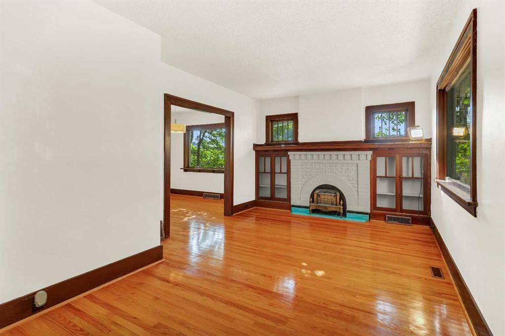 Inside, you’ll find gleaming hardwood floors, original wood trim, and oversized windows that flood the home with natural light. The spacious living room features a decorative fireplace framed by built-ins, while the dining area and vintage kitchen with built-in breakfast nook add to the charm. Two well-sized bedrooms and a full bathroom with clawfoot tub complete the main floor.