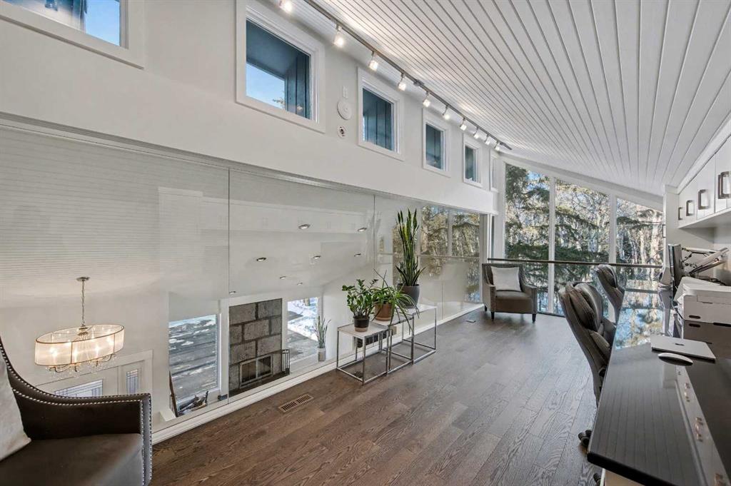 A spectacular glass enclosed home office overlooks the main floor, blending architectural beauty with everyday functionality perfect for those who can also work from home and appreciate inspiring spaces.