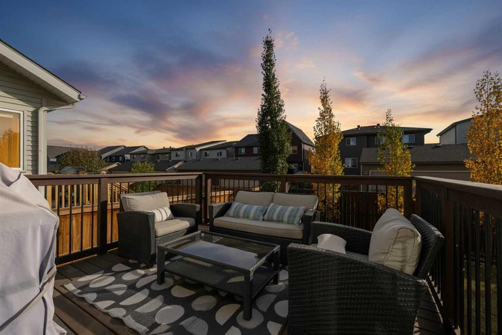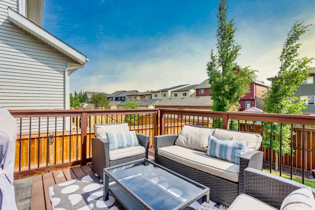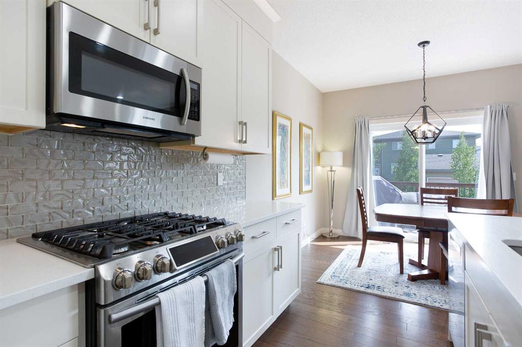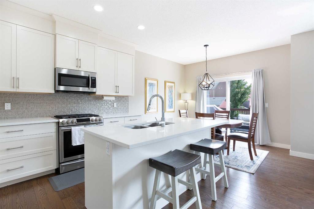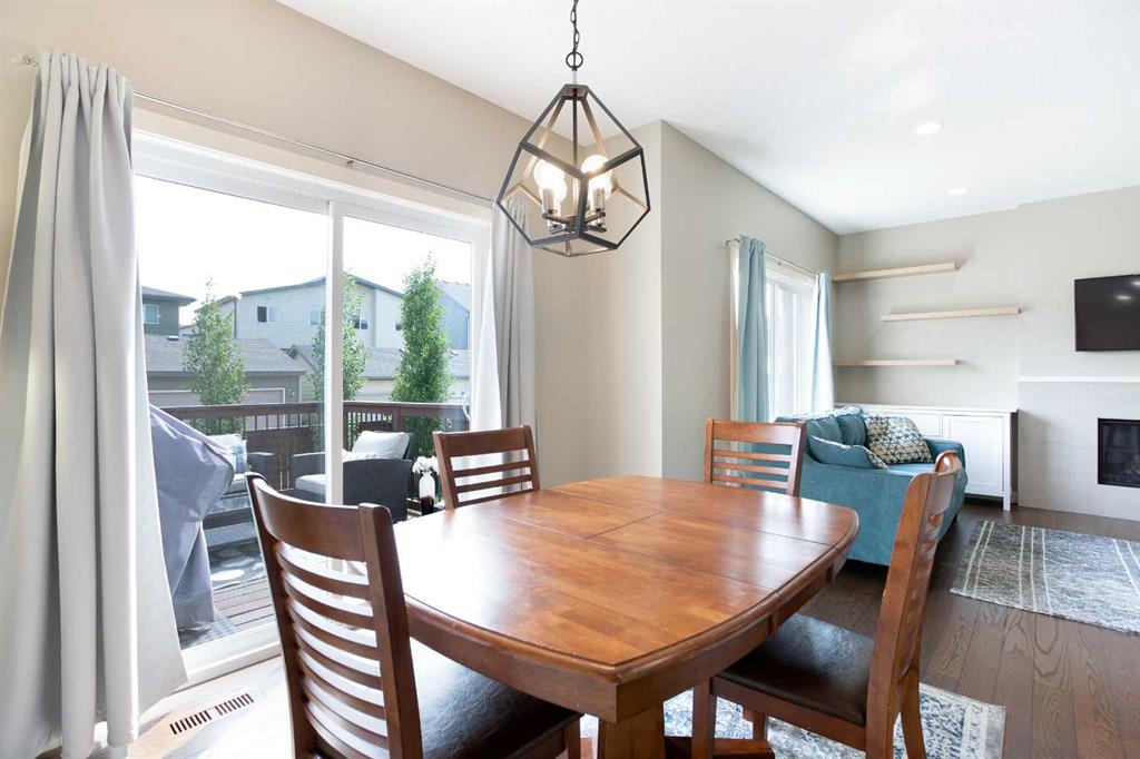 The kitchen is built for both function and style, featuring sleek white cabinetry, a massive central island, quartz countertops, and an abundance of storage. A convenient walk-through pantry connects directly to the mudroom and garage, making grocery hauls effortless. The dining area opens onto a sunny south-facing deck and a private backyard—perfect for summer gatherings—while the bright and airy living room, anchored by oversized windows and a gas fireplace, offers a warm and welcoming space to relax or entertain.
