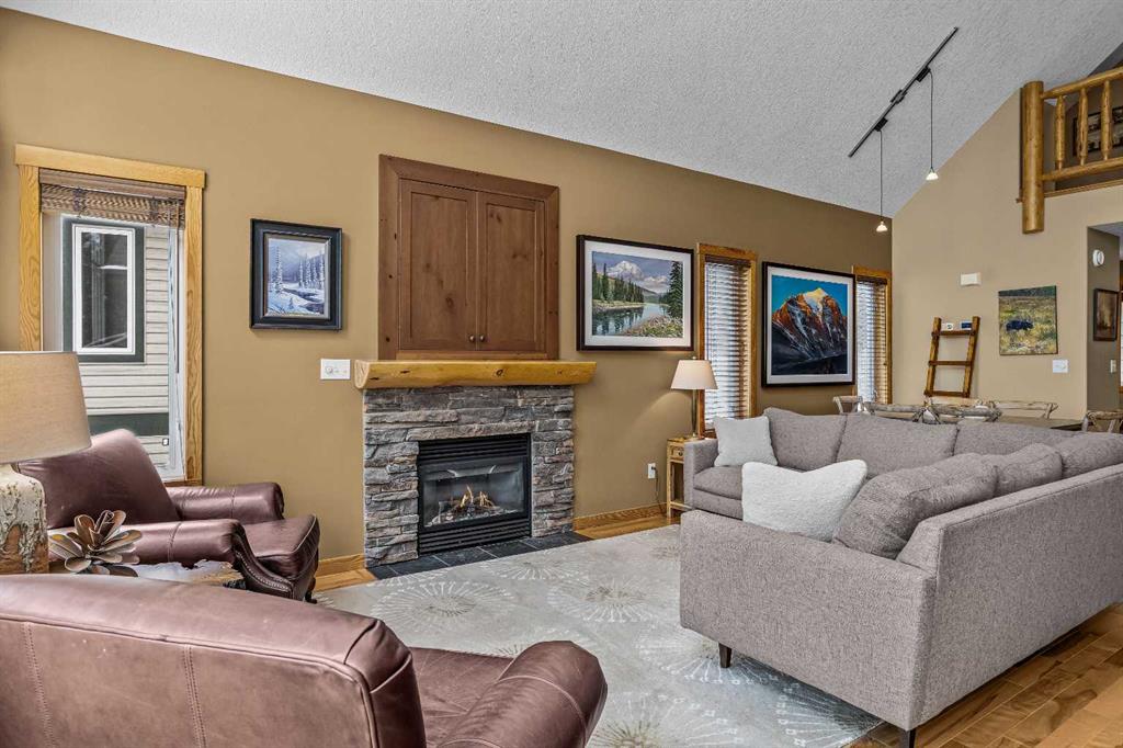 Inside, the home showcases classic Canmore finishes with warm hardwood flooring, vaulted ceilings, and large windows that flood the main living space with natural light. The open-concept main floor is thoughtfully designed, seamlessly connecting the kitchen, dining, and living areas, creating an inviting space for both everyday living and entertaining.