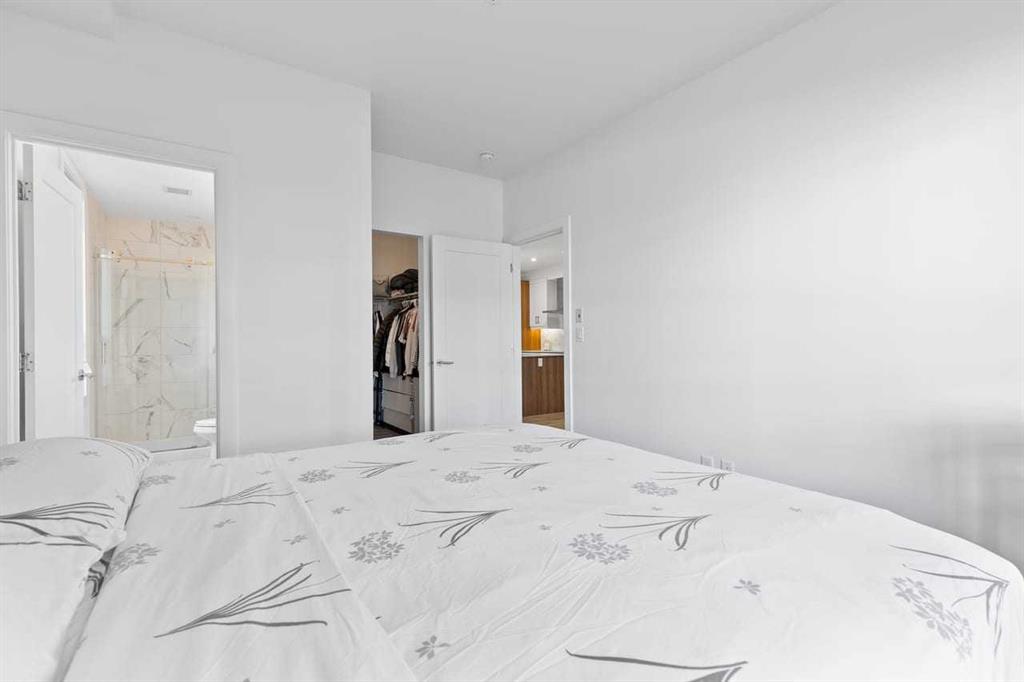 Looking for space + style? This 958 sq. ft. 2 bed/2 bath condo in Walden has tons of upgrades, 2 parking stalls, and a private deck with gate to green space. A true gem in the heart of the community! The unit can be accessed either through the main building entrance or via its own private ground-level entrance. The kitchen and bathrooms showcase custom tilework along with quartz island that comfortably seats four. A chimney-style range hood, counter-depth fridge, smooth cooktop, granite sink, pot lights, and under-cabinet lighting complete this stunning kitchen.