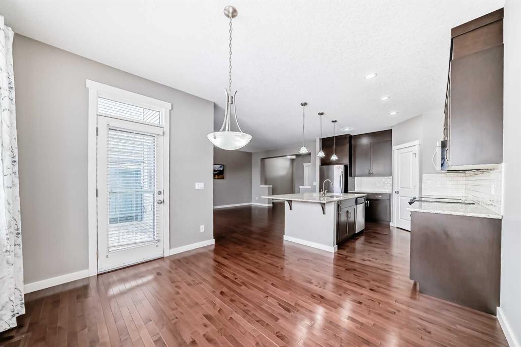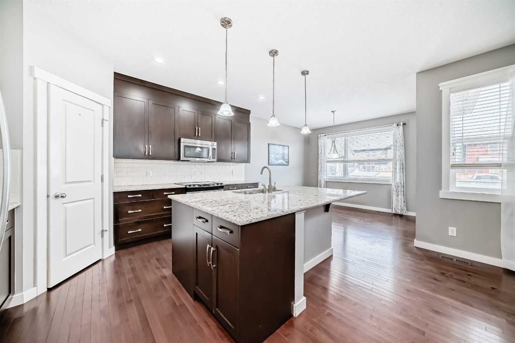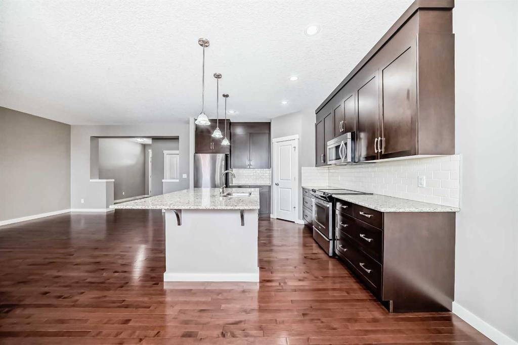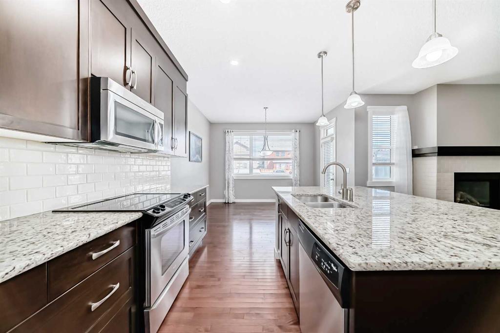 Discover this beautiful home fronts onto lush green space with direct access to ravine walking paths. The bright, open-concept main floor is bathed in natural light, beautifully illuminating the rich hardwood floors. In the heart of the home, a stunning tiled fireplace is flanked by expansive windows, creating an inviting living room perfect for relaxation. The chef-inspired kitchen is designed for both style and function, featuring a massive central island, high-end stainless-steel appliances, full-height cabinetry, and a generous walk-in pantry. An adjacent dining area, encased in windows, leads seamlessly to a tiered back deck, blending indoor comfort with outdoor entertaining. The upper level is designed for family life, anchored by a versatile bonus room that boasts tranquil green space views. The primary retreat offers a spa-like five-piece ensuite featuring dual sinks, a deep soaker tub, and a separate shower. Two additional spacious bedrooms share a clean, modern four-piece bathroom, while the laundry and powder rooms are privately tucked away for maximum convenience. An unfinished basement is a blank canvas with incredible potential to add value and living space to your home. Stepping outside, you will find a professionally landscaped oasis, a quaint patio, and a fully fenced grassy yard. The gas-line-equipped deck is perfect for hosting summer BBQs, while an oversized shed keeps your seasonal gear organized. Located in a vibrant, family-friendly community just steps from Fish Creek Park and Sikome Lake, this home offers unparalleled access to parks, playgrounds, and nature adventures.