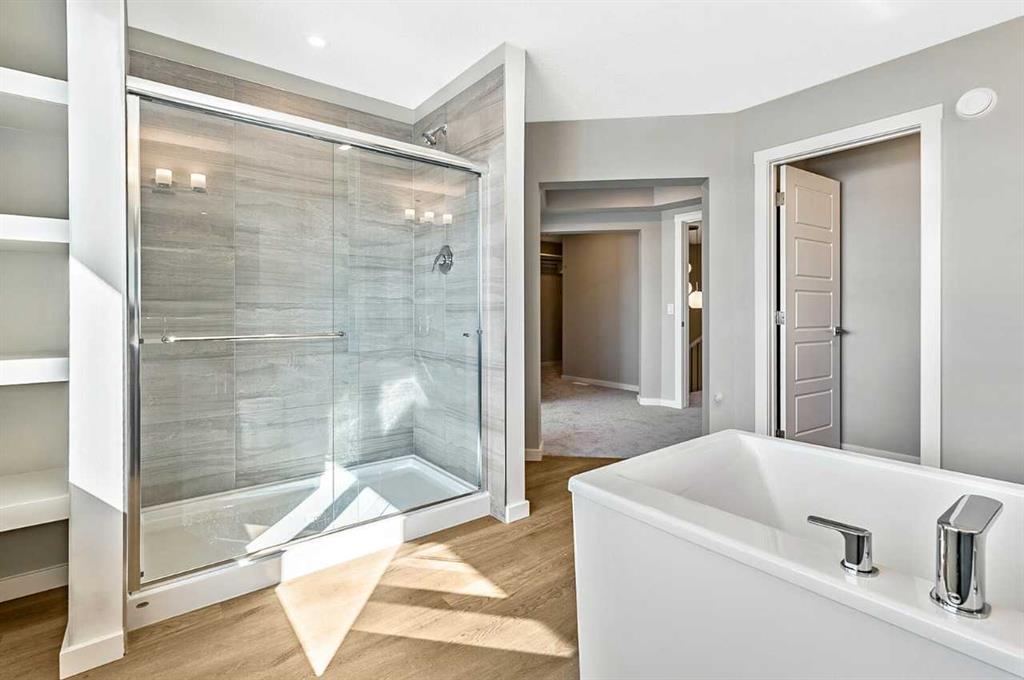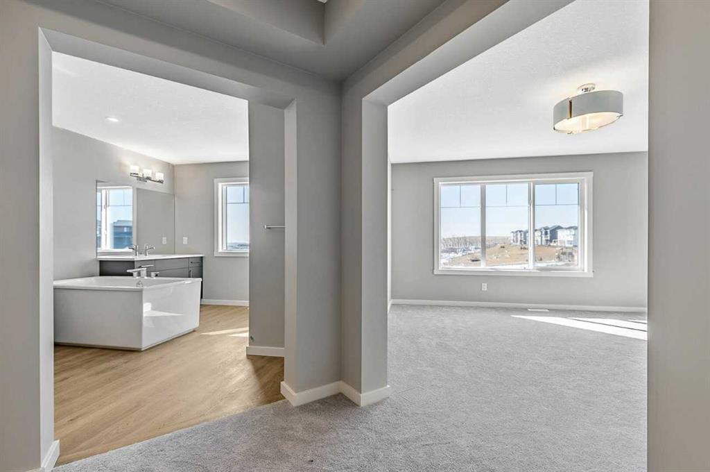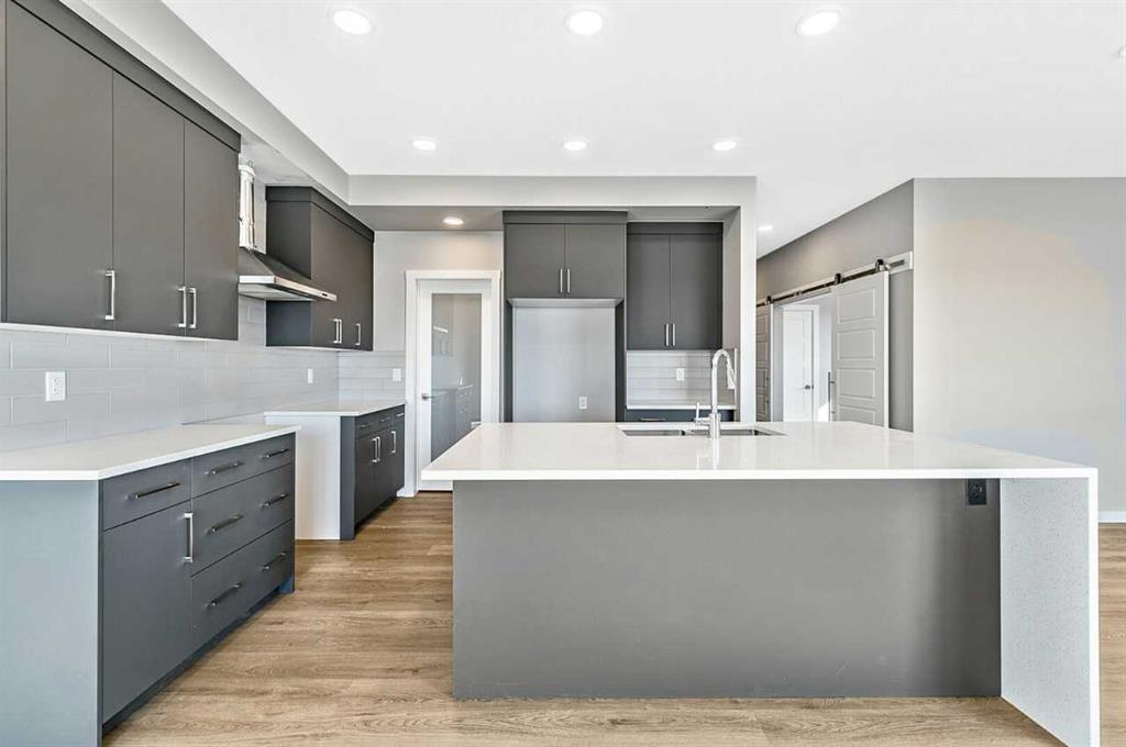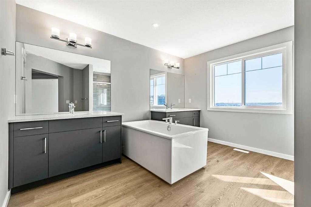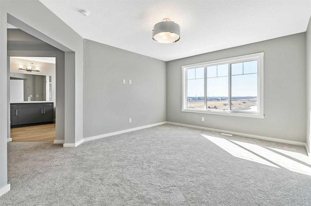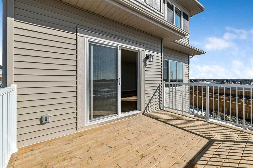 This home is located in the peaceful community of Key Ranch, Airdrie, Alberta. This beautiful two storey home sits on a spacious traditional lot and has no rear neighbors. It includes a walkout basement to the south facing backyard and includes a rear deck off the main floor, and patio off the walkout basement. This home has a spacious main floor flex room for an office or guests. The main floor boasts 9ft knockdown ceilings for a bright and open feel. Including high-end kitchen finishes such as; chimney hood fan, soft-close cabinets to the ceiling, quartz countertops, and an undermount sink. Primary bedroom retreat featuring a 5-piece ensuite with dual vanity sinks, free-standing soaker tub, walk-in shower with tiled walls, and a private water closet. Custom melamine shelving in the pantry and primary walk-in closet for optimal storage. Triple-pane windows, high-efficiency furnace, hot water tank, and HRV system for superior energy efficiency.
