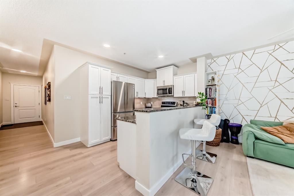 An executive tree house in the city – like living in Banff! A rare find – this spacious 865 sq ft one bedroom plus den in a concrete building is perfect for the outdoor enthusiast who loves to hike through the tranquil Griffith Woods (93 hectare nature park) along the Elbow River. Lovely updates – recessed lighting, white kitchen, granite countertops, stone fireplace with large mantle, covered balcony with a gas hook up for the BBQ. The Wedgewoods Fitness Centre is right across the hall. Private. Close to the mountains, amenities and 15 minutes to downtown. Well run complex.