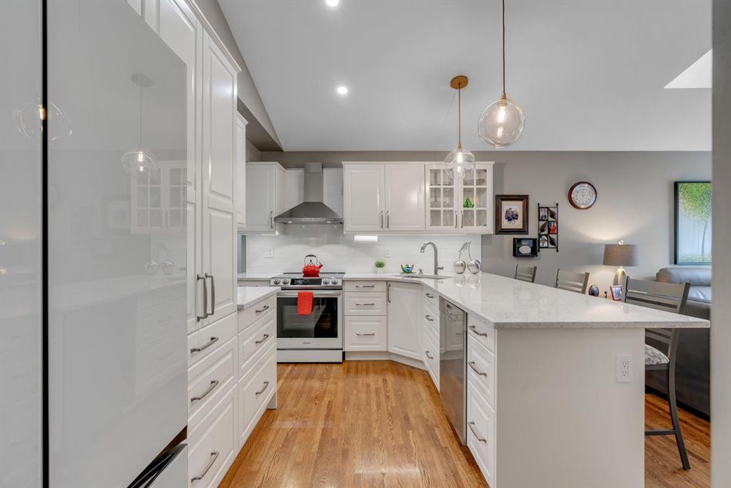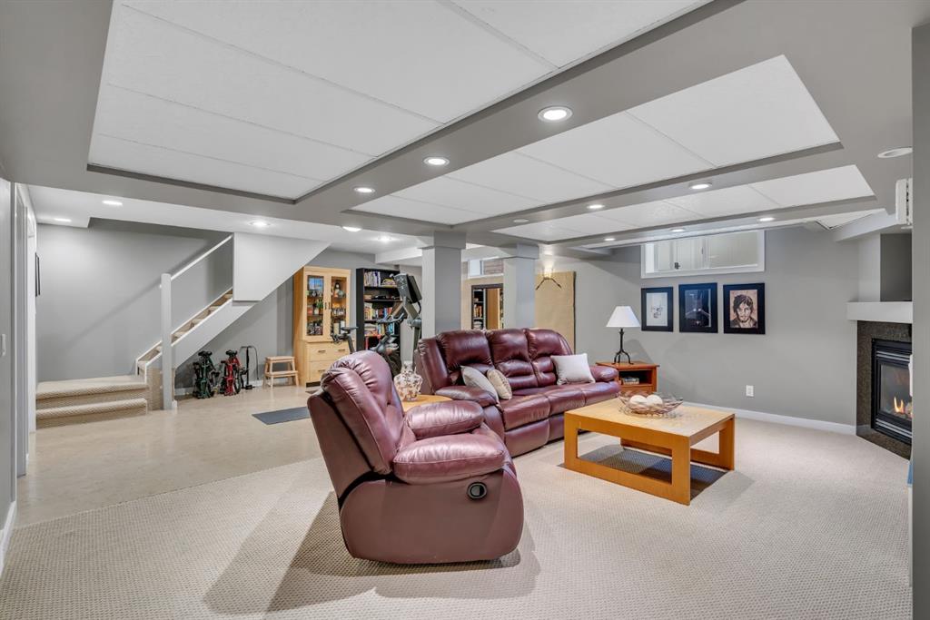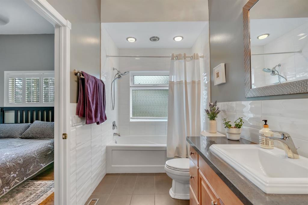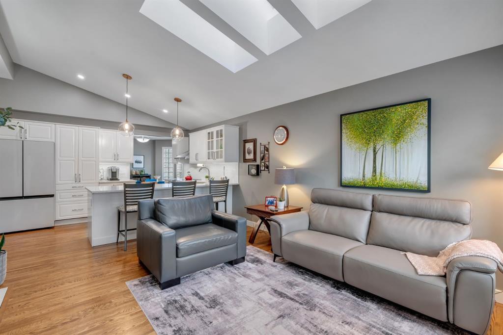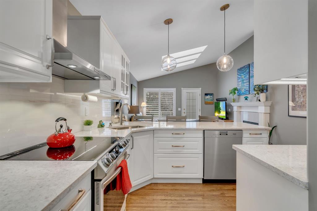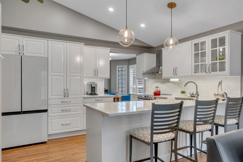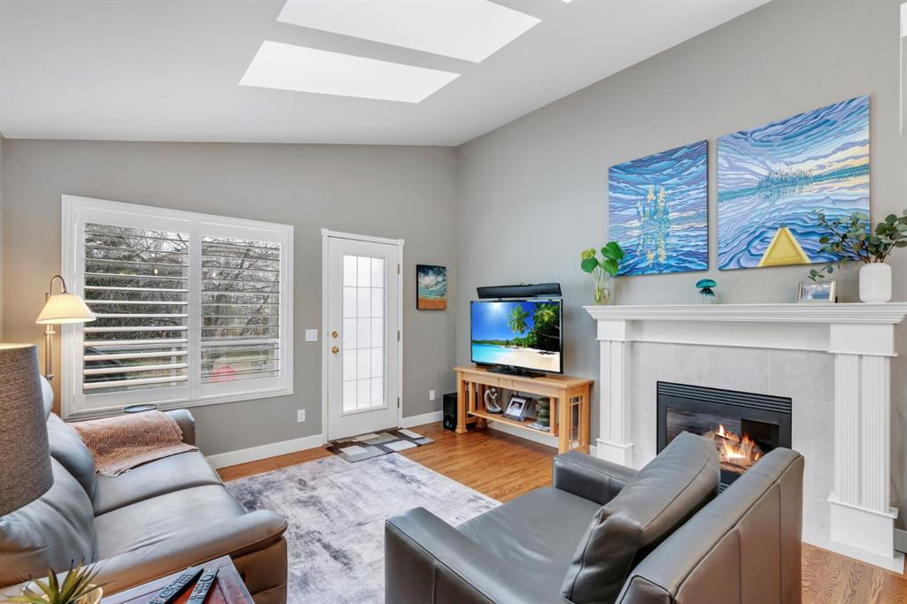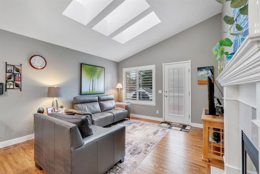This beautifully upgraded home backs onto greenspace with a sunny south backyard and offers true bungalow living with bonus space for guests or family. As you enter, the main level features soaring vaulted ceilings in the living and dining rooms, refinished hardwood floors throughout, and an upgraded white kitchen with quartz countertops, eating bar, under-cabinet lighting, pull-out drawers, a pantry with organizers, and a newer white glass front Samsung Bespoke fridge with beverage center and induction stove (2023) plus the nook has extra storage. The family room with skylights and beautiful gas fireplace with tile surround provides direct access to the no-maintenance deck overlooking the greenspace. The primary bedroom on the main floor offers the ultimate convenience—no stairs required—and includes a walk-in closet, updated ensuite with new shower and soaker tub and heated floors. It also provides deck access. A main floor den/office, powder room and laundry room complete this ideal layout. Upstairs, the loft is perfect for a reading area or office and the additional bedroom with walk-in closet and ensuite make the perfect private space for older kids, guests, or extended family. The developed basement adds even more versatility with two additional bedrooms (one with a built-in Murphy bed), bathroom with shower, a spacious rec room with a gas fireplace, workout area with cork flooring and plenty of storage. Additional updates and features include: air conditioning, all Poly-B replaced, California shutters, new garage door (2023), newer furnace (2019), extra-wide driveway, gas BBQ line on the deck and backyard shed. This home truly combines the ease of bungalow living with the flexibility of additional space — a rare and truly special find in Riverbend! Ideally located on one of the community’s best streets, it backs directly onto greenspace and is just a short walk to the Bow River pathways, Quarry Park amenities, and offers quick access to Glenmore Trail and Deerfoot- don’t miss out on this great home!