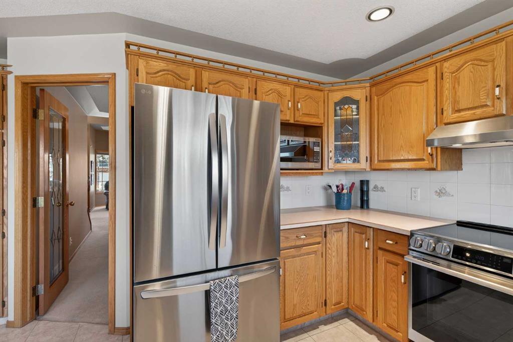 Backing West onto a winding urban environmental reserve is this mint-condition two storey in the highly sought-after estate community of Hamptons. Custom-crafted for the builder, this truly wonderful home enjoys a total of 5 bedrooms & 4 full bathrooms, glistening tile floors & oak woodwork, 2 fireplaces, oversized 2 car garage & a host of updates including new furnaces, metal roof, hot water tank & new PEX plumbing. Perfectly designed with the family in mind, you will love the inviting design & flow of this beautiful home, which features the gracious living room with bow window & soaring vaulted ceilings, elegant open concept formal dining room & spacious West-facing family room with brick-facing fireplace, built-ins & views of the backyard. The bright & sunny kitchen is loaded with cabinets & counterspace, & comes complete with phone desk, dining nook with access to the backyard deck & upgraded appliances including stainless steel Miele dishwasher & brand new LG stove (2026) & LG fridge (2026). Upstairs there are 3 great-sized bedrooms & 2 full bathrooms, highlighted by the oversized owners’ retreat with big bow window, large walk-in closet & gorgeous ensuite – renovated in 2022 – with tile floors, oversized glass shower, free-standing soaker tub & quartz-topped double vanities. The other 2 bedrooms each have their own private balconies & share a Jack & Jill-style bathroom with 2 sinks. The lower level is finished with another bedroom & bathroom with steam shower, cold room with built-in shelves & fantastic rec room with built-in shelving, lounge with gas stove fireplace & home office with built-in desk & shelving. The main floor also has your laundry room with LG washer & dryer, another bedroom (or home office) & bathroom with shower. Additional features & extras include a 2nd floor loft overlooking the living room, oversized garage with built-in storage, fenced backyard with gate to the reserve & deck with under-deck storage & new covering/glass/railings (2020), underground sprinklers & in addition to the new PEX plumbing (2025), new furnaces (2024), water tank (2019) & metal roof (2011 with transferrable lifetime warranty), there is newer cladding on the windows (2012), new garage door (2016), 3 new toilets (2022), 2nd floor window blinds (2022), landscaping (backyard & side in 2021) & vinyl decking on the 2 upper balconies (2020). A truly incredible home you will be proud to call your very own, here on this quiet crescent within walking distance to the Hamptons Park tennis courts & bus stops, just minutes to the Hamptons School & local shopping plus quick easy access to highly-rated schools & major retail centers, Crowfoot Centre & LRT, University of Calgary, hospitals & downtown.