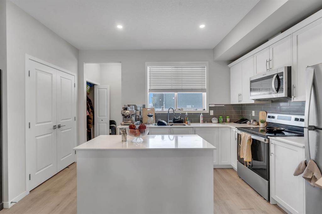 The bright and inviting main floor welcomes you with a spacious living area that flows effortlessly into the dining space, creating the perfect setting for family time and entertaining. At the rear of the home, the upgraded kitchen offers both privacy and functionality, complete with stainless steel appliances, quartz countertops, a stylish backsplash, ample cabinetry, a large walk-in pantry, and an oversized island ideal for meal prep, casual dining, and gatherings.