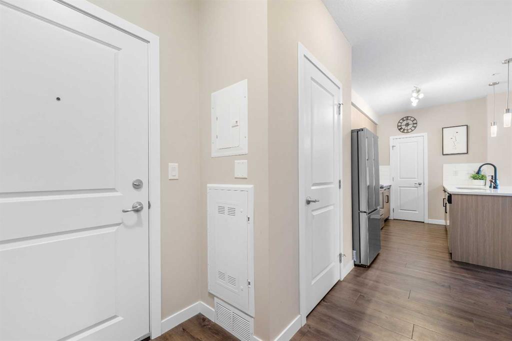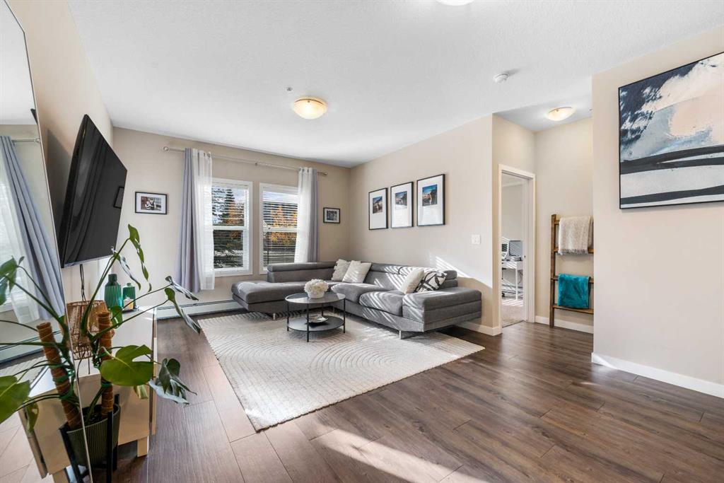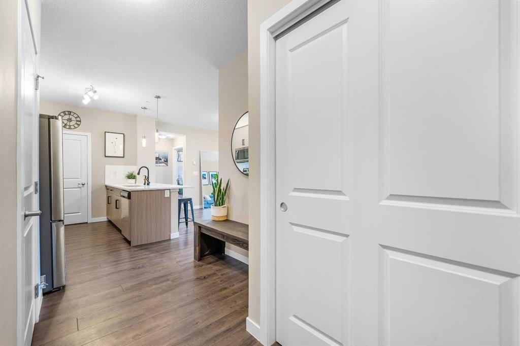 Welcome to your new home, a stunning 2-bedroom, 2-bathroom condo offering over 900 square feet of beautifully designed living space. True pride of ownership visible throughout, featuring a spacious open-concept layout with 9-foot ceilings and an abundance of natural sunlight pouring through large south-facing windows. The modern kitchen is complete with sleek quartz countertops, stylish cabinetry, stainless steel appliances, and a large walk-in pantry. The generously-sized breakfast bar comfortably seats four. The open living room with its luxury vinyl plank flooring offers plenty of room to create your ideal living area. The primary suite is designed as a private retreat, featuring a spacious walk-through closet and a 4-piece ensuite. The second bedroom is versatile and can serve as a guest room, workout space or home office. The second bedroom is conveniently located next to a second 4-piece bathroom, providing ideal privacy and functionality. For added convenience, this home includes an in-suite full-size stackable washer and dryer, as well as a dedicated storage locker inside the building. Step outside to your spacious balcony — the perfect spot for morning coffee or unwinding after a long day. No neighbours behind lead to both extra privacy and a more peaceful space. With an assigned parking stalls and plenty of visitor parking, plus a common playground in the courtyard, this condo provides comfort, convenience. The quiet, family-friendly building is situated in the sought-after community of Cranston, offering a wide range of amenities and recreational opportunities for all ages. Enjoy easy access to numerous parks, walking paths, and the breathtaking Fish Creek Park and Bow River. Residents will appreciate being just minutes from shopping, a movie theatre, and the South Health Campus. Cranston also boasts excellent schools, including 3 public and 2 Catholic schools, and is minutes away home to the largest YMCA. Commuting is a breeze with quick access to Deerfoot Trail, Stoney Trail, and public transit just minutes away. Don’t miss out on this incredible opportunity—schedule your showing today!