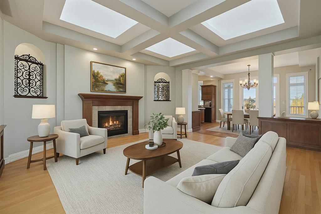 This immaculate, original-owner walkout bungalow offers over 3,600 sq.ft. of beautifully maintained living space and backs directly onto one of Heritage Pointe’s most tranquil treed ravines. No rear neighbours, just peaceful, year-round views. The main floor welcomes you with a bright, open layout featuring a coffered-ceiling and skylights in the great room, a spacious kitchen with a large island opening onto the dining area, and access to a covered upper balcony. A perfect spot for outdoor dining or relaxing while taking in the serene surroundings. The primary suite is a lovely. There is reading/office nook overlooking the ravine, a four-piece ensuite, walk-in closet and plenty of room for king-size bedroom furniture. A spacious mudroom, laundry area, and two-piece bath complete the main level. A fully finished walkout lower level is designed for comfort and entertaining. Boasting in-floor heating, a wet bar, two additional bedrooms, a large rec/media room, a full bathroom, and walkout access to the patio and beautifully landscaped yard. A triple attached garage offers ample space for vehicles, storage, and hobbies. Heritage Pointe residents enjoy summer beach days, winter skating, and year-round family activities such as pickleball and hiking clubs. The community hosts numerous events and activities throughout the year, creating a welcoming and connected atmosphere that makes life here both easy and enjoyable. An incredible opportunity to call this beautifully maintained bungalow home in one of Heritage Pointe’s most special and serene locations.