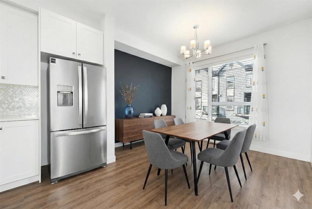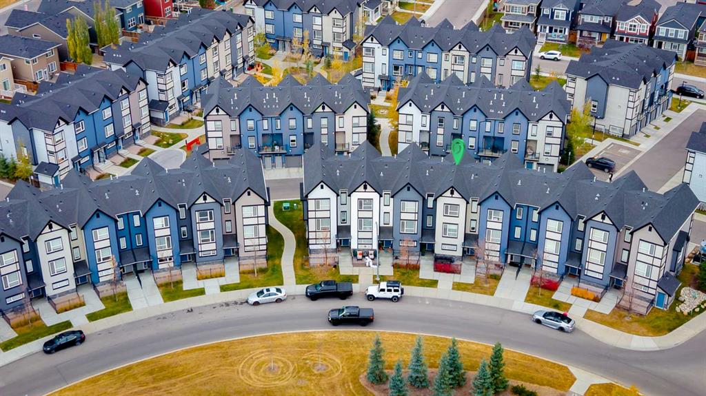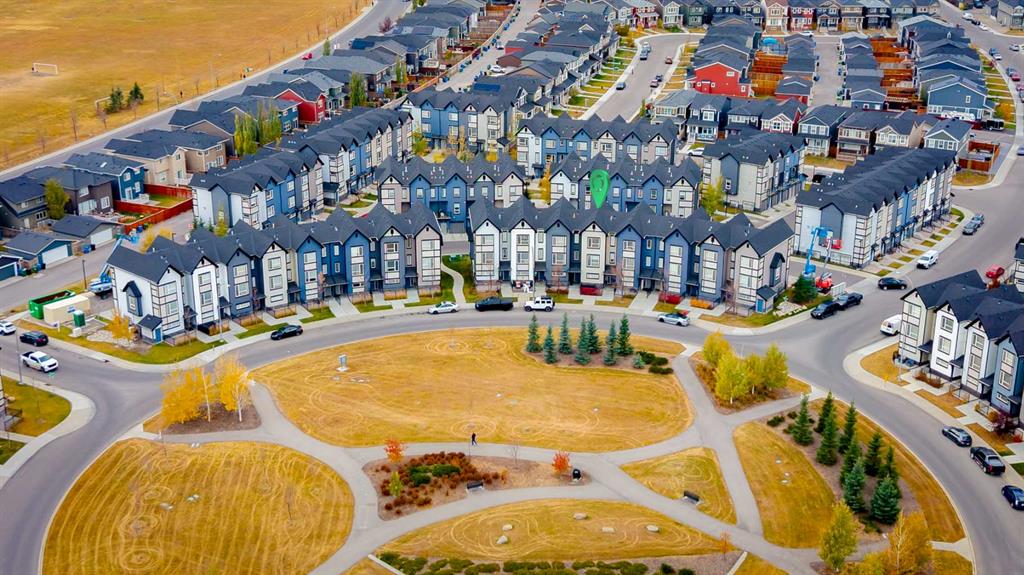 Welcome to this beautifully designed 3 bedroom, 2.5 bathroom townhouse, ideally located in the sought-after community of Evanston in NW Calgary. Perfectly positioned facing a picturesque circular park, this home offers a blend of thoughtful layout, modern finishes, and everyday convenience. The entry level welcomes you with a spacious foyer featuring direct access to the finished double tandem garage, finished with durable epoxy flooring and including dedicated utility and storage areas, providing both function and organization. From here, step outside to enjoy a private ground-level patio, ideal for relaxing, gardening, or entertaining. Additional parking available on the single driveway, ample visitor parking as well as convenient street parking in front of the home. Upstairs, the main living level showcases an open-concept design that seamlessly connects the living room, dining area, and kitchen. The centrally located kitchen is the heart of the home, anchored by a large quartz island and complemented by abundant cabinetry, multiple pantry spaces, and stainless steel appliances. On one side of the kitchen, the bright and inviting living room features large windows that flood the space with natural light and provide access to a balcony, perfect for morning coffee or evening downtime. On the opposite side, the dining area offers plenty of room for hosting family dinners or gatherings with friends. A convenient 2-piece powder room completes this level. The upper floor is thoughtfully arranged to maximize privacy and comfort. The primary suite is situated at one end and features a walk-in closet and a private 3-piece ensuite. On the other end, two additional well-sized bedrooms – one with a walk-in closet—share a full 4-piece bathroom. A convenient upstairs laundry area adds to the practicality of the layout, making daily routines effortless. Additional features include air conditioning for year-round comfort and a location that truly sets this home apart. Enjoy walking-distance access to Evanston’s shopping, schools, and nearby soccer fields, along with quick and easy connections to Stoney Trail for commuting around the city. This move-in-ready townhouse offers a rare combination of park-facing views, modern finishes, and an unbeatable location – an excellent opportunity to call Evanston home.