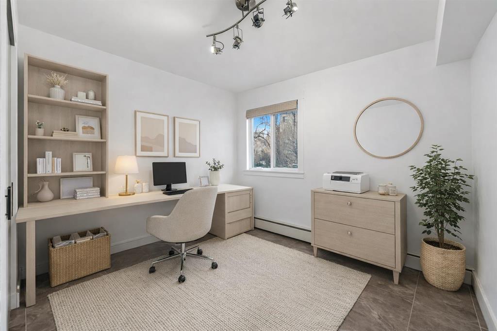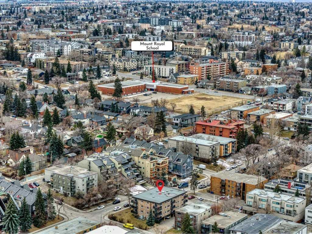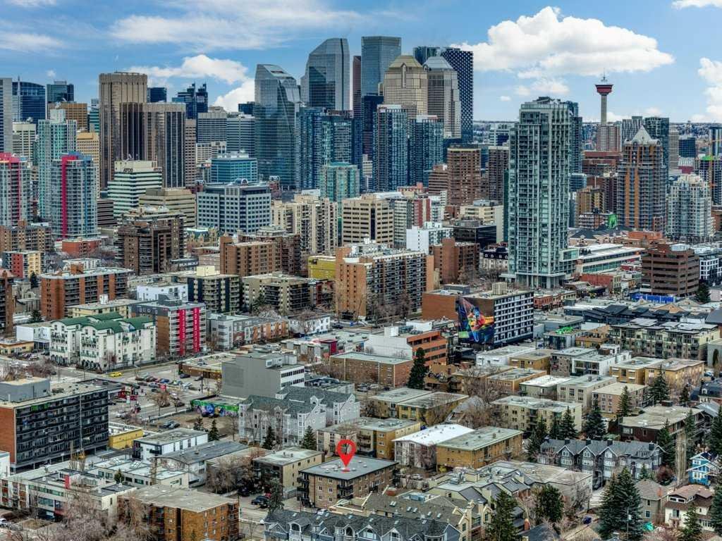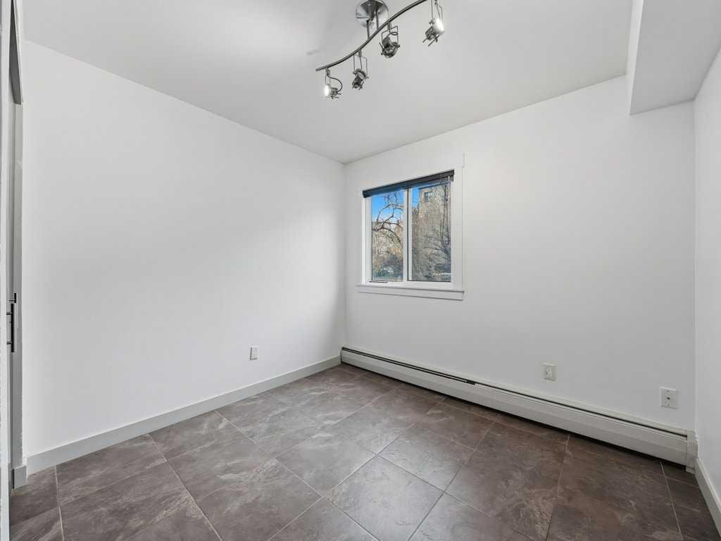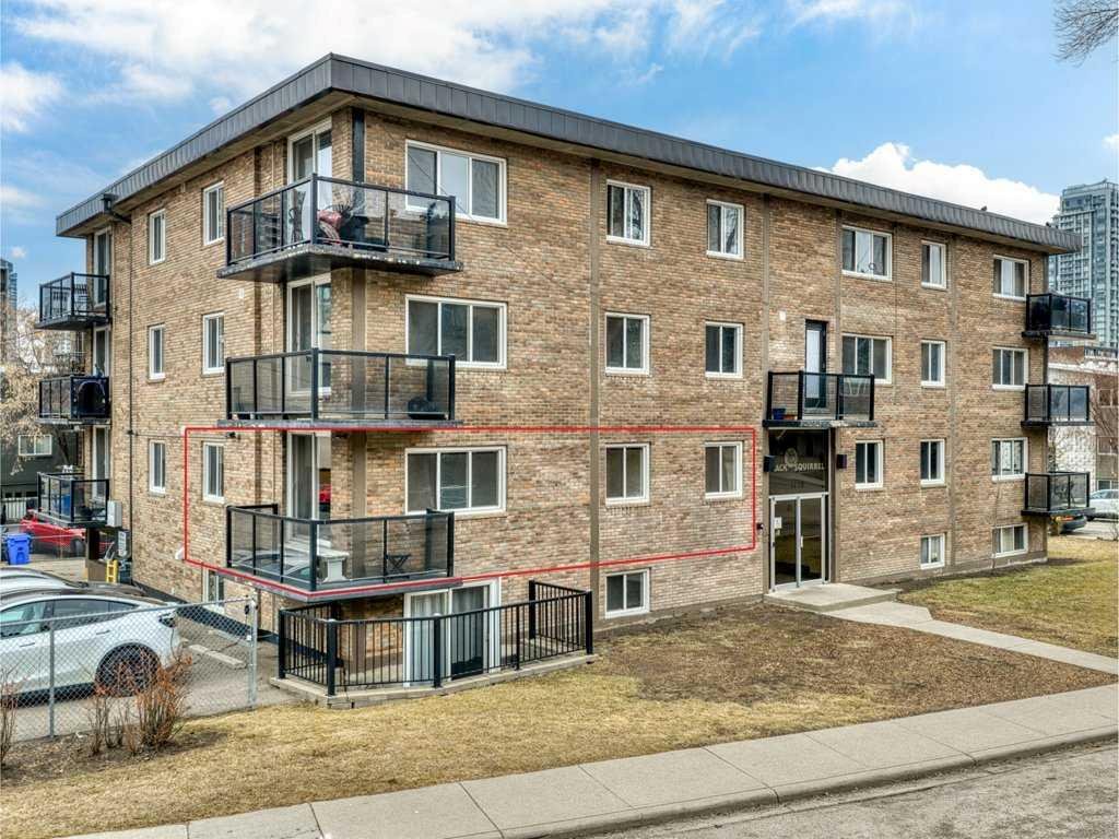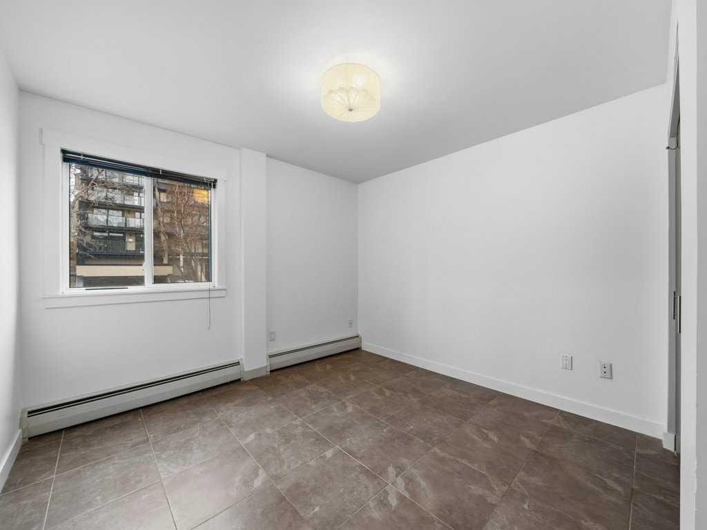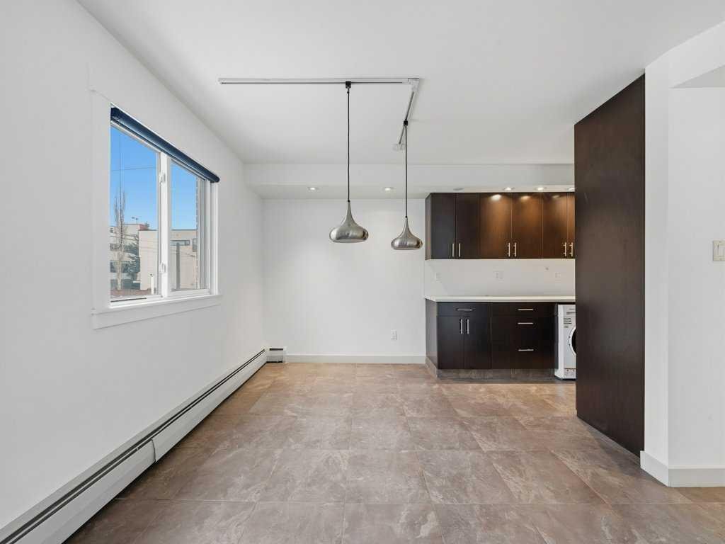 Vacant and available for immediate possession, this bright 2-bedroom, 1-bathroom condo offers an exceptional opportunity to enjoy life in one of Calgary’s most sought-after inner-city neighbourhoods. Ideally located in Lower Mount Royal on prestigious Cameron Avenue SW, this second-floor end unit offers added privacy, excellent natural light, and an unbeatable walkable lifestyle just steps from the shops, restaurants, cafés, and energy of 17th Avenue. Freshly painted and impeccably maintained, the home features attractive low-maintenance tile flooring throughout for a clean, cohesive look. The kitchen is well equipped with quartz countertops, rich maple shaker cabinetry, stainless steel appliances, an all-in-one washer/dryer, and generous prep space. The bathroom is equally well finished with quartz counters and a soaker tub. The spacious primary bedroom is complemented by a versatile second bedroom that works well for guests, a roommate, or a home office. Additional highlights include a private wraparound balcony, covered assigned parking conveniently located near the rear entrance, and a stylish, secure main entrance with beautiful character tilework. This pet-friendly building was extensively renovated in 2008 with updated windows and balconies, and also features a new roof completed in 2024. Exceptional value in a highly desirable inner-city location.