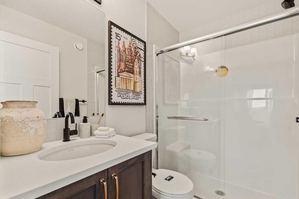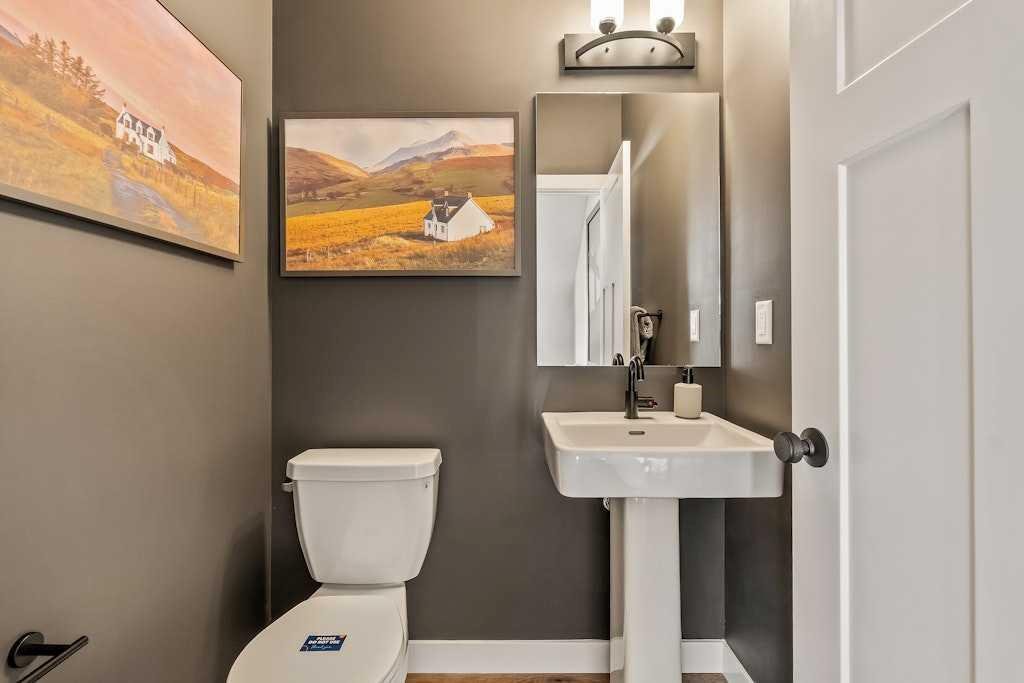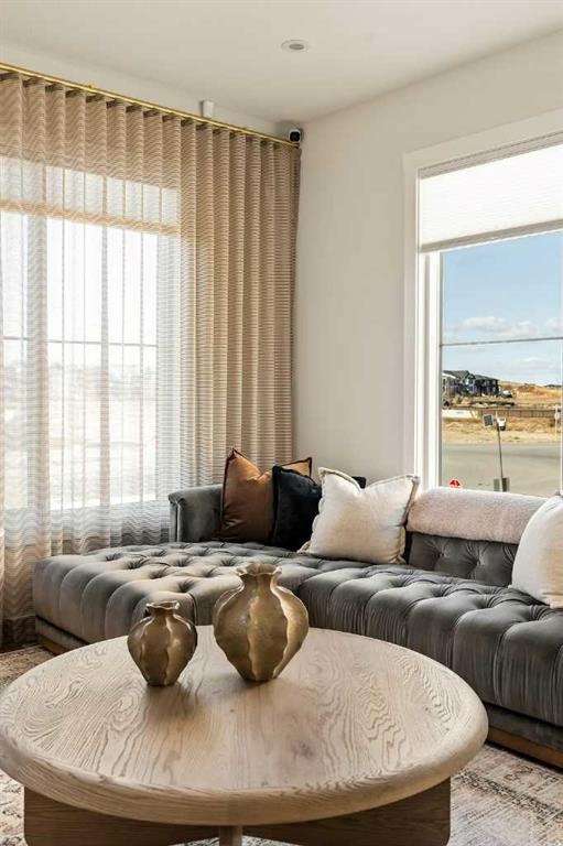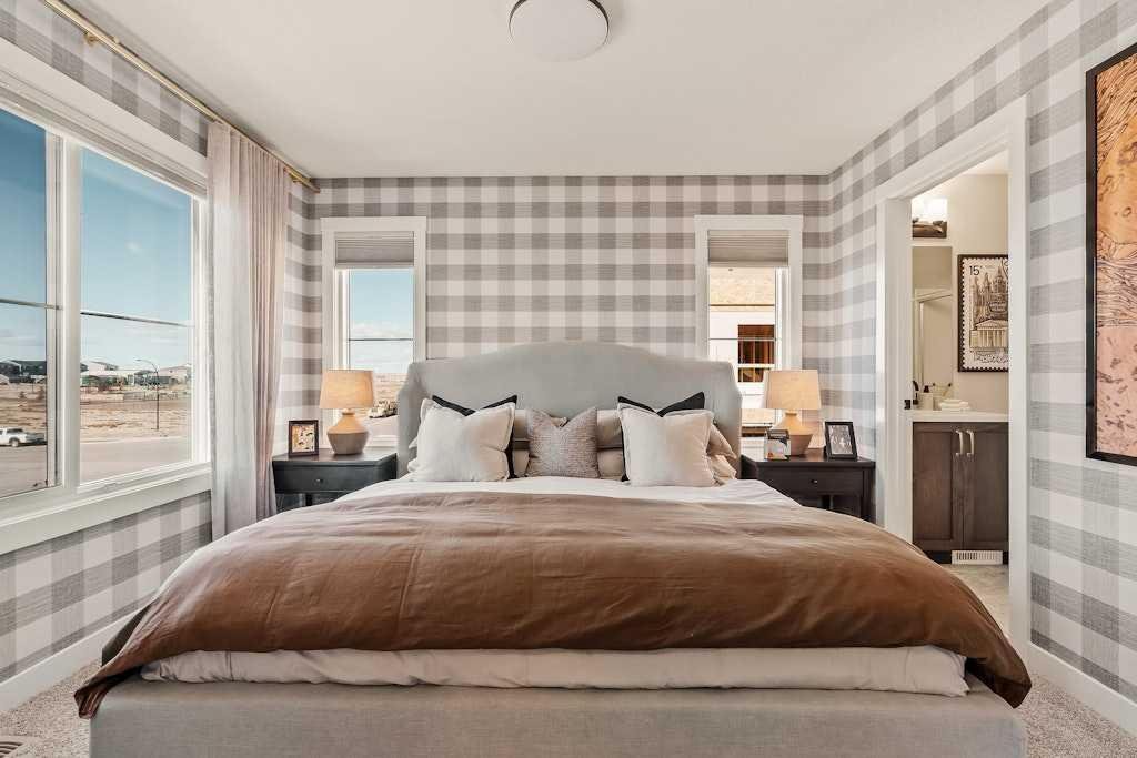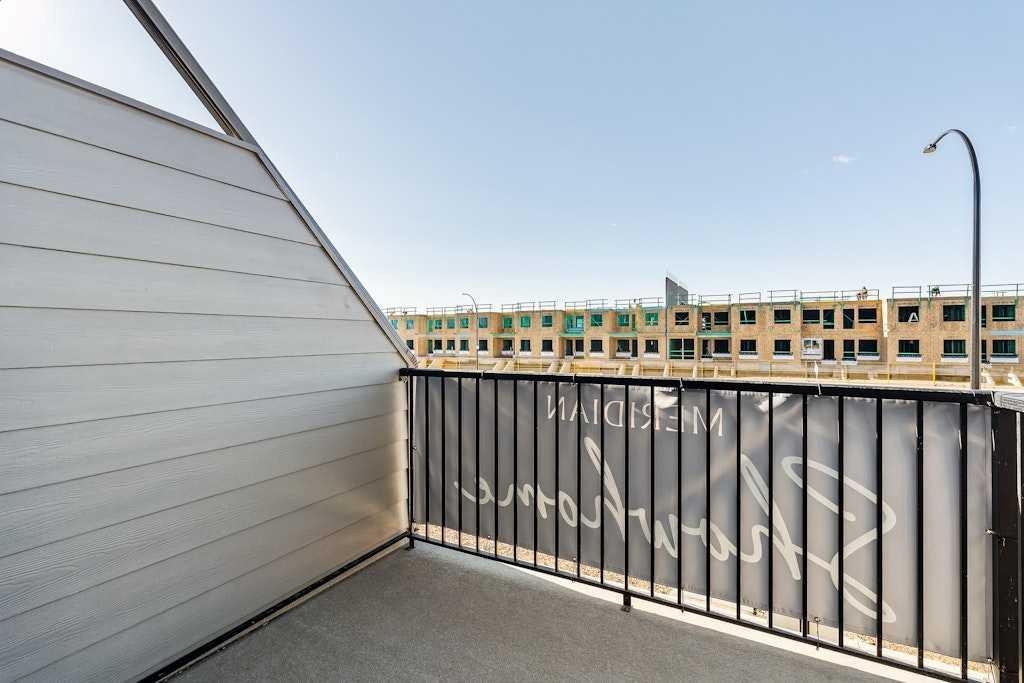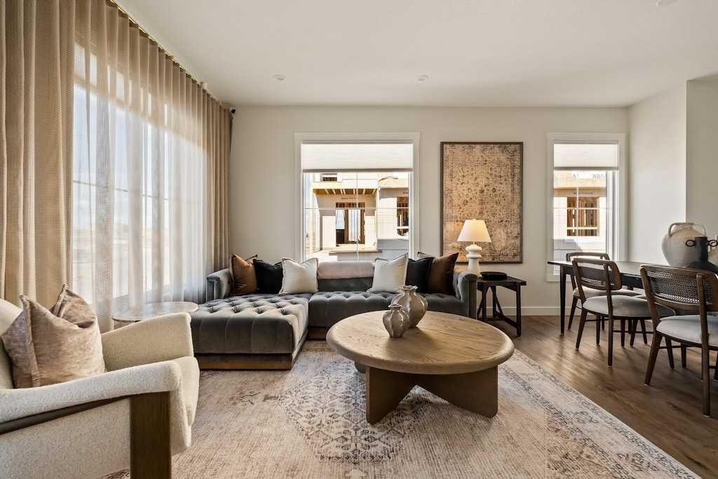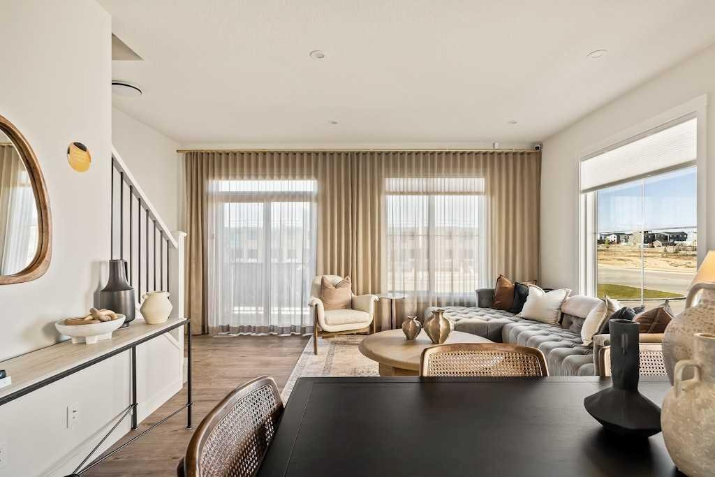 The brand new ‘Holiday’ model by Brookfield Residential is now available for immediate possession in the vibrant community of Livingston! This brand-new END-UNIT townhome blends contemporary design with everyday functionality, offering over 1,400 sqft, 3 bedrooms, 2.5 bathrooms, a ground-floor flex/office space, and a private double attached garage – all in one of north Calgary’s most desirable master-planned neighbourhoods. The open-concept main floor showcases a timeless kitchen featuring full-height cabinetry, elegant quartz countertops, a built-in hood fan and microwave, and a premium stainless-steel appliance package. The oversized island with pendant lighting provides the perfect place for casual dining or entertaining. The kitchen flows seamlessly into the bright living and dining areas, highlighted by a wall of windows that flood the space with natural light. Enjoy extra windows and additional natural light – a perk of owning the end-unit townhome! Step out onto your private East-facing balcony overlooking the green space – ideal for summer BBQs or a morning coffee while providing optimal sunshine all year long. A large laundry room with additional storage and a convenient 2-piece powder room complete the main level. The upper level features a spacious ~11’ x 12’ primary suite which includes a walk-in closet and a private ensuite with walk-in shower, offering a relaxing retreat at the end of the day. Two additional bedrooms and a full bathroom complete the upper floor, providing plenty of room for family, guests, or a home office. On the lower level, a versatile den off the entryway and private double attached garage offers endless flexibility – the perfect space for a home office, gym, or creative space. The private double attached garage keeps your vehicles warm and secure all year long. This home includes numerous upgrades such as central A/C rough-in, a BBQ gas line + gas line to the kitchen range, 42” upper cabinets, and an enhanced interior selections package. Backed by both Brookfield’s comprehensive builder warranty and Alberta New Home Warranty, this property offers complete peace of mind. Set in Livingston, a dynamic north Calgary community known for its impressive Homeowners Association, state-of-the-art Hub facility, parks, playgrounds, and convenient access to major routes – this is the perfect place to call home. If you’re looking for a low-maintenance townhome that combines style, functionality, and quality craftsmanship – welcome to the Holiday by Brookfield Residential in Livingston. *Please note: Photos are for representation purposes only, and exact finishes may vary.