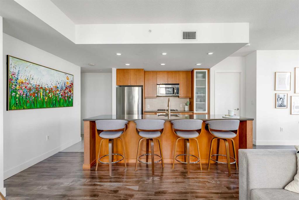 Impeccably designed and move-in ready, this stunning END UNIT in the heart of the BELTLINE offers a rare opportunity to purchase a FULLY FURNISHED home showcasing high-end pieces from POTTERY BARN and WEST ELM. Every item inside is included, creating a seamless, stylish, and effortless transition for the new owner. Expansive FLOOR-TO-CEILING WINDOWS frame sweeping CITY VIEWS, filling the open-concept living space with natural light. A PRIVATE FOYER introduces the thoughtfully designed layout, where the living room separates both bedrooms for OPTIMAL PRIVACY. The spacious living area invites relaxation with contemporary furnishings, while the dining room opens through patio sliders to a COVERED BALCONY, perfect for indoor-outdoor entertaining. A GALLEY-STYLE KITCHEN features FULL-HEIGHT CABINETRY, QUARTZ COUNTERTOPS, STAINLESS STEEL APPLIANCES, and a LARGE ISLAND with an EATING BAR that comfortably seats four. The PRIMARY BEDROOM offers a true retreat with a WALK-THROUGH CLOSET leading to a luxurious 5-PIECE ENSUITE complete with DUAL VANITY, STAND-UP SHOWER, and SOAKER TUB. A SECOND BEDROOM with DUAL CLOSETS connects to a 3-PIECE ENSUITE that doubles as a guest bath. Enjoy the convenience of IN-SUITE LAUNDRY, NEW WASHER & DRYER, and an oversized TITLED PARKING STALL located on P-1 (STALL #53). A separate ASSIGNED STORAGE LOCKER provides additional space for seasonal items. Step outside to a COVERED BALCONY with included PATIO FURNITURE and BBQ, all overlooking Calgary’s ever-evolving skyline. Building AMENITIES elevate daily life with a FULL-TIME CONCIERGE, FITNESS CENTRE with STEAM ROOM, PARTY ROOM/OWNERS LOUNGE, LANDSCAPED COURTYARD, RENTABLE GUEST SUITE, VISITOR PARKING, and SECURE BICYCLE STORAGE. Ideal for professionals, investors, or those seeking a low-maintenance urban lifestyle, this residence combines design sophistication with everyday functionality in one of Calgary’s most vibrant downtown communities.