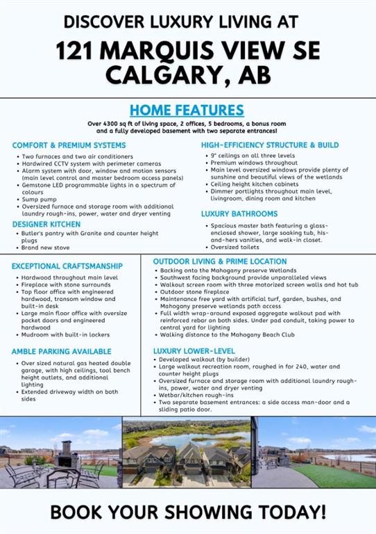 BREATHTAKING VIEWS | OVER 4,300 SQ FT | SW-FACING BACKYARD BACKING ONTO WETLANDS. Discover elevated living in this executive 5-bedroom residence, offering over 4,300 sq ft of beautifully developed space, including a fully finished WALKOUT basement with two separate entrances. Nested in a quiet cul-de-sac on the prestigious Mahogany Preserve peninsula, this exceptional home backs directly onto the Mahogany Wetlands-74 acres of breathtaking natural scenery and pathways-delivering unparalleled views and year-round natural beauty. Designed with impeccable craftsmanship and elevated by high-end finishes and 9-foot ceiling throughout, this one-of-a-kind estate also features LOW-MAINTENANCE LANDSCAPING, programmable GEMSTONE LED lighting, an OVERSIZED doubled attached HEATED garage, and an extended driveway at both ends. With two dedicated offices and a spacious bonus room, the home effortlessly balances luxury, functionality, and modern living. A grand foyer welcomes you into the open-concept main floor, where expansive windows frame stunning wetland views. The elegant living and dining areas flow seamlessly into a chef-inspired kitchen, complete with a large island and a butler’s pantry for added prep and storage. A private main-floor office is ideal for working from home, while the walk-through pantry connects directly to the mudroom and garage. A powder room completes this level. Upstairs, the thoughtfully designed layout includes a luxurious primary retreat with a walk-in closet and spa-inspired ensuite. Three additional bedrooms offer ample space for family, complemented by a full bathroom, a generous bonus room, and a second office. A conveniently located upper-level laundry room adds everyday ease. Step outside to your private outdoor oasis. Enjoy breathtaking sunsets, local wildlife, and serene wetland views from the southwest-facing backyard. Designed for low-maintenance living, the outdoor space features artificial turf, a garden, and a full-width exposed aggregate walkout patio. The screened walkout room with motorized walls and a hot tub creates the ultimate retreat. The upper deck gas hookup makes entertaining and BBQing effortless. Perfectly located, this home is just a short walk to the lake, Beach Club, playgrounds, and two elementary schools. Embrace the vibrant, year-round lifestyle Mahogany is known for—from kayaking, paddleboarding, and beach days in the summer to skating, hockey, and cozy fireside gatherings in the winter. Whether you’re seeking four-season adventure or a low-maintenance, lock-and-leave lifestyle, this exceptional property offers the best of both worlds.