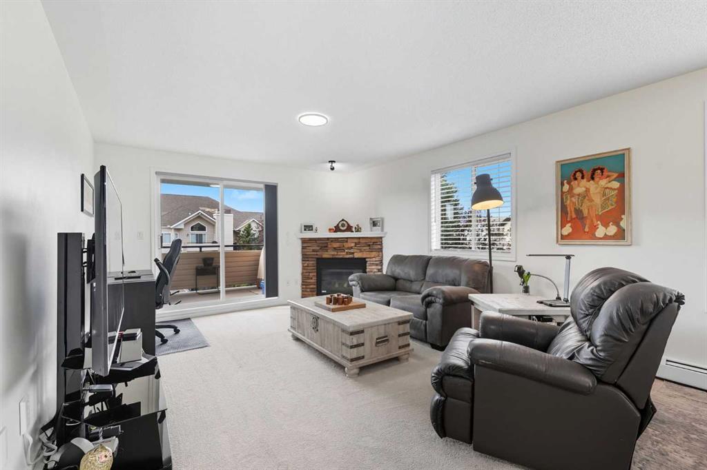 Set in the desirable Springbank area, this corner unit, updated 2-bedroom, 2-bathroom condo delivers an ideal balance of style, comfort, and everyday practicality. Offering over 1,100 sq. ft. of living space, this home has been thoughtfully improved with both recent and past upgrades that ensure it feels fresh, modern, and move-in ready. The spacious, open-concept layout allows for an effortless flow between living, dining, and kitchen spaces. A corner gas fireplace and baseboard heaters create a warm and welcoming atmosphere, while the south-facing balcony draws in abundant natural light. Measuring an impressive 12′ x 9’7″ , the covered balcony is an inviting retreat for outdoor dining or relaxing in the sun. Equipped with a gas BBQ hookup and a storage room, it extends your living space and enhances functionality. The kitchen has seen stylish updates, including a new countertop, along with a new fridge and microwave range hood fan combo added just last month. Complemented by modern lighting, and a convenient breakfast bar, the kitchen is both practical and appealing. Every room in the unit has been freshly painted, adding to the bright, clean feel. The primary bedroom is a private retreat featuring a walk-in closet and a full ensuite complete with soaker tub and separate shower. The second bedroom is thoughtfully positioned on the opposite side of the unit, offering privacy for guests or family, with a second full bathroom close by. Additional highlights include new in-suite washer and dryer just purchased in December 2025, newer carpeting, updated light fixtures, and fresh details throughout, making the space feel current and well cared for. This property also comes with 2 titled underground parking stalls, an extra storage locker, and access to a secured bike storage room in the parkade. The building itself is well-constructed with a mix of stone and vinyl siding, supported by a durable wood frame, and has been well maintained by a diligent condo board. With quick access to major roadways and the new Ring Road, commuting is straightforward, and the location offers excellent proximity to both city amenities and mountain getaways. This is a fantastic opportunity to own a spacious, upgraded condo in a well-run complex — one that combines convenience, value, and lifestyle. Arrange your showing today and see why this home stands out.