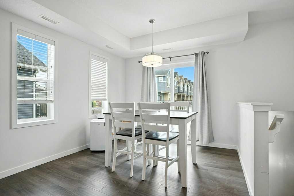 Welcome to this beautifully appointed 2-bedroom, 1-bathroom raised townhome in the vibrant community of the Canals. Offering a thoughtful layout with 9 ft knockdown ceilings and an abundance of natural light, this home feels open and inviting from the moment you step inside. The bright kitchen is designed with both style and function in mind, featuring quartz countertops, stainless steel appliances, ample cabinet space for storage, and modern pendant lighting over the island. The dining area is perfectly positioned beside large windows, creating a warm and welcoming space for everyday meals or entertaining guests. The spacious living and dining areas flow seamlessly onto a huge elevated deck, providing plenty of room for relaxing outdoors, enjoying summer barbecues, or simply taking in the fresh air. Both bedrooms are generously sized with easy access to the well-appointed 4-piece bathroom. Additional highlights include laminate flooring throughout, a modern colour palette, and an overall design that blends comfort with convenience. The ground floor features a welcoming foyer and a single attached garage. Very well maintained condo complex, beautifully maintained grounds & landscaping and visitor parking throughout the complex. Located in one of Airdrie’s most sought-after communities, this property is within walking distance to schools, soccer fields, churches, and picturesque ponds. Whether you’re a first-time buyer, downsizing, or looking for a smart investment, this home offers excellent value in a prime location with easy access to amenities, parks, and pathways. Don’t wait, call your favourite realtor and book a showing today!
