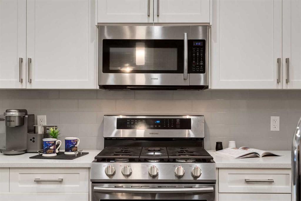 The KITCHEN is truly the HEART OF THE HOME, designed w/2-TONE CABINETRY, QUARTZ COUNTERTOPS, SS APPLIANCES w/GAS STOVE + a CENTRAL ISLAND perfect for prep + casual dining. A CORNER PANTRY provides ample storage, while the thoughtful layout makes cooking + entertaining feel effortless. The layout flows effortlessly into the DINING AREA, ideal for both everyday meals + hosting guests.