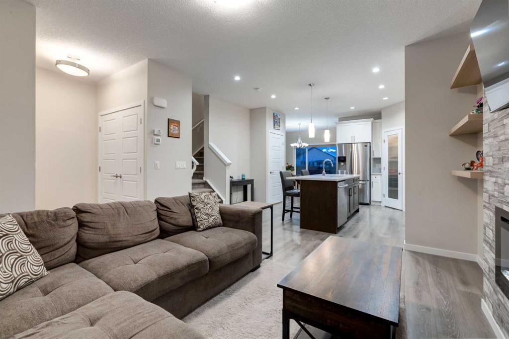 The LIVING ROOM is warm + welcoming, centered around a STYLISH ELECTRIC FIREPLACE w/CUSTOM SHELVING, creating the perfect space to relax, unwind + gather w/family + friends.