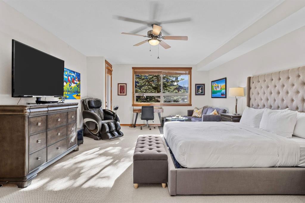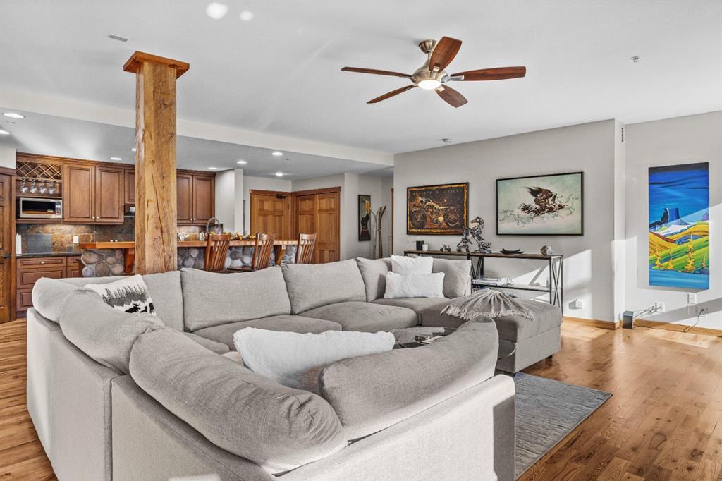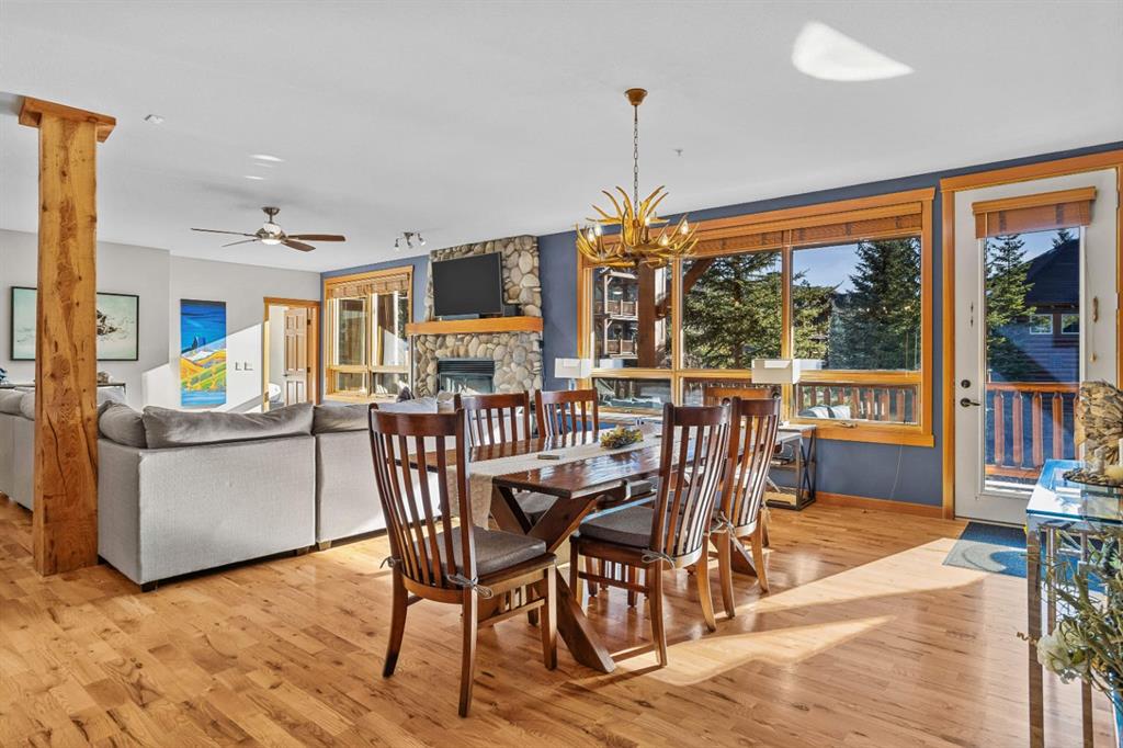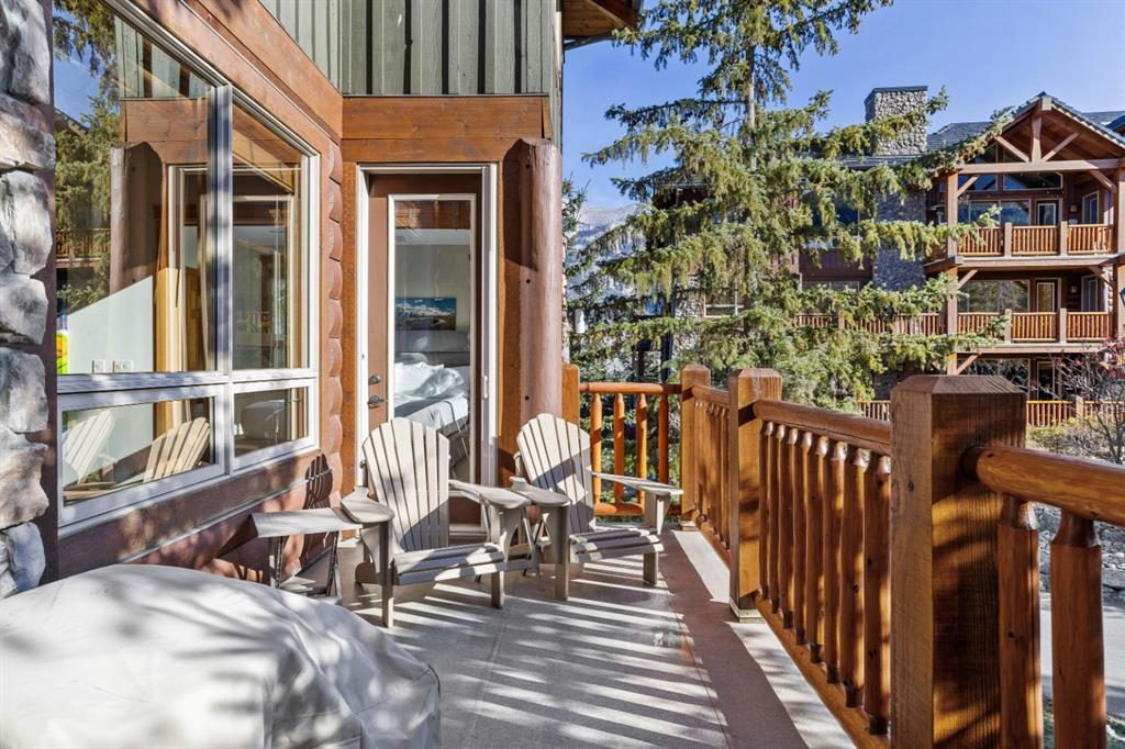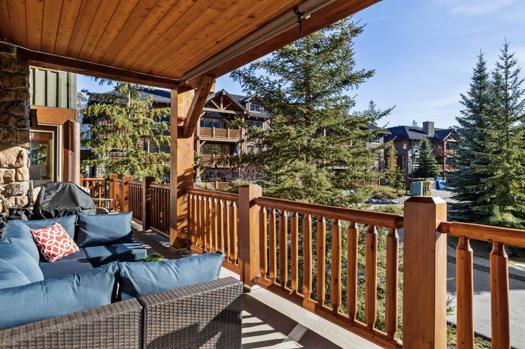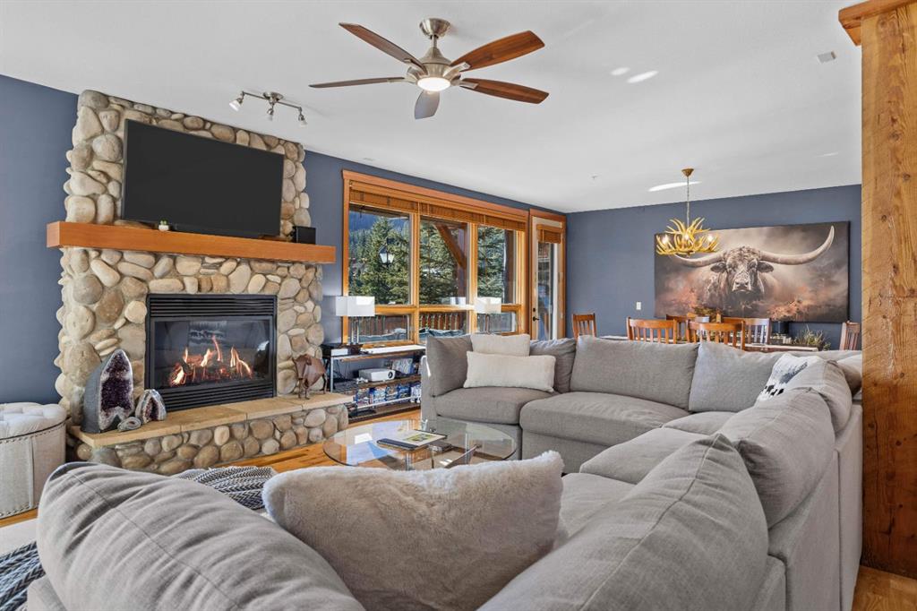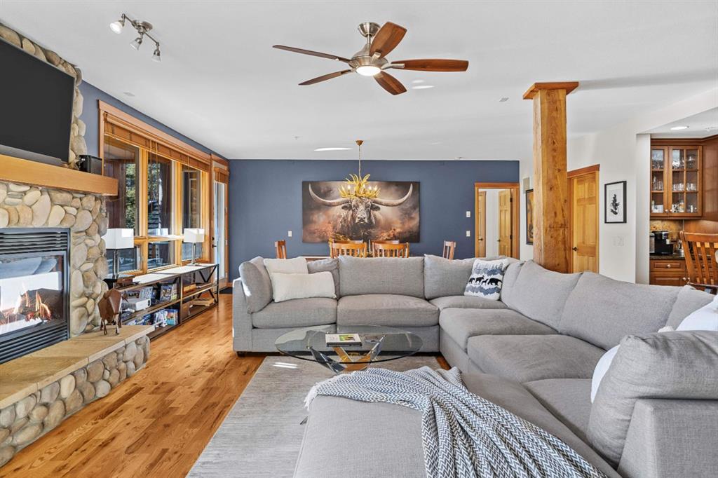 Experience the very best of mountain living at this stunning 3-bedroom, 3-bathroom, single level condo in Trailside Lodges. Spanning over 2000SF, this property offers breathtaking, Southeast-facing mountain views, an abundance of natural light, and a seamless blend of comfort and style. You feel the warmth and spaciousness here from the moment you step inside this beautiful open-concept living area, with floor-to-ceiling stone fireplace and beautiful hardwood flooring. The gourmet kitchen features high-end finishes, generous counter space, and lots of cupboards, ideal for culinary enthusiasts. The primary suite is a fabulous private retreat with space for a lounge area, direct deck access, and a large ensuite with a corner jetted tub, double vanity, spacious shower, water closet and walk-in closet. A second master suite also boasts direct deck access, a walk-in closet, and another elegant ensuite with double vanities. The third bedroom, tucked away for privacy, enjoys its own unique mountain views with a third full bathroom nearby. An oversized laundry room with additional flex space add to the home’s thoughtful design and offer tons of storage room. Enjoy outdoor living year-round on the impressive 35′ x 9′ partially covered deck with a roll-down sunshade, providing a comfortable space to take in the incredible mountain vistas. A number of recent upgrades have been completed, including new appliances, new kitchen sink/faucet, new toilets, & a murphy bed. Ownership at Trailside Lodges includes access to one of the best-outfitted clubhouses in Canmore, with hands down, the best outdoor hot tub with unbelievable panoramic views, an indoor resistance pool, a well-equipped fitness center, billiards & games loft, and a theatre room. Additional conveniences include a heated underground parking stall, storage for all your seasonal gear, and ample guest parking. This home is move-in ready and offers the perfect lock-and-leave lifestyle without compromising space or luxury.