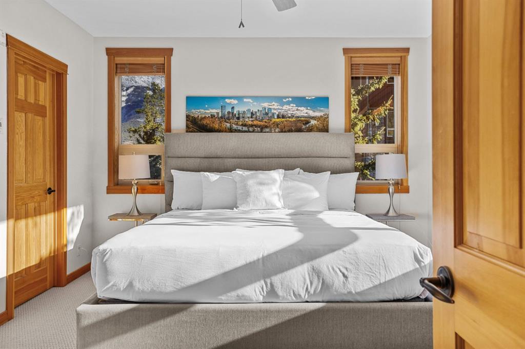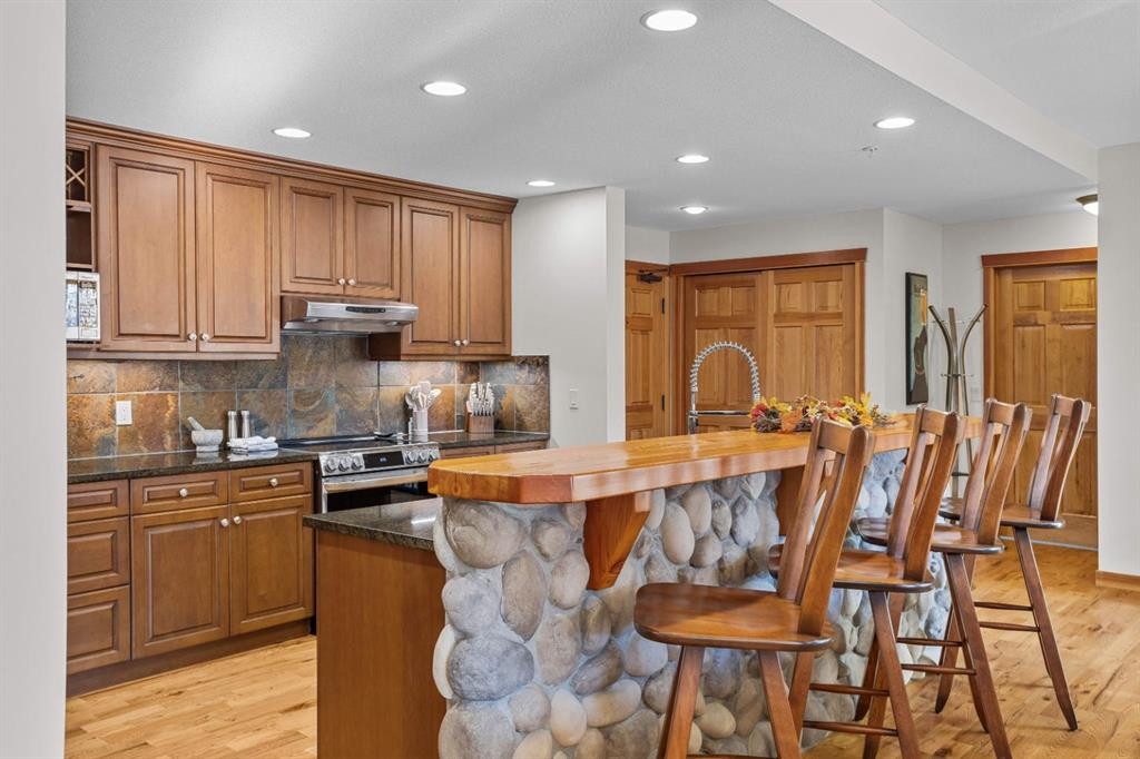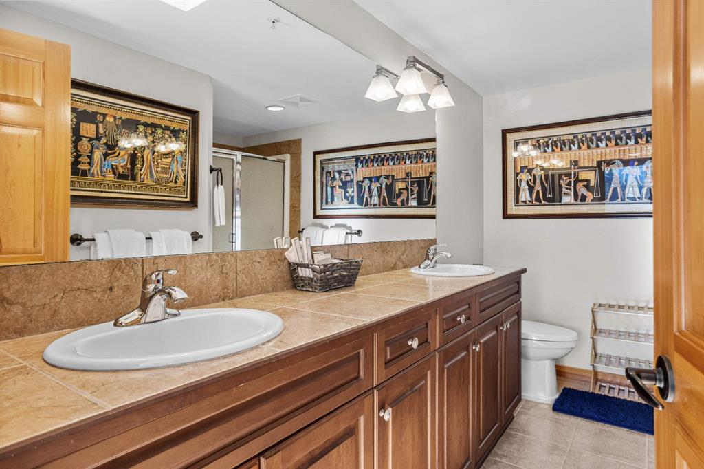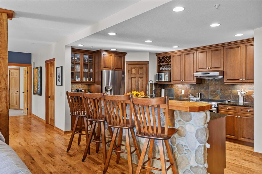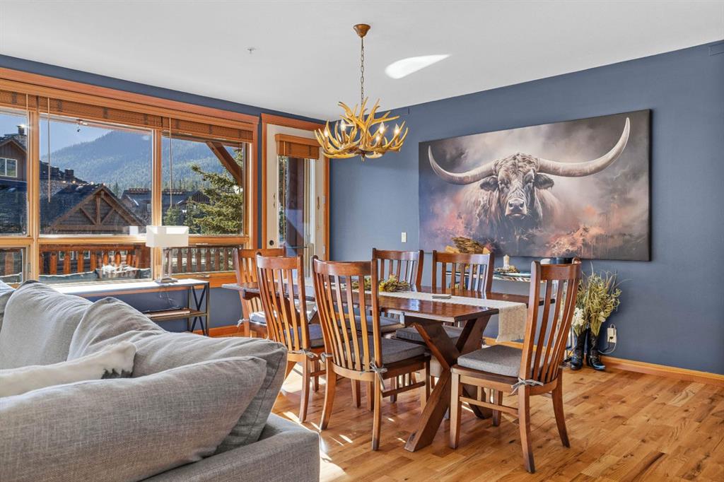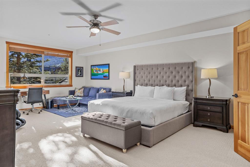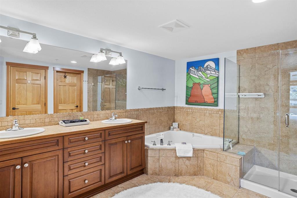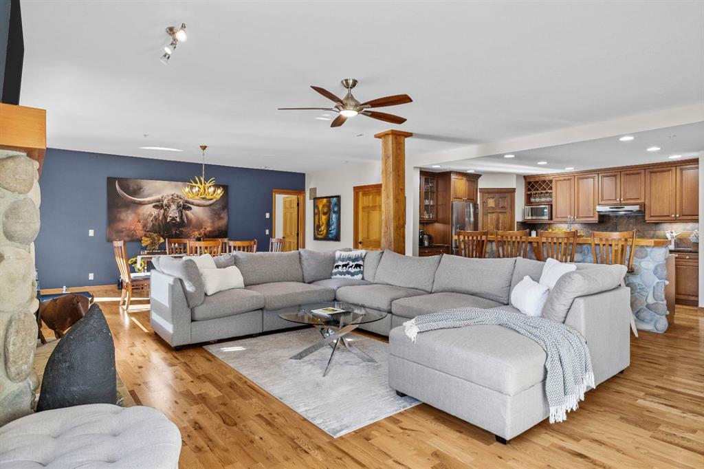 Experience the very best of mountain living at this stunning 3-bedroom, 3-bathroom, single level condo in Trailside Lodges. Spanning over 2000SF, this property offers breathtaking, Southeast-facing mountain views, an abundance of natural light, and a seamless blend of comfort and style. You feel the warmth and spaciousness here from the moment you step inside this beautiful open-concept living area, with floor-to-ceiling stone fireplace and beautiful hardwood flooring. The gourmet kitchen features high-end finishes, generous counter space, and lots of cupboards, ideal for culinary enthusiasts. The primary suite is a fabulous private retreat with space for a lounge area, direct deck access, and a large ensuite with a corner jetted tub, double vanity, spacious shower, water closet and walk-in closet. A second master suite also boasts direct deck access, a walk-in closet, and another elegant ensuite with double vanities. The third bedroom, tucked away for privacy, enjoys its own unique mountain views with a third full bathroom nearby. An oversized laundry room with additional flex space add to the home’s thoughtful design and offer tons of storage room. Enjoy outdoor living year-round on the impressive 35′ x 9′ partially covered deck with a roll-down sunshade, providing a comfortable space to take in the incredible mountain vistas. A number of recent upgrades have been completed, including new appliances, new kitchen sink/faucet, new toilets, & a murphy bed. Ownership at Trailside Lodges includes access to one of the best-outfitted clubhouses in Canmore, with hands down, the best outdoor hot tub with unbelievable panoramic views, an indoor resistance pool, a well-equipped fitness center, billiards & games loft, and a theatre room. Additional conveniences include a heated underground parking stall, storage for all your seasonal gear, and ample guest parking. This home is move-in ready and offers the perfect lock-and-leave lifestyle without compromising space or luxury.