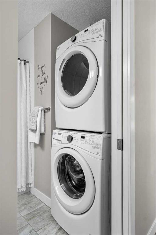 Inside, you’ll find 946 square feet of bright, open-concept living enhanced by vaulted ceilings, oversized windows, and a warm, neutral colour palette. The kitchen is both stylish and functional, featuring white soft-close cabinetry, a full pantry, white quartz countertops, durable luxury vinyl plank flooring, stainless steel appliances, and a generous island ideal for everyday living or casual entertaining.