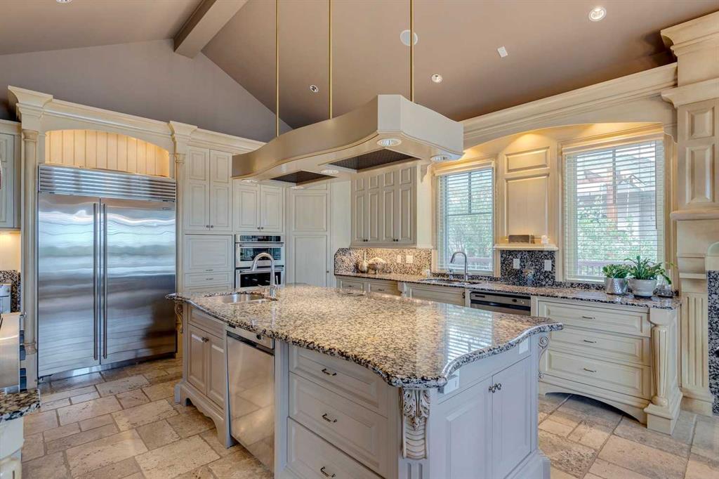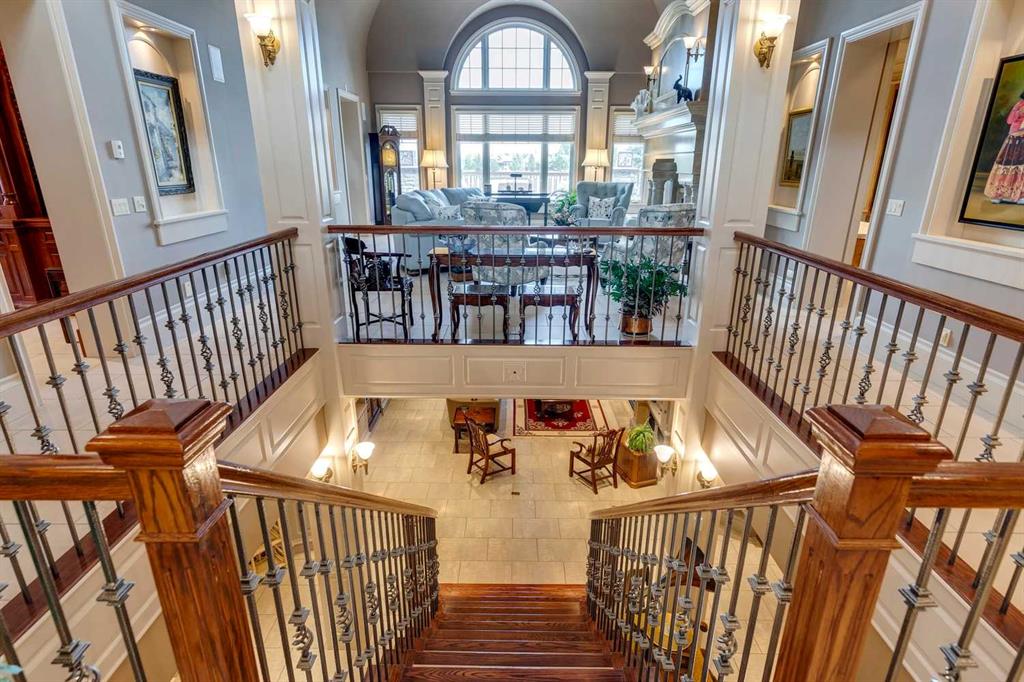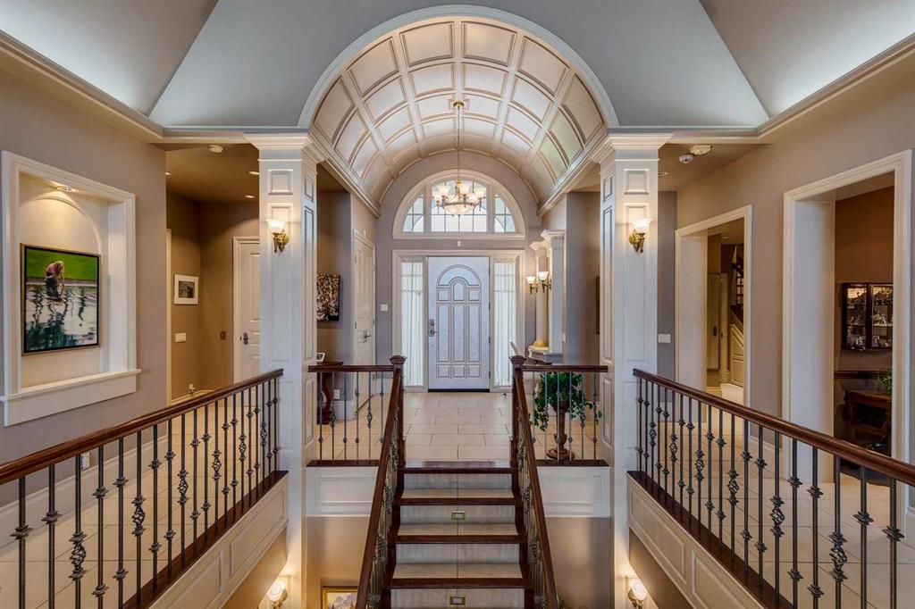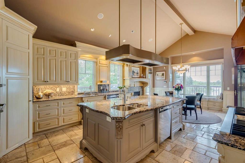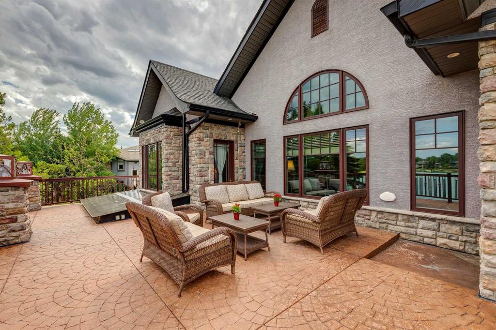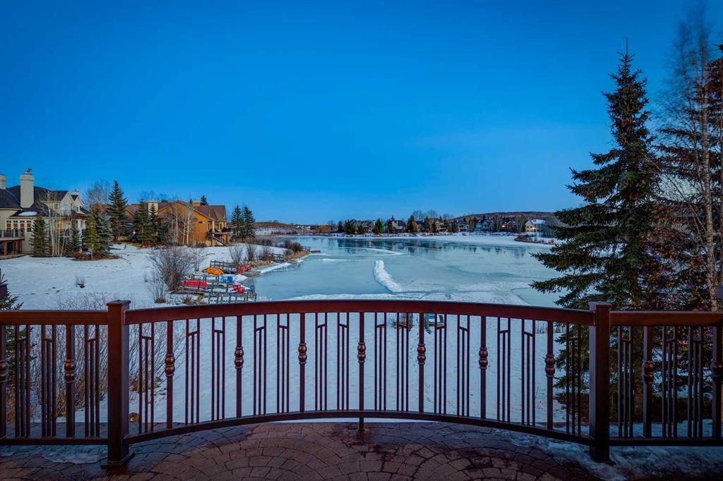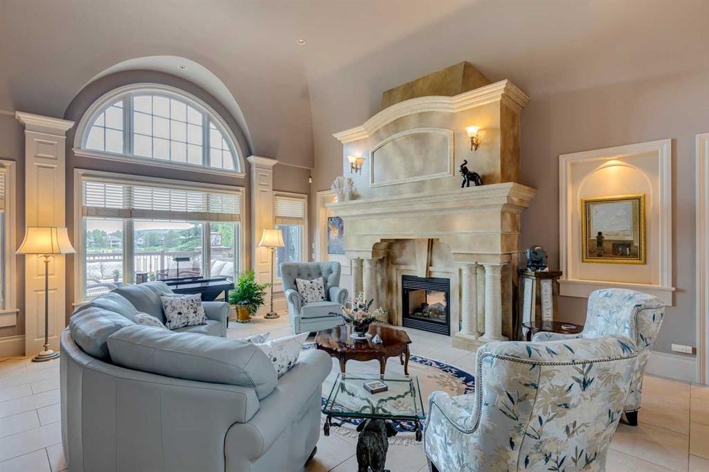 Discover one of the most iconic estate homes offered in prestigious Elbow Valley Estates—an extraordinary custom residence that combines European grandeur, architectural artistry, and exceptional craftsmanship. Perfectly positioned on a private lakefront lot, this executive walkout bungalow offers over 8000 square feet of exquisitely developed living space, designed with precision over years of thoughtful planning and executed by master artisans. From the moment you enter the grand foyer with its coffered and barrel-vaulted ceilings, it’s clear this is a home unlike any other. The main level features a sun-drenched great room with a double-sided fireplace and expansive windows framing unobstructed lake views. The heart of the home is the richly appointed ‘French Manor’ inspired kitchen—equipped for grand-scale entertaining with granite countertops, top-tier appliances including a Sub-Zero refrigerator, gas range with pot filler, two dishwashers, and a walk-in pantry. A cozy breakfast nook with fireplace and access to the expansive upper deck provides the perfect spot for morning coffee overlooking the water (with handicap access). An elegant formal dining room with custom glass cabinetry, a fully paneled library/office with fireplace, and a large laundry/sewing/hobby room complete the main level. A reverse osmosis water system is conveniently located in the craft room. The luxurious primary bedroom is a private sanctuary, featuring a vaulted sleeping area, two-way fireplace, and a spa-inspired circular ensuite with bubbling soaker tub, walk-in shower, dual vanities, and a generous dressing room with built-ins. The master bedroom also offers deck access to enjoy tranquil lake views. A versatile loft functions as a full office or creative workspace, complete with multiple workstations—ideal for today’s remote professional or growing family. The lower level is designed for recreation and relaxation, boasting an authentic English-style pub with a full wet bar, games room, media/theatre room, and three additional spacious bedrooms—each with their own private ensuite and walk-in closet. Three solariums enhance the lower level, offering a fully enclosed hot tub retreat, home gym, and peaceful sitting room, all flooded with natural light. This remarkable residence is equipped with countless thoughtful upgrades, including two newer air conditioning units, newer hot water tank and sump pump, new sinks and hardware in the craft room and kitchen . The property also features a recently serviced irrigation system. Designed for effortless living, this home includes hydronic in-floor heating on all levels, a dramatic central staircase, private elevator, and a heated triple garage. Every detail reflects unparalleled quality and meticulous attention throughout. Outdoor living is equally exceptional, with sweeping views of the lake and beautifully landscaped grounds—an entertainer’s dream and a private oasis.