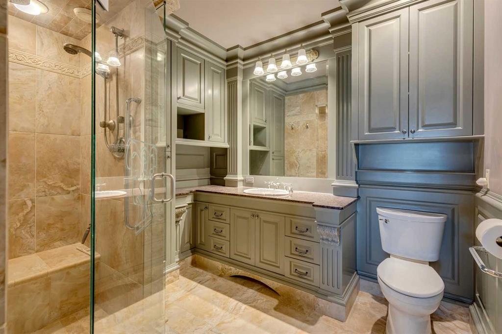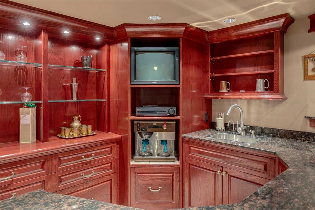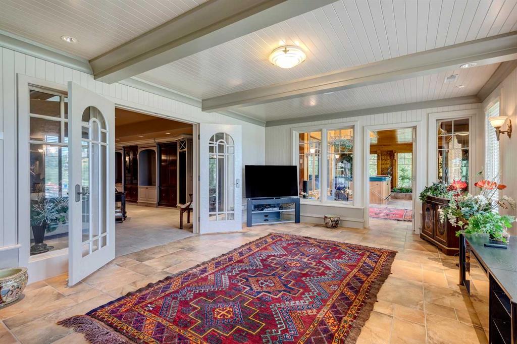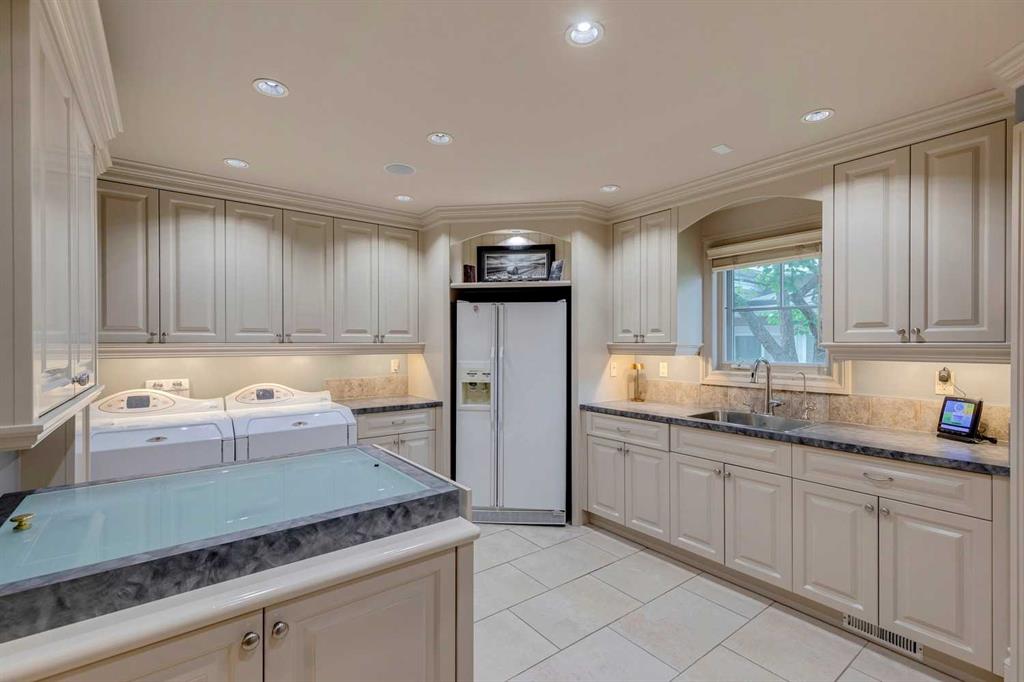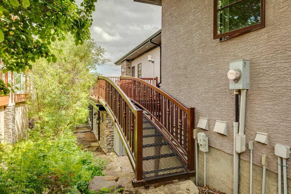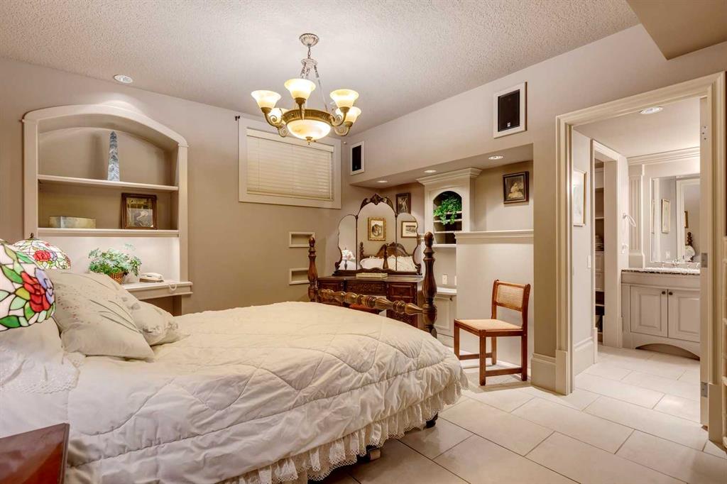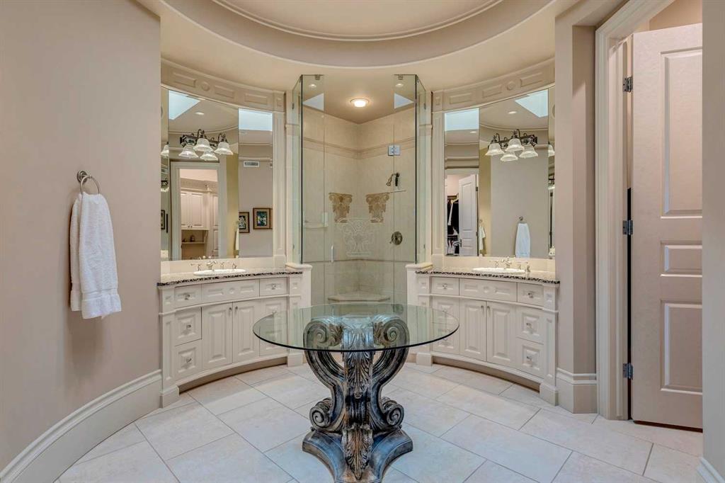 Discover one of the most iconic estate homes offered in prestigious Elbow Valley Estates—an extraordinary custom residence that combines European grandeur, architectural artistry, and exceptional craftsmanship. Perfectly positioned on a private lakefront lot, this executive walkout bungalow offers over 8000 square feet of exquisitely developed living space, designed with precision over years of thoughtful planning and executed by master artisans. From the moment you enter the grand foyer with its coffered and barrel-vaulted ceilings, it’s clear this is a home unlike any other. The main level features a sun-drenched great room with a double-sided fireplace and expansive windows framing unobstructed lake views. The heart of the home is the richly appointed ‘French Manor’ inspired kitchen—equipped for grand-scale entertaining with granite countertops, top-tier appliances including a Sub-Zero refrigerator, gas range with pot filler, two dishwashers, and a walk-in pantry. A cozy breakfast nook with fireplace and access to the expansive upper deck provides the perfect spot for morning coffee overlooking the water (with handicap access). An elegant formal dining room with custom glass cabinetry, a fully paneled library/office with fireplace, and a large laundry/sewing/hobby room complete the main level. A reverse osmosis water system is conveniently located in the craft room. The luxurious primary bedroom is a private sanctuary, featuring a vaulted sleeping area, two-way fireplace, and a spa-inspired circular ensuite with bubbling soaker tub, walk-in shower, dual vanities, and a generous dressing room with built-ins. The master bedroom also offers deck access to enjoy tranquil lake views. A versatile loft functions as a full office or creative workspace, complete with multiple workstations—ideal for today’s remote professional or growing family. The lower level is designed for recreation and relaxation, boasting an authentic English-style pub with a full wet bar, games room, media/theatre room, and three additional spacious bedrooms—each with their own private ensuite and walk-in closet. Three solariums enhance the lower level, offering a fully enclosed hot tub retreat, home gym, and peaceful sitting room, all flooded with natural light. This remarkable residence is equipped with countless thoughtful upgrades, including two newer air conditioning units, newer hot water tank and sump pump, new sinks and hardware in the craft room and kitchen . The property also features a recently serviced irrigation system. Designed for effortless living, this home includes hydronic in-floor heating on all levels, a dramatic central staircase, private elevator, and a heated triple garage. Every detail reflects unparalleled quality and meticulous attention throughout. Outdoor living is equally exceptional, with sweeping views of the lake and beautifully landscaped grounds—an entertainer’s dream and a private oasis.