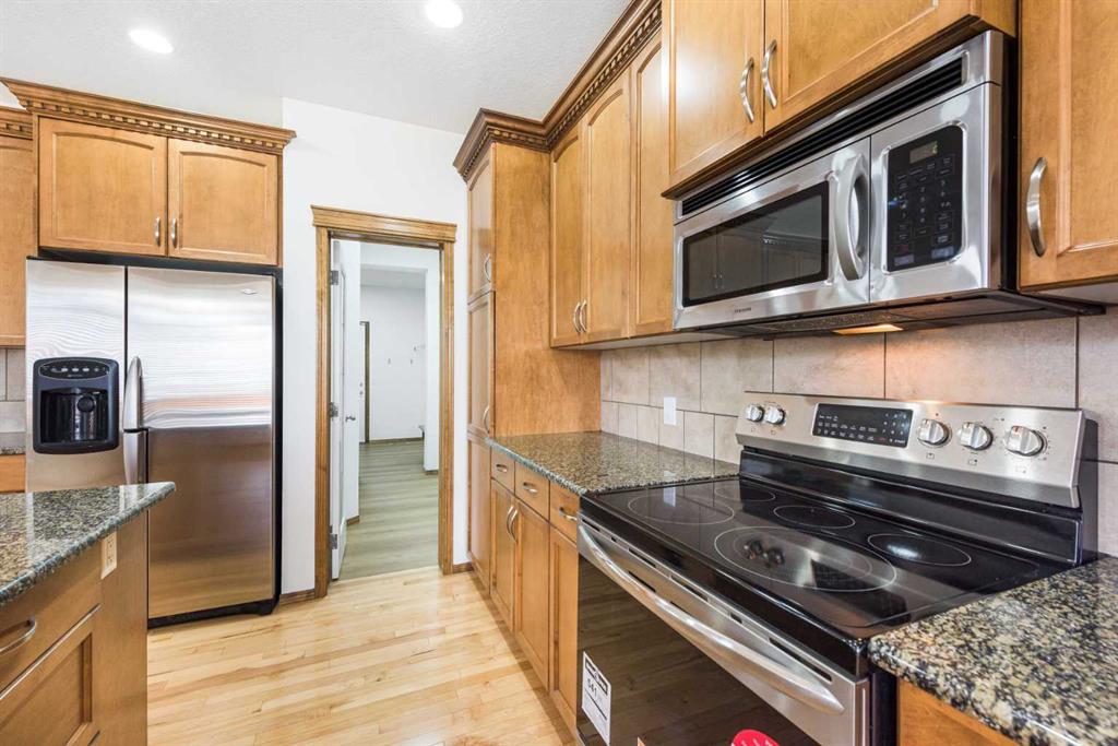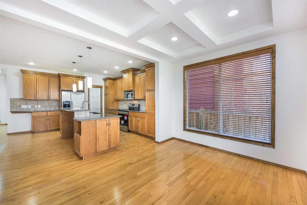 Step inside to a thoughtfully designed layout featuring a versatile den—perfect for a home office or formal dining room. The open-concept main living area offers a cozy gas fireplace, while the kitchen impresses with an extended central island and quality granite countertops. The bright dining area is filled with natural light and opens directly onto a refreshed deck complete with a BBQ gas line—ideal for summer entertaining. The west-facing backyard allows you to enjoy warm afternoon and evening sun.