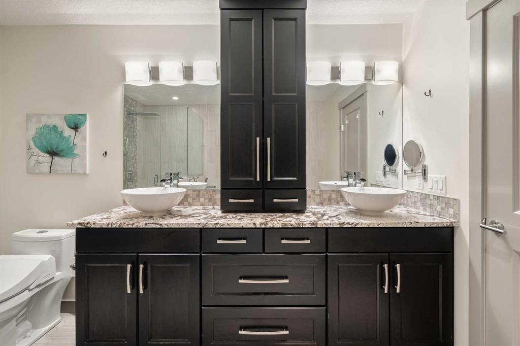 Welcome to a rare offering in Lake Bonavista Estates. Bungalows of this size & quality are exceptionally hard to find, & this extensively renovated home delivers the kind of space, finish, & functionality that seldom comes to market. Set on a quiet street with green space out front, the home feels private, peaceful, & beautifully separated from neighbouring properties. Incredible curb appeal as you walk up to the home that features extensive outdoor lighting. Taken right back to the studs during its renovation, this home has been comprehensively reimagined with contemporary design & quality craftsmanship throughout. Plumbing, electrical, and HVAC were all replaced, insulation was upgraded throughout the house, & central air conditioning was added for year round comfort. The main level offers an open floor plan designed for both everyday living & entertaining, with over 1,800 square feet above grade, a rare size for a bungalow in this community. A generous front entry with raised ceiling creates an impressive first impression, while the open staircase to the basement adds architectural presence & a sense of connection between levels. The kitchen is a true centrepiece, featuring a large island, extensive cabinet storage, a gas cooktop, and built-in oven. Main floor laundry adds everyday convenience. This layout is especially well- suited for families or couples seeking the ease of one level living without sacrificing space. The main floor includes 2 bedrooms plus an office, with the second bedroom equipped with a built-in Murphy bed for added flexibility. The primary bedroom overlooks the west facing backyard and includes a beautiful 5-piece ensuite with dual sinks, vanity tower, freestanding tub, & walk-in shower. The sunny west backyard has been thoughtfully designed, complete with a motorized louvered roof over the stamped concrete patio & elegant outdoor lighting. Car enthusiasts & hobbyists will appreciate the heated front double garage with Tesla EV charger, along with the insulated rear garage that is roughed in for a gas heater. The fully developed basement continues the home’s impressive scale & versatility, offering 2 large bedrooms, a third full bath, a media room, a wine bar with dedicated wine storage room, loads of storage & a separate hobby/games/play room. Located just moments from Fish Creek Provincial Park, one of North America’s largest urban parks, residents enjoy exceptional access to walking and biking pathways, natural landscapes, and year round recreation. Lake Bonavista Estates is one of Calgary’s premier & most desirable lake community, known for its mature setting, strong sense of community, & outstanding access to schools, shopping, recreation, & the lake itself. What a great opportunity for a renovated home that is very tough to find in Lake Bonavista Estates.