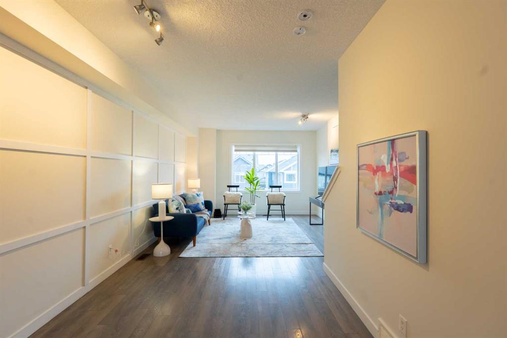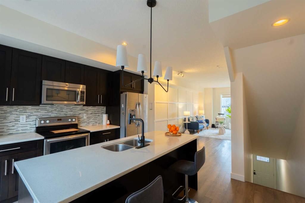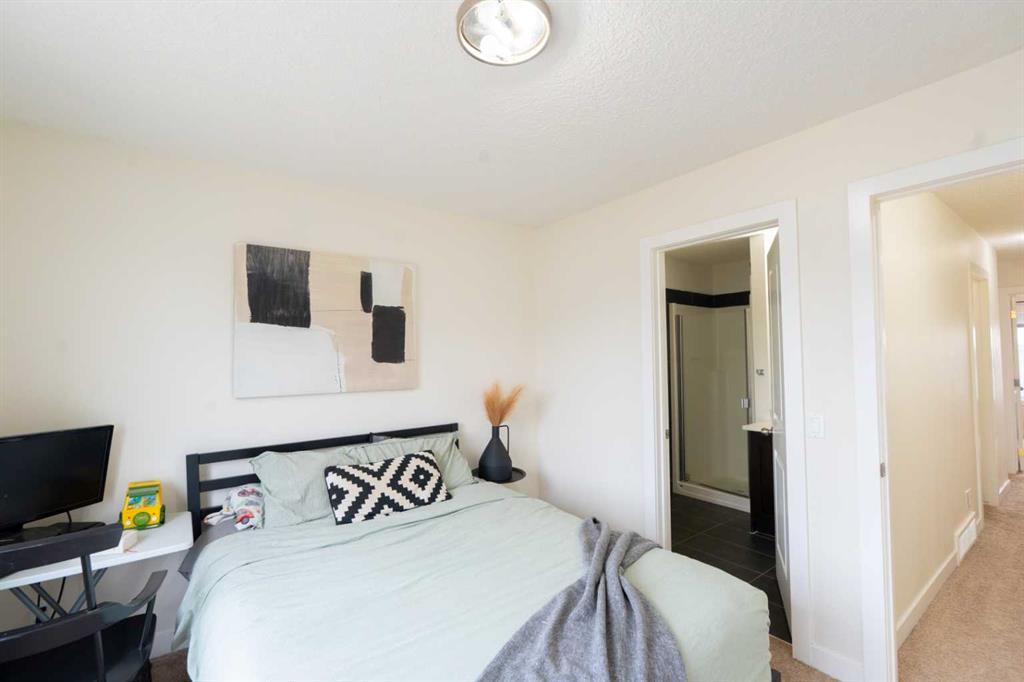 Bright, Stylish & Functional – The Perfect Family Layout From the moment you enter, this home offers thoughtful design and everyday practicality. The ground-level entry near the garage opens into a dedicated office workspace complete with built-in desk and shelving — ideal for working from home or managing busy family life. The foyer includes a spacious closet, convenient 2-piece bathroom, and direct access to the garage, where the furnace and mechanical room are neatly tucked away. Upstairs, carpeted stairs lead to a stunning main living area filled with natural light. Expansive, nearly full-width windows flood the space, highlighting the beautiful accent wall that adds warmth and character to both the living and dining areas. The open-concept design creates an inviting atmosphere perfect for entertaining or relaxing. The kitchen is both elegant and functional, featuring rich dark wood cabinetry that contrasts beautifully with crisp white quartz countertops and a central island. Stainless steel appliances complete the modern look, while sliding patio doors open onto a spacious balcony — perfect for morning coffee, evening BBQs, or gathering with family and friends. The upper level offers three generously sized bedrooms, including a comfortable primary retreat with its own 3-piece ensuite and double closets for ample storage. A convenient upper-floor laundry room with stackable washer and dryer makes daily living easier and more efficient. Outside, the fenced front yard feels like a private oasis. Low-maintenance landscaping, mature trees, and lush greenery provide exceptional privacy and a peaceful setting to unwind. Location adds even more value — with two schools nearby (including a French immersion option and an elementary school), a playground just steps away, and only 8 minutes to Walmart and the main shopping market for all your daily essentials. This home combines style, smart layout, unbeatable convenience, and low-maintenance living — a fantastic opportunity for families, professionals, or first-time buyers alike. Book your private showing today.