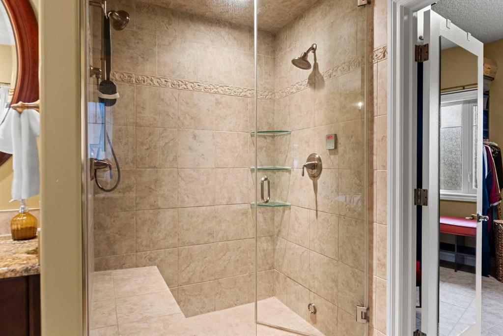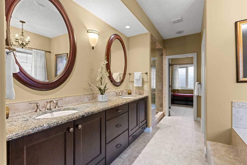The primary suite features French doors, a tray ceiling, large windows, and deck access. The spa-inspired ensuite includes heated floors, raised dual vanities, comfort-height toilet, air-jetted soaker tub, steam shower, and a walk-in closet with built-ins and a venting window.