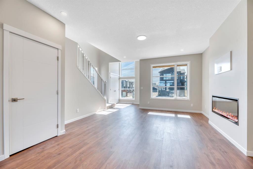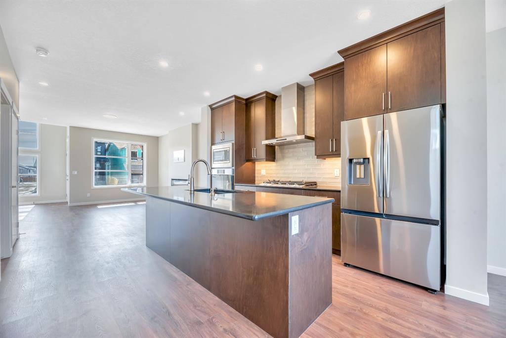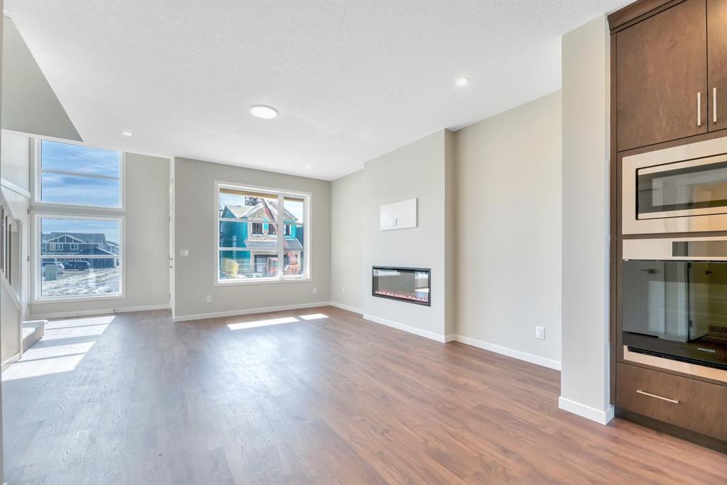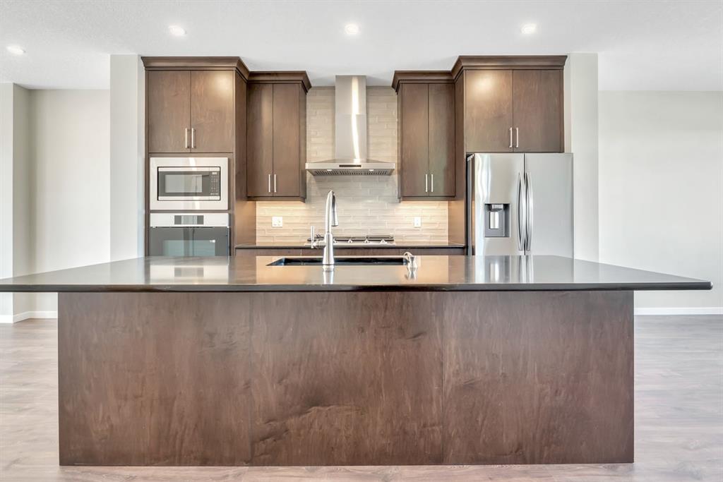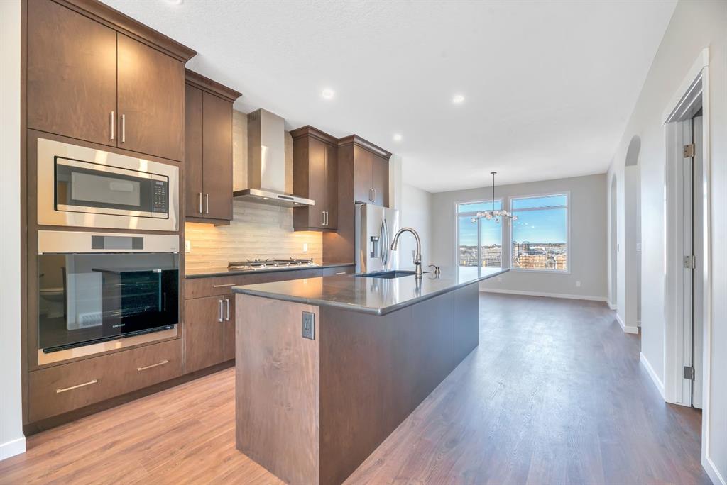 Step inside to a bright, open-concept main floor where walnut-toned luxury vinyl plank flooring flows seamlessly throughout. The spacious great room is anchored by a sleek electric fireplace, creating a warm and inviting atmosphere. At the heart of the home, the stunning central kitchen is designed to impress with a large island, upgraded quartz countertops, tile backsplash, flat-panel wood grain cabinetry, and premium appliance package including a 5-burner gas cooktop, built-in wall oven, and microwave. Thoughtful upgrades such as under-cabinet lighting, pots and pan drawers, and garburator enhance both style and functionality.